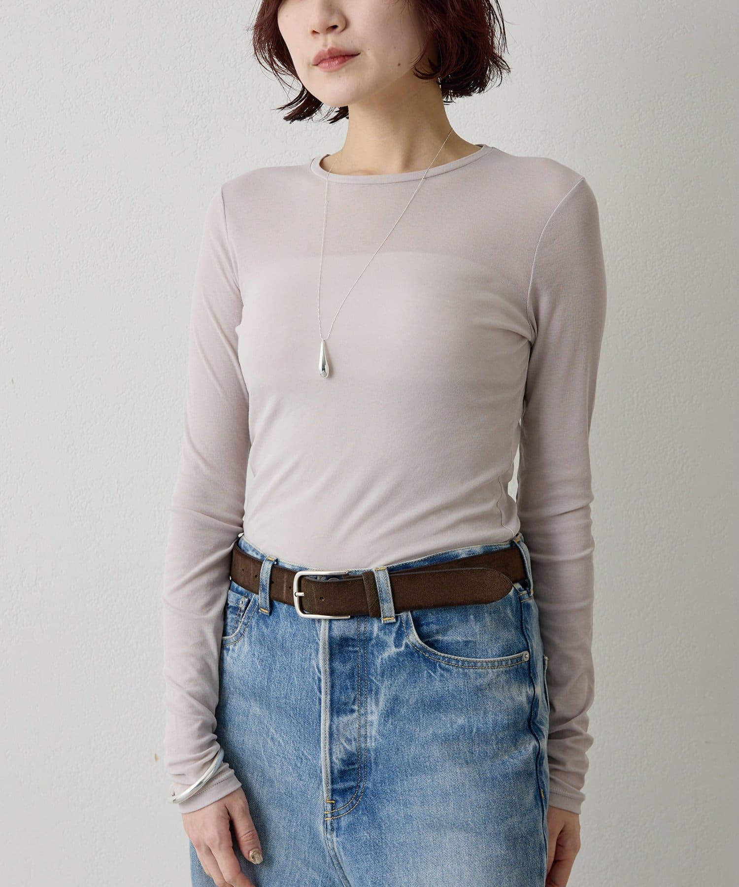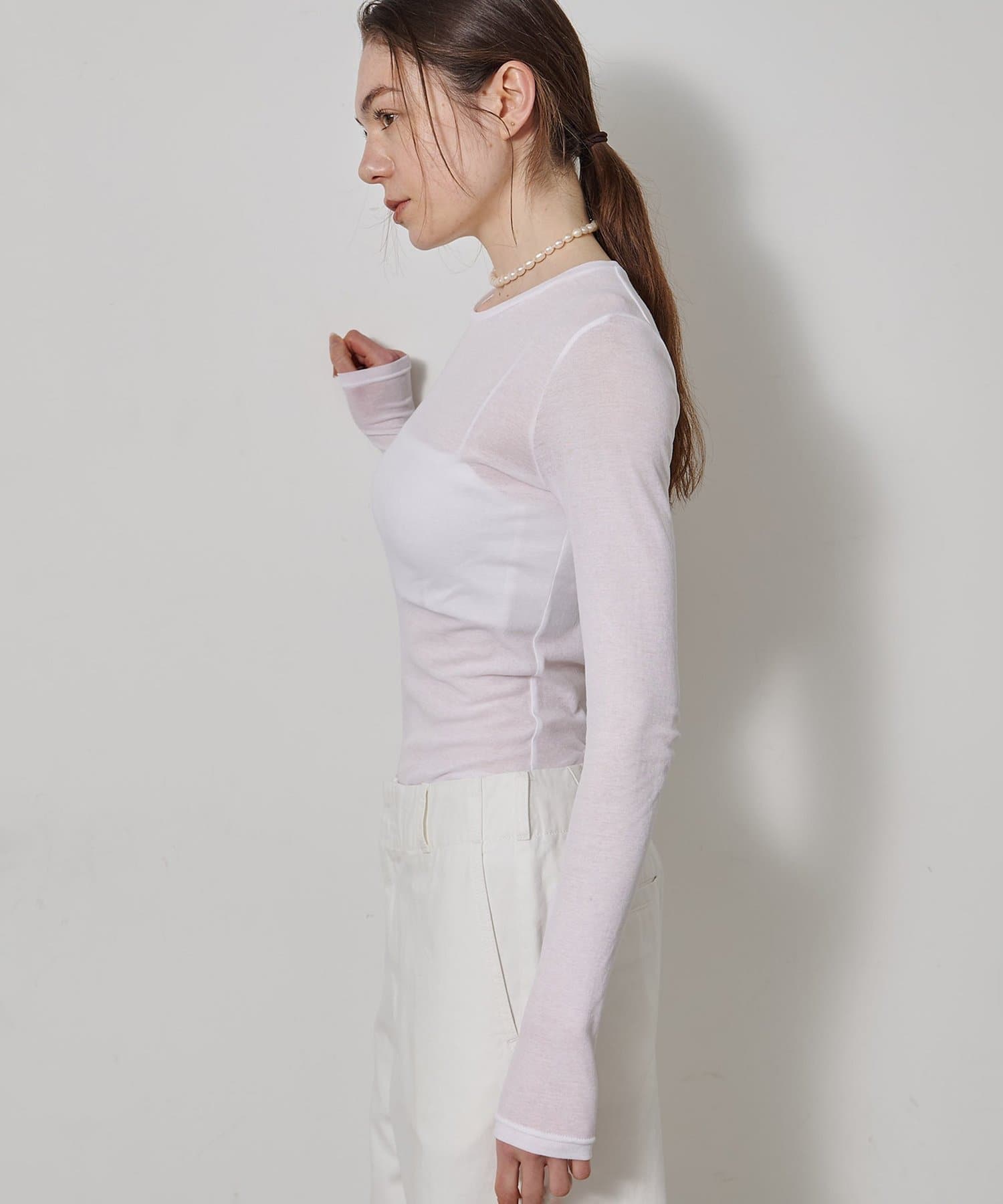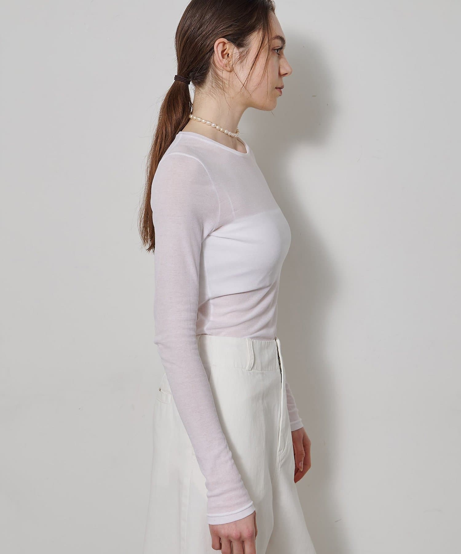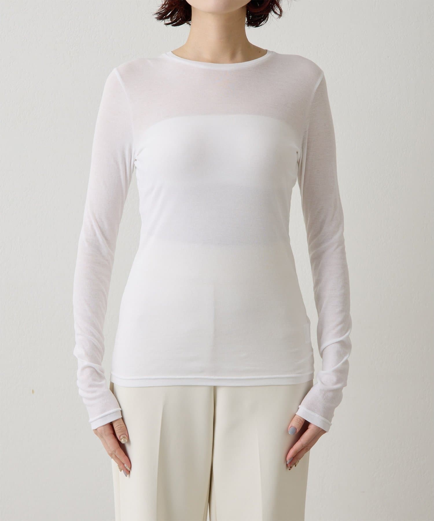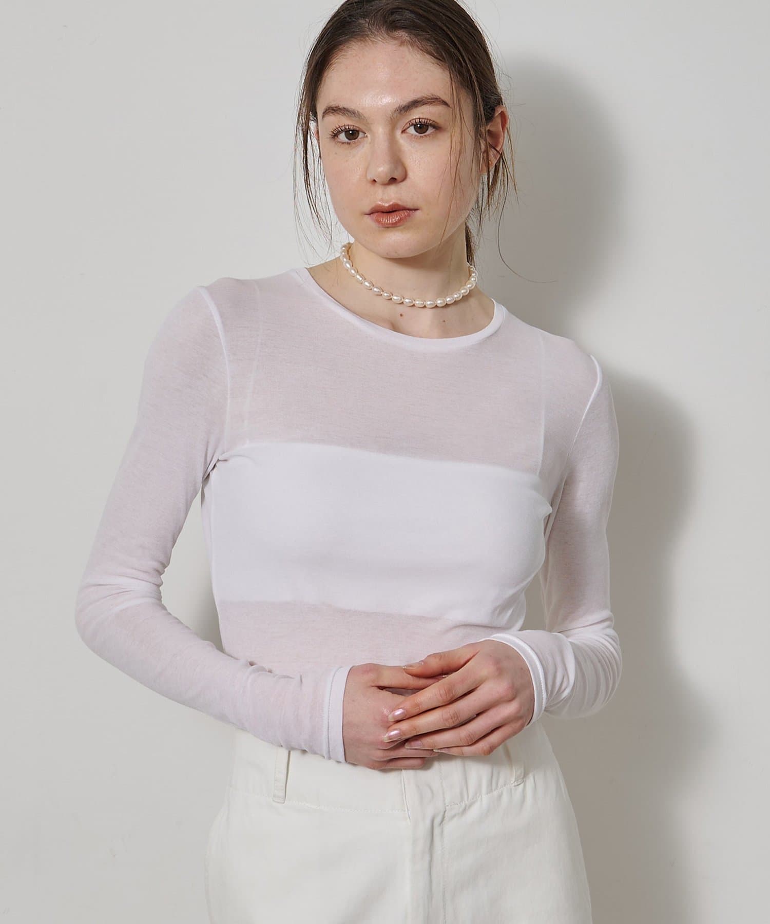 ■程よいシアー感と華奢なクルーネックがレイヤードを邪魔せず、女性らしい抜け感を演出。