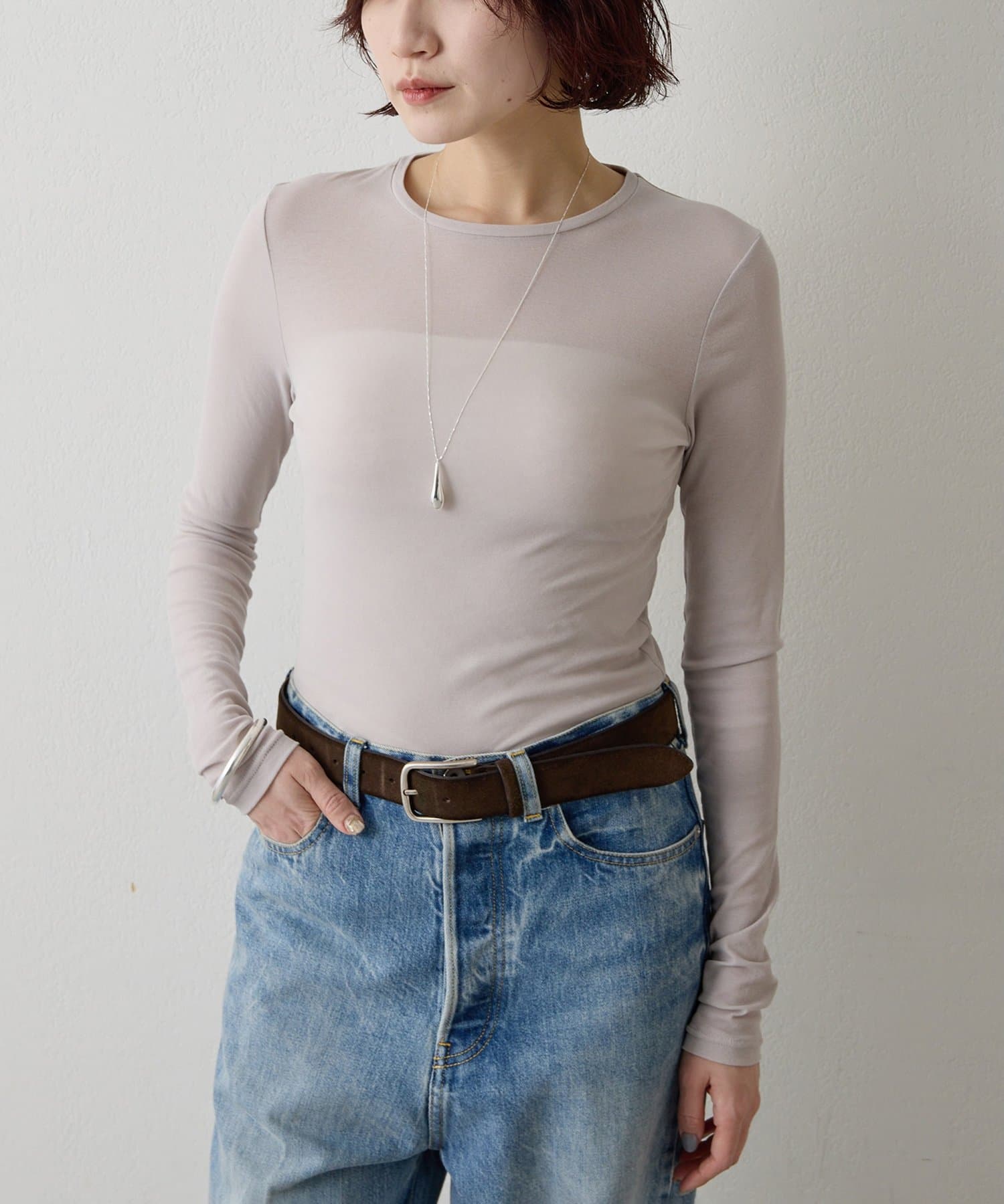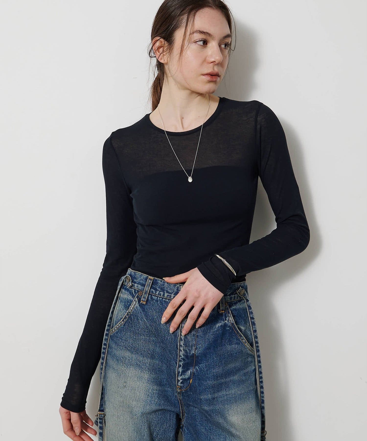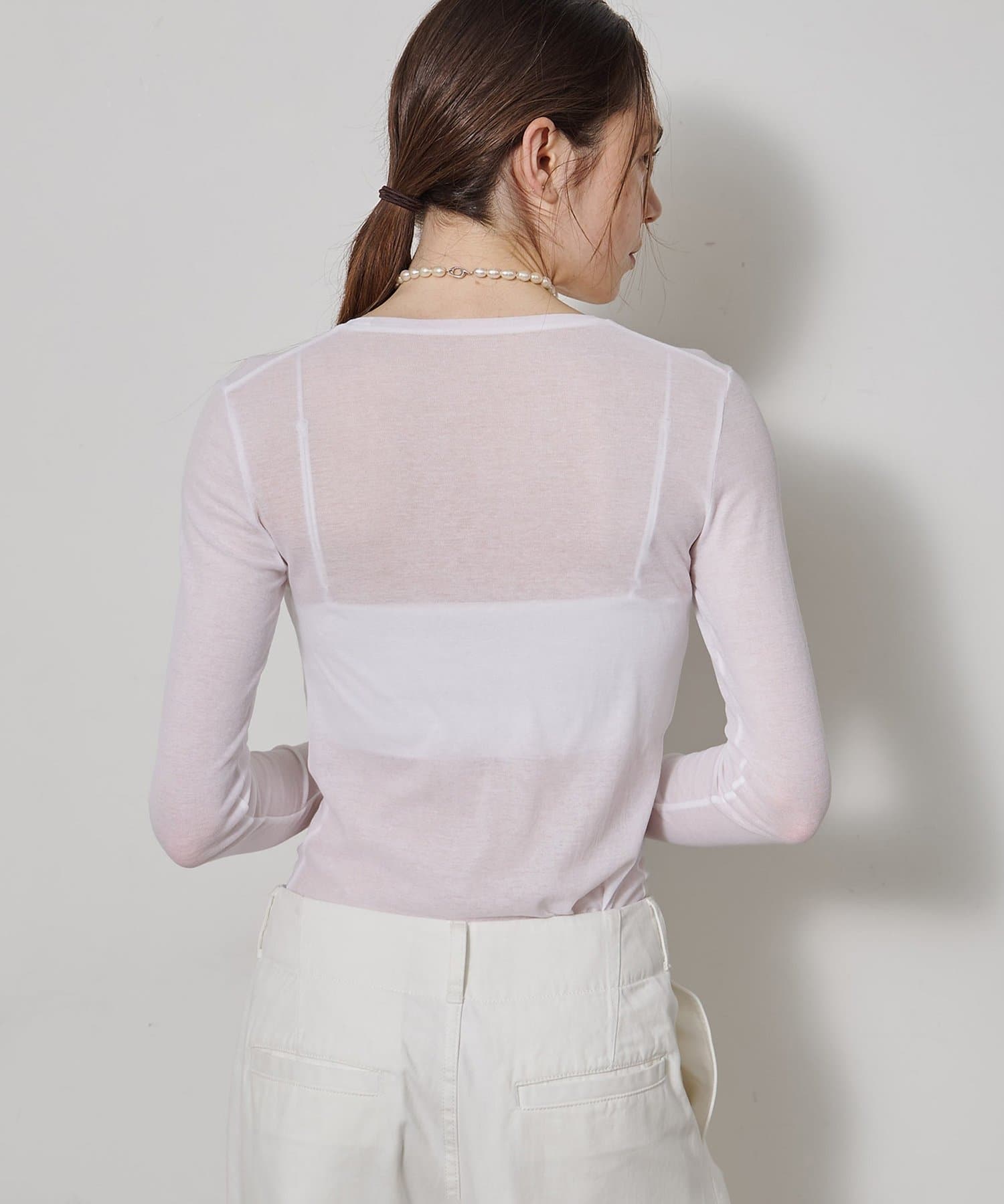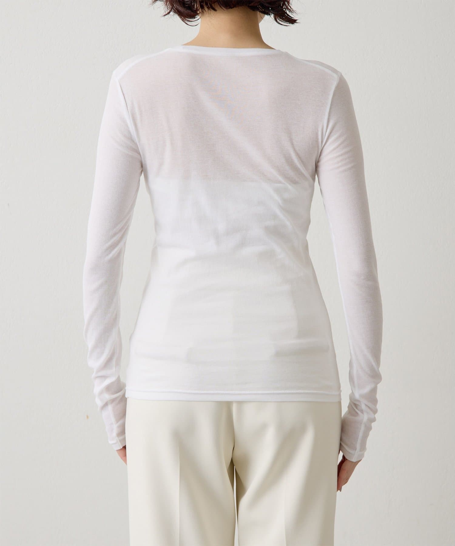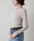 ■程よいシアー感と華奢なクルーネックがレイヤードを邪魔せず、女性らしい抜け感を演出。