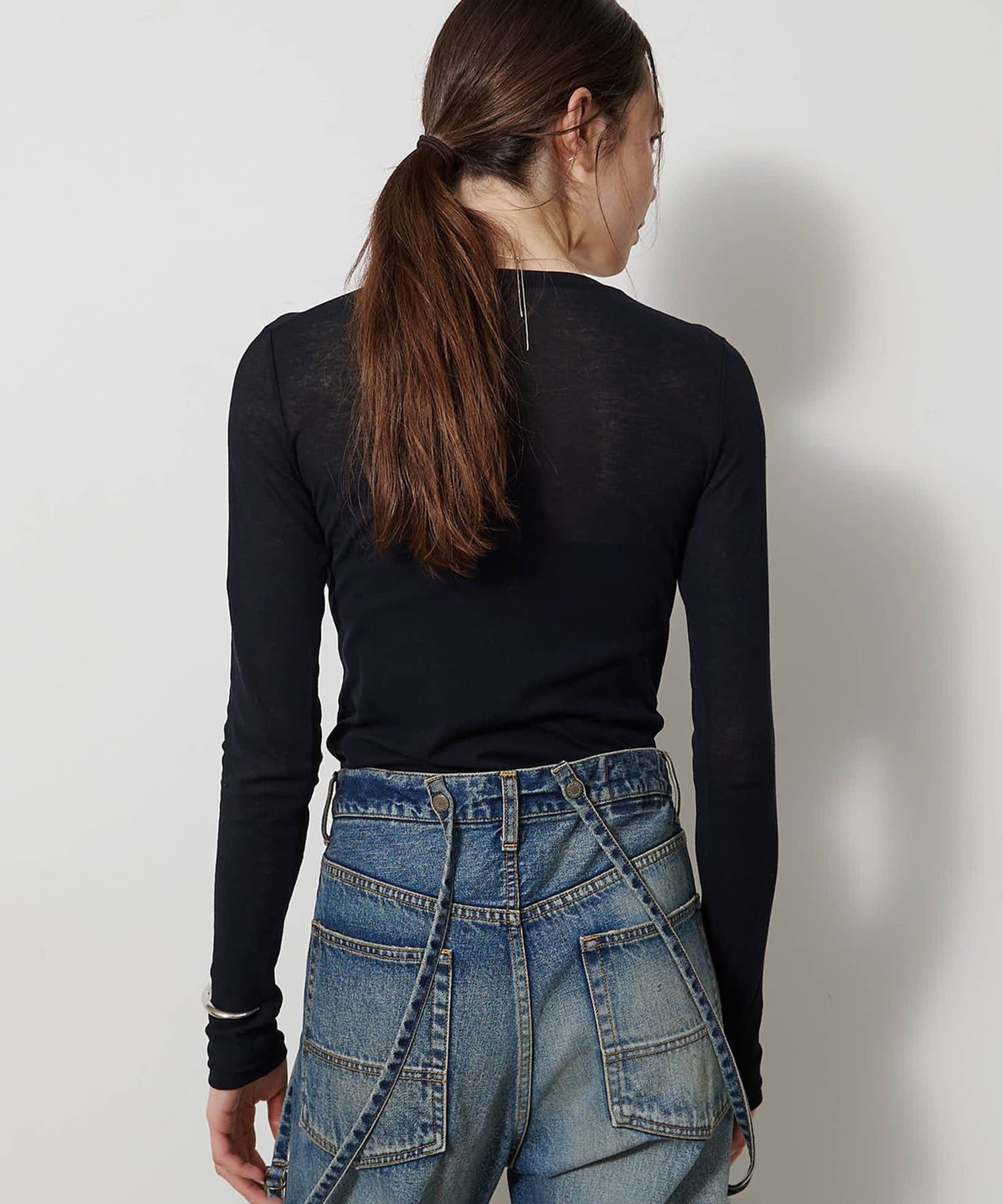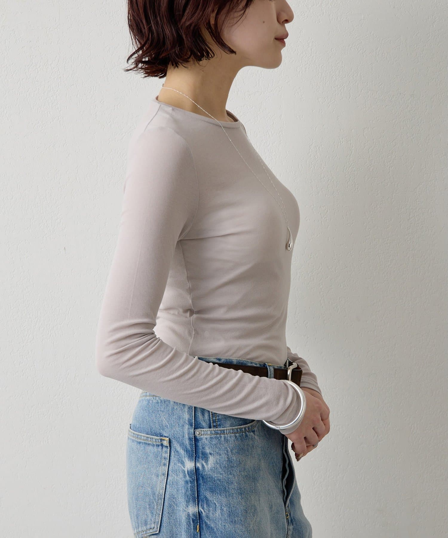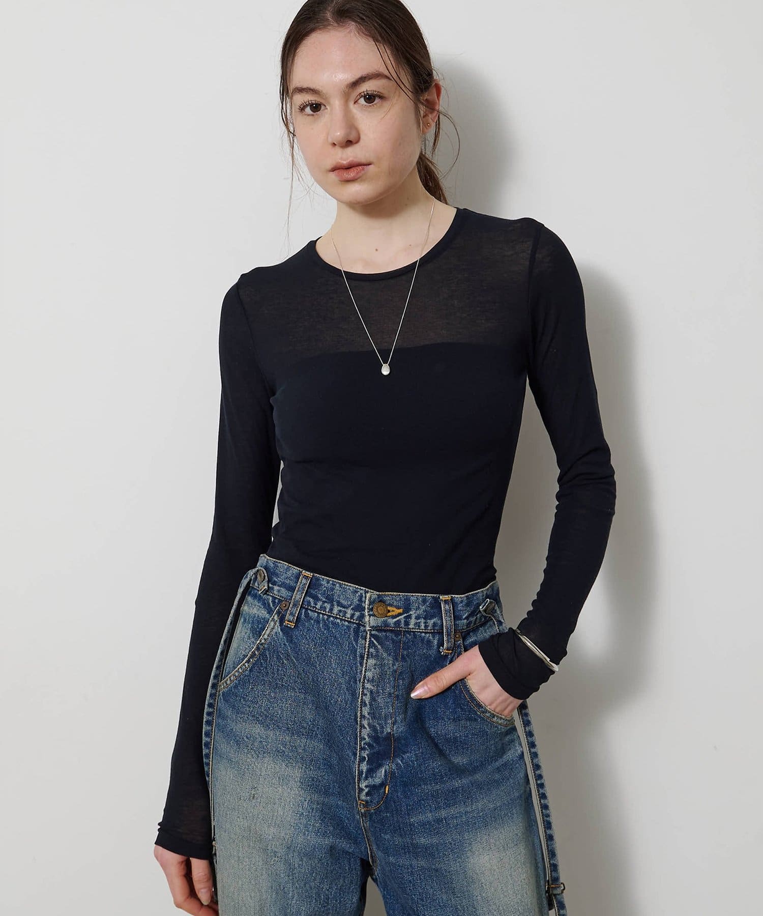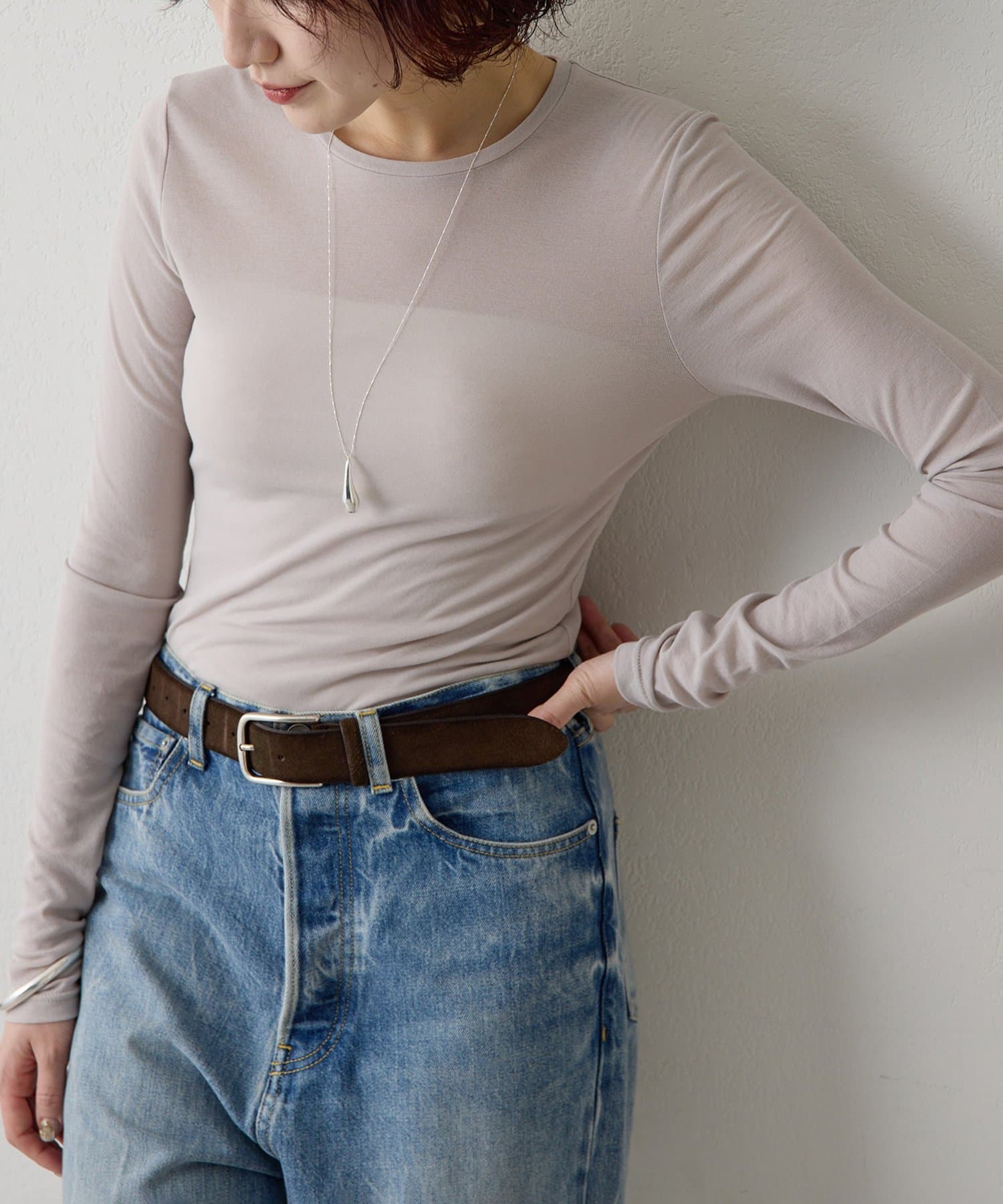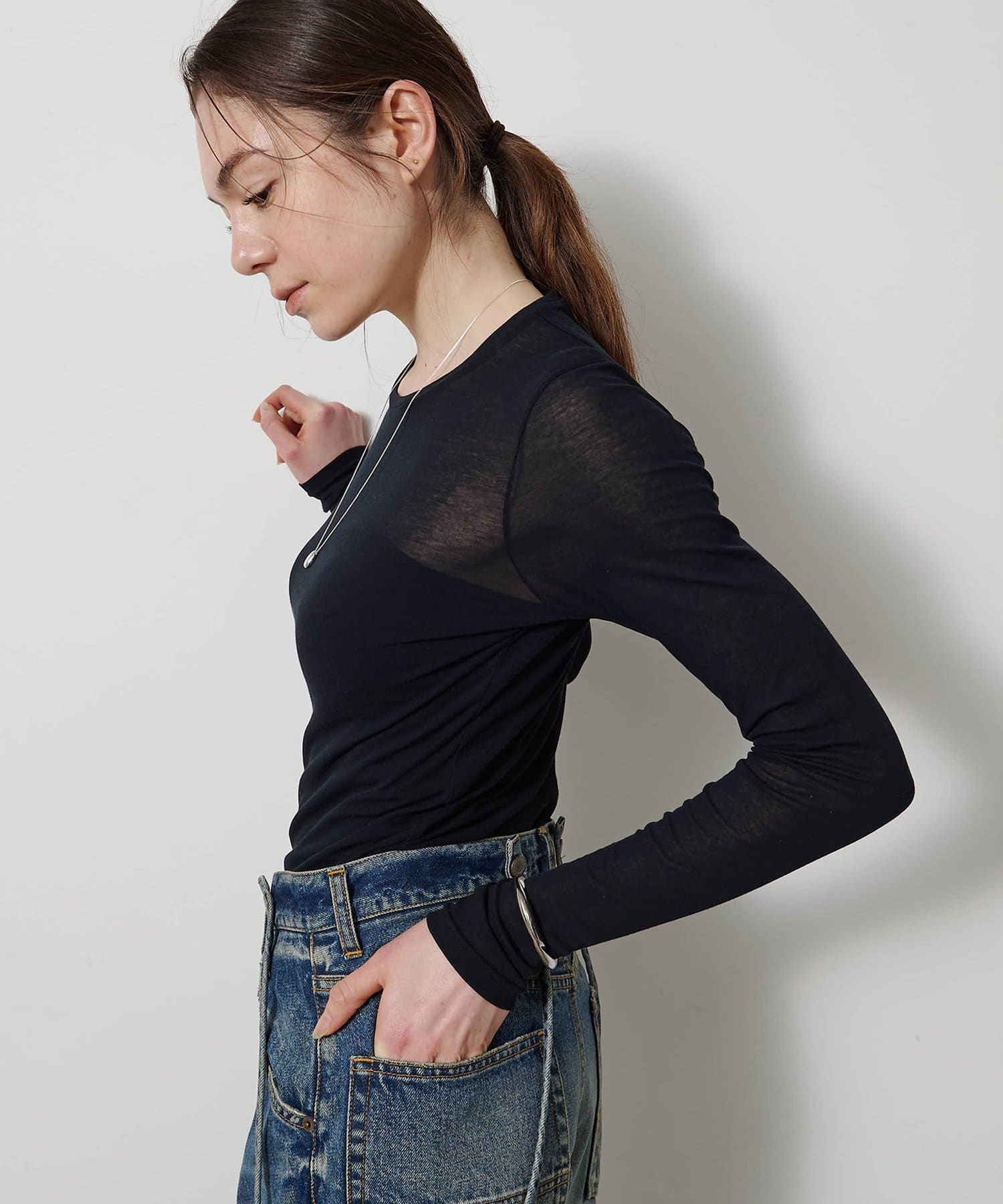 ■程よいシアー感と華奢なクルーネックがレイヤードを邪魔せず、女性らしい抜け感を演出。