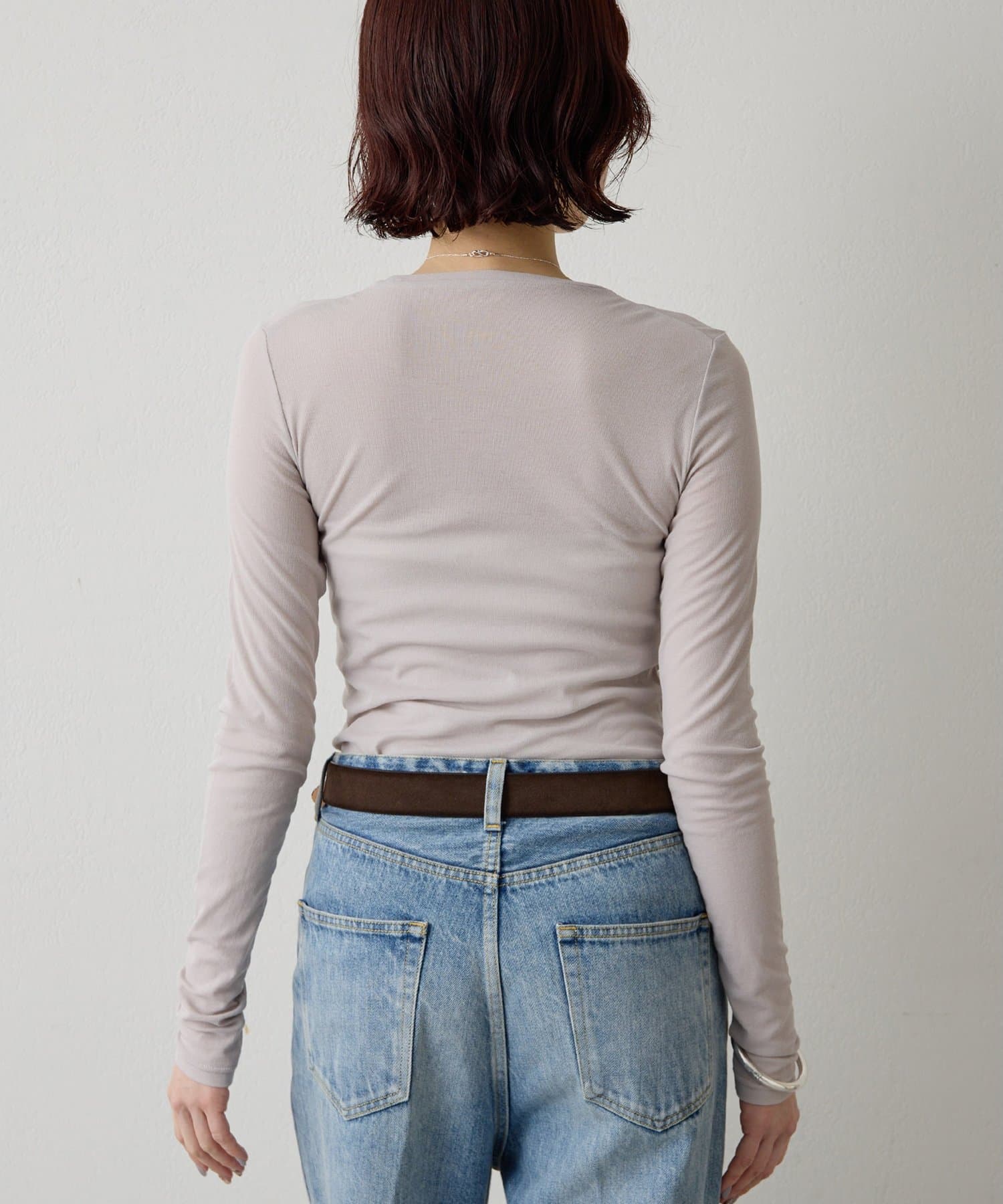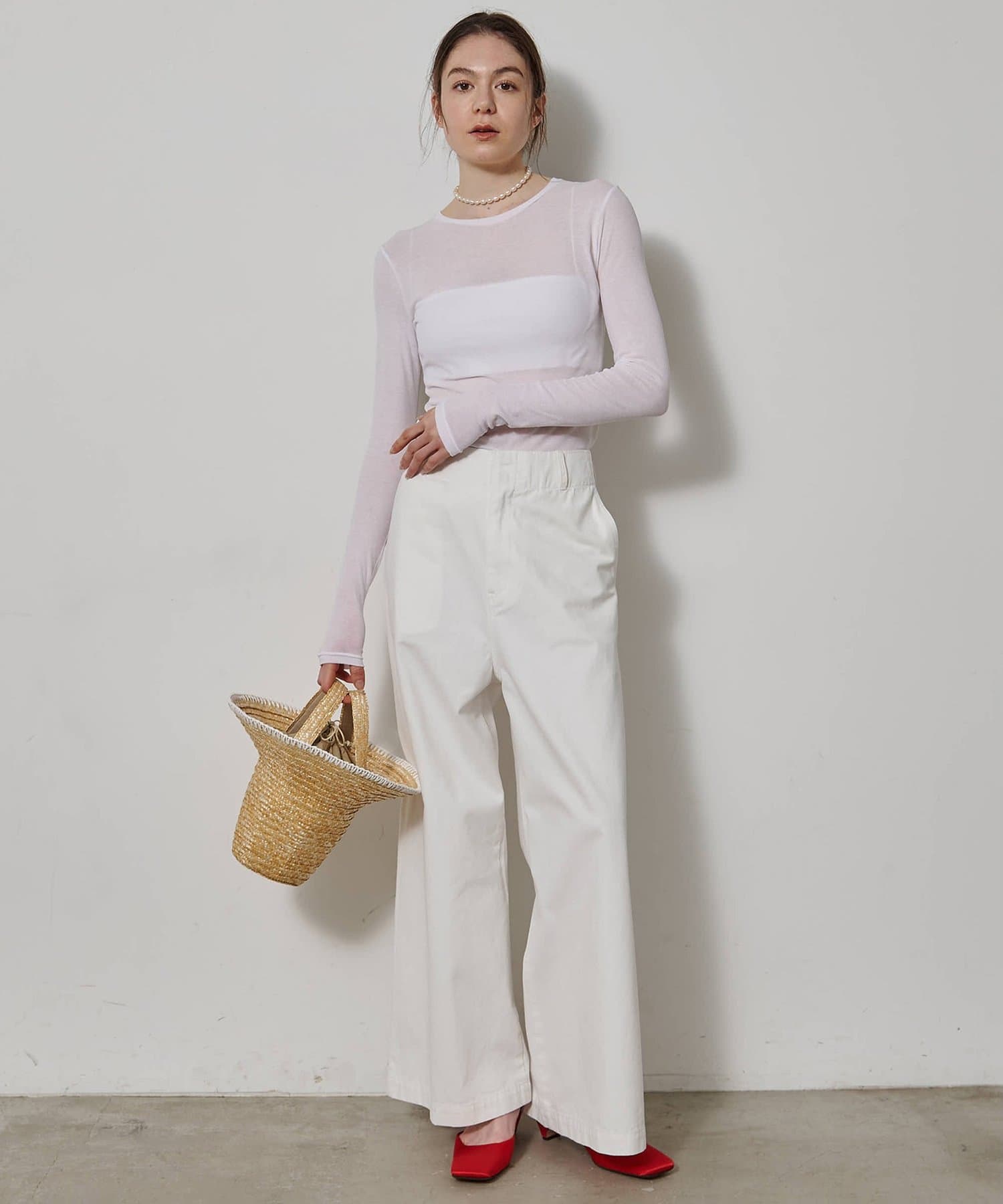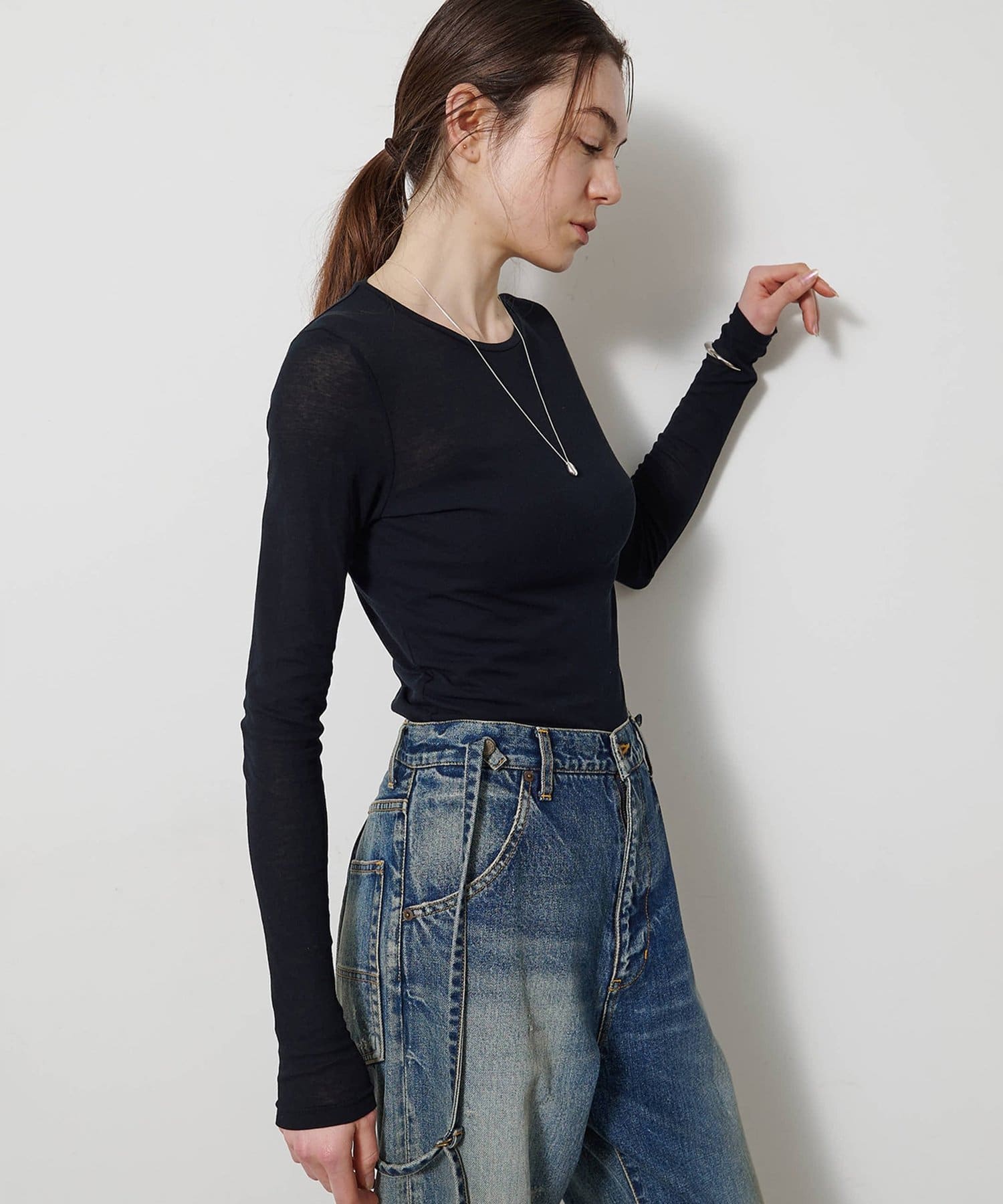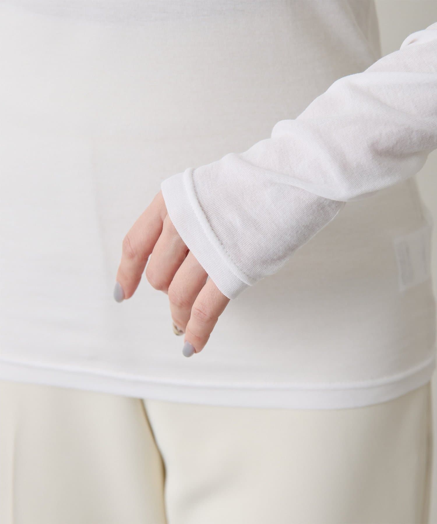 ■程よいシアー感と華奢なクルーネックがレイヤードを邪魔せず、女性らしい抜け感を演出。