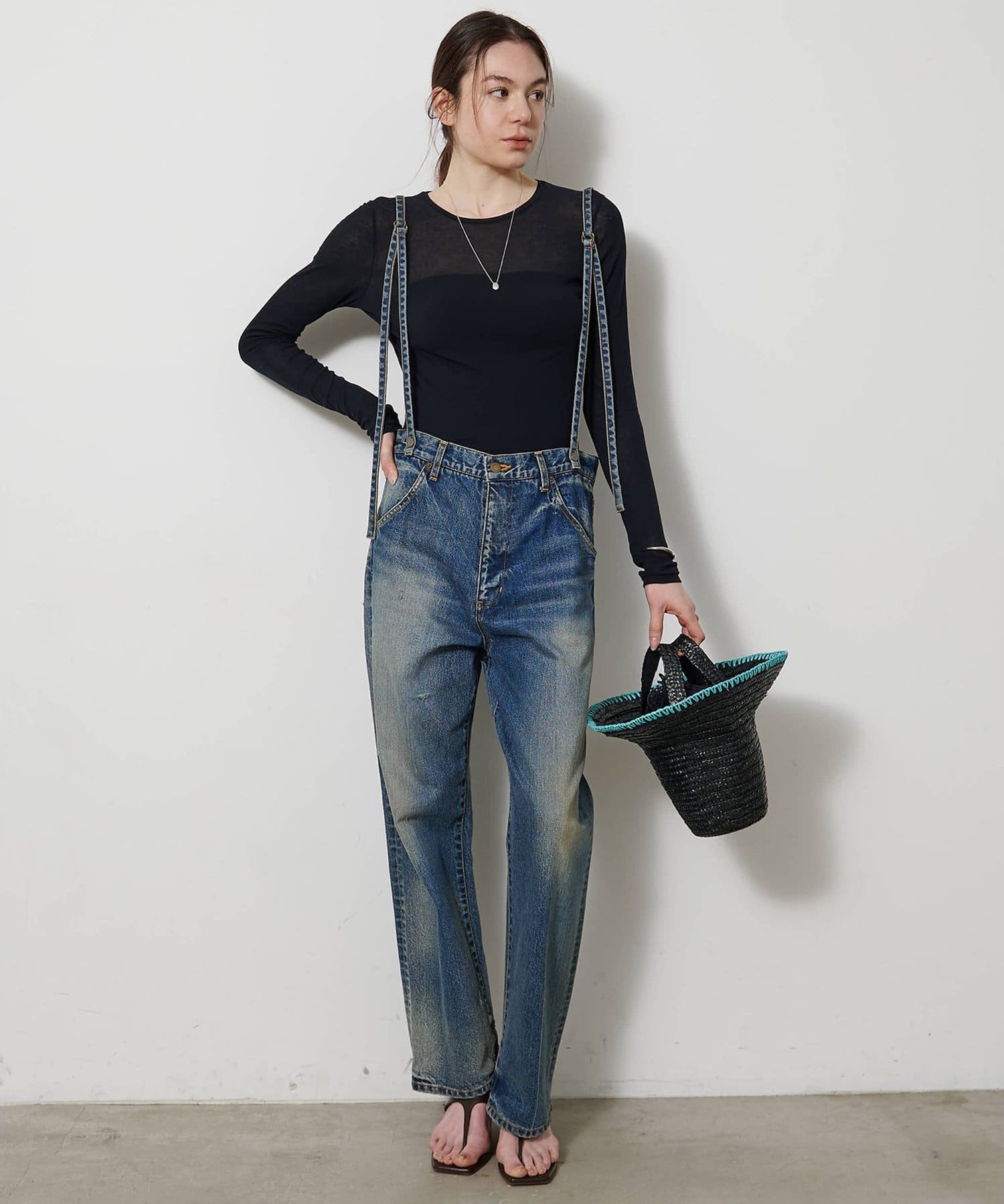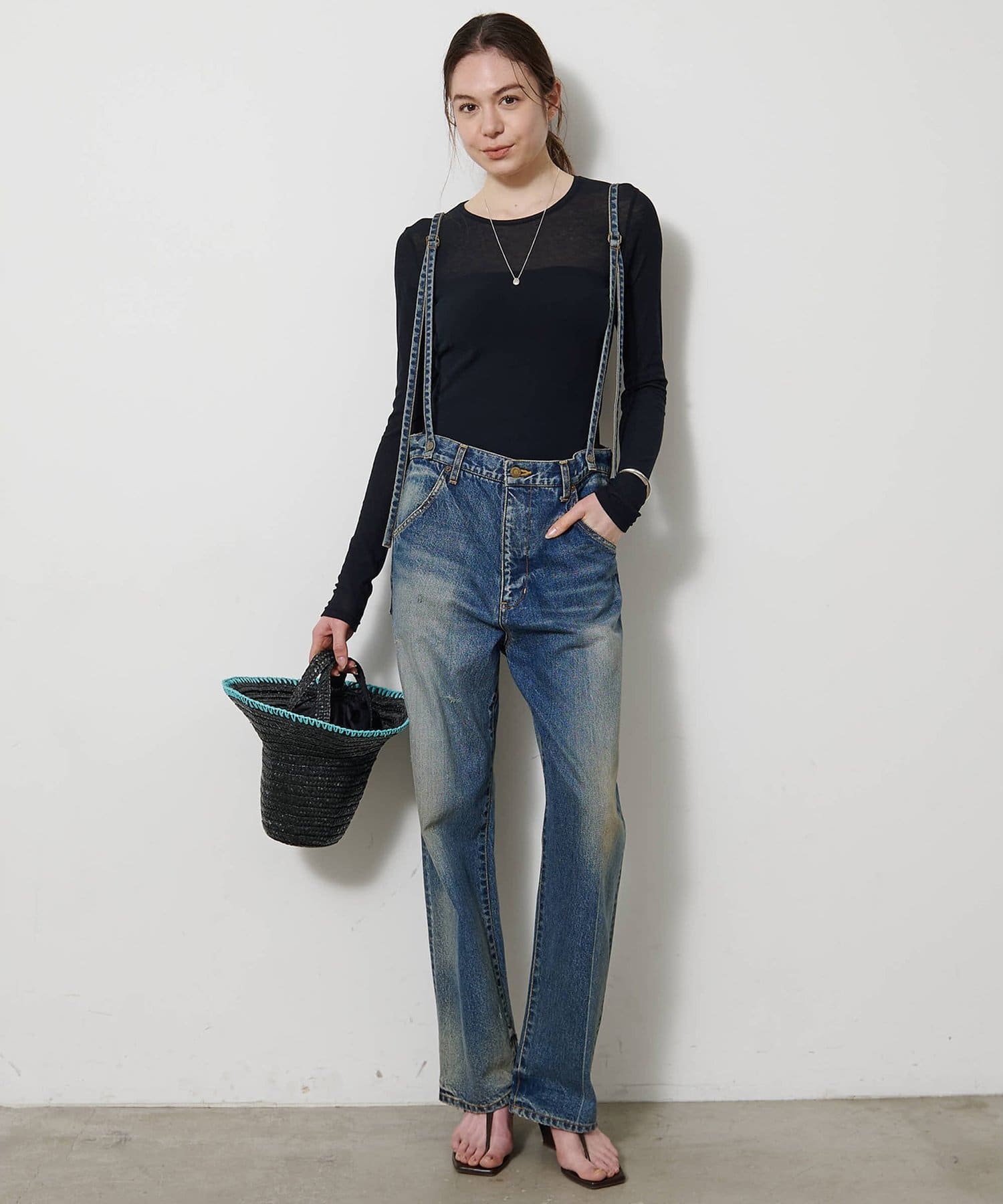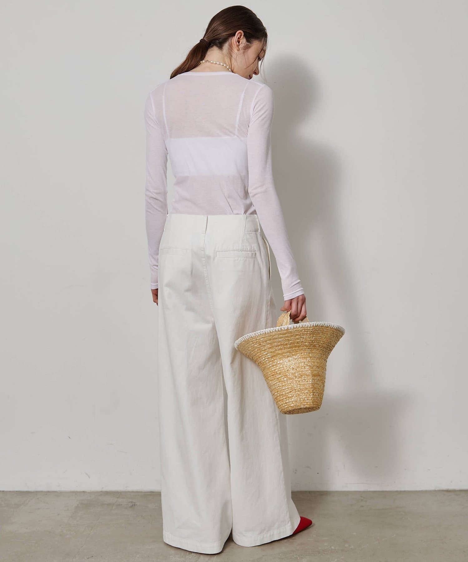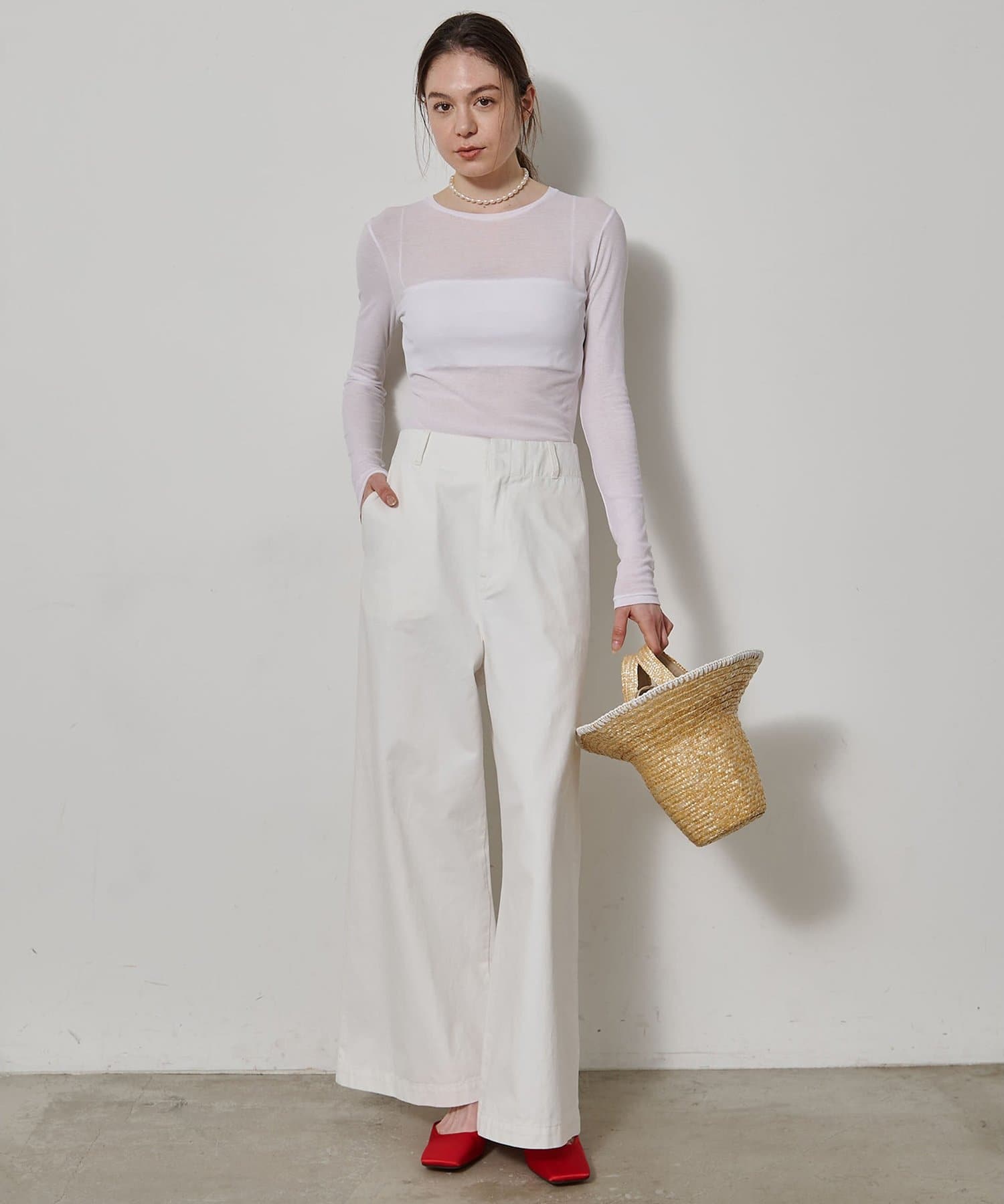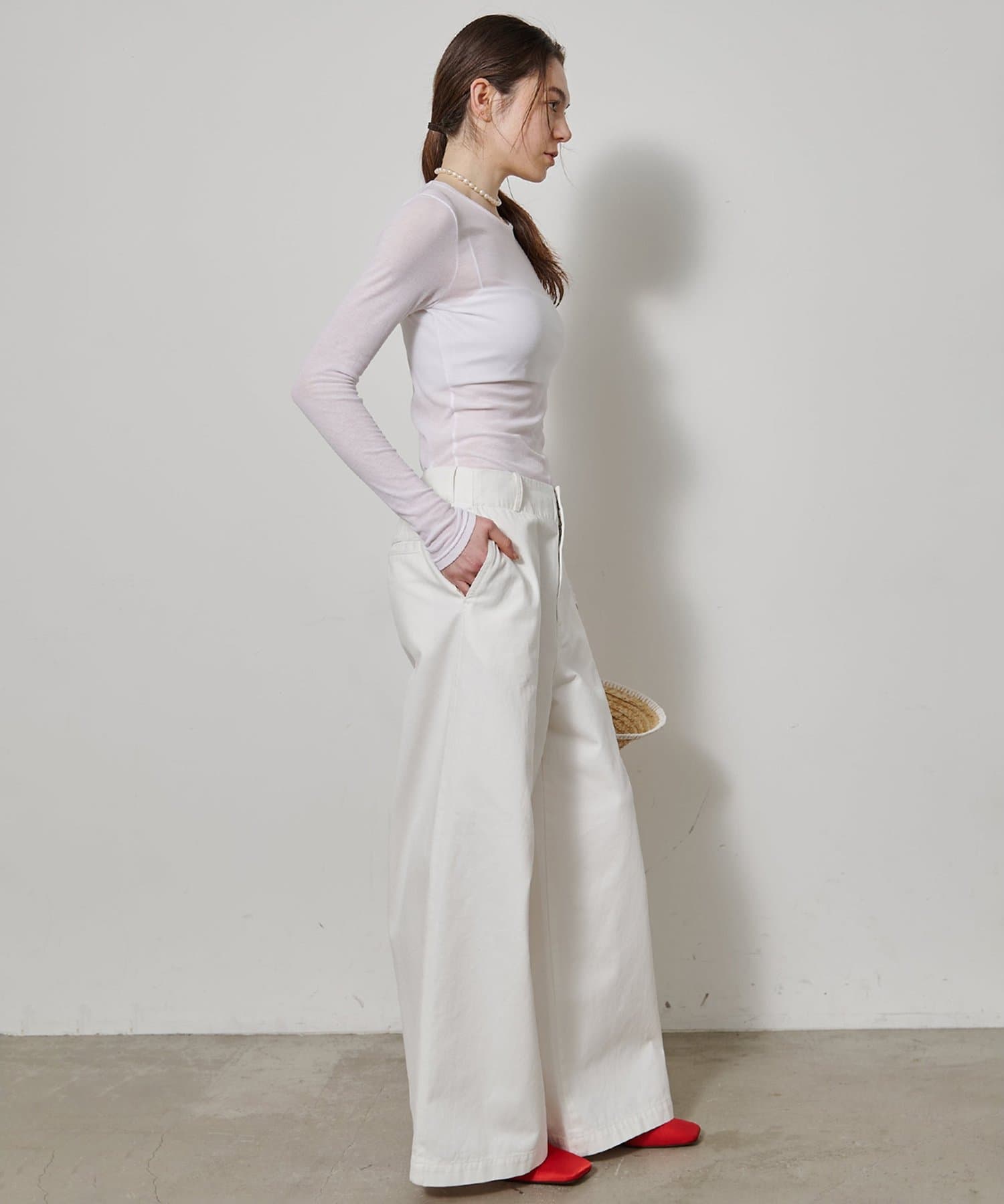 ■程よいシアー感と華奢なクルーネックがレイヤードを邪魔せず、女性らしい抜け感を演出。