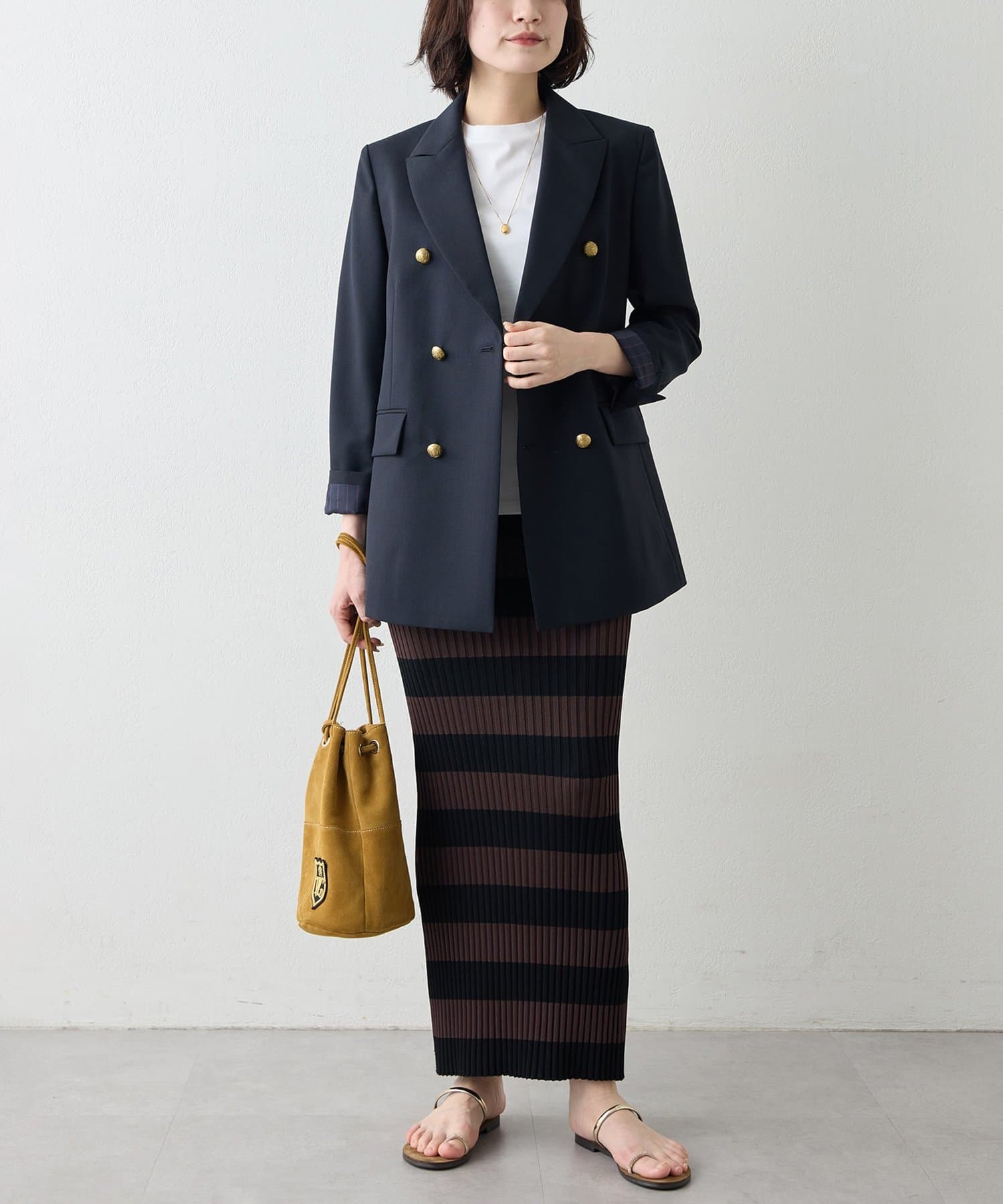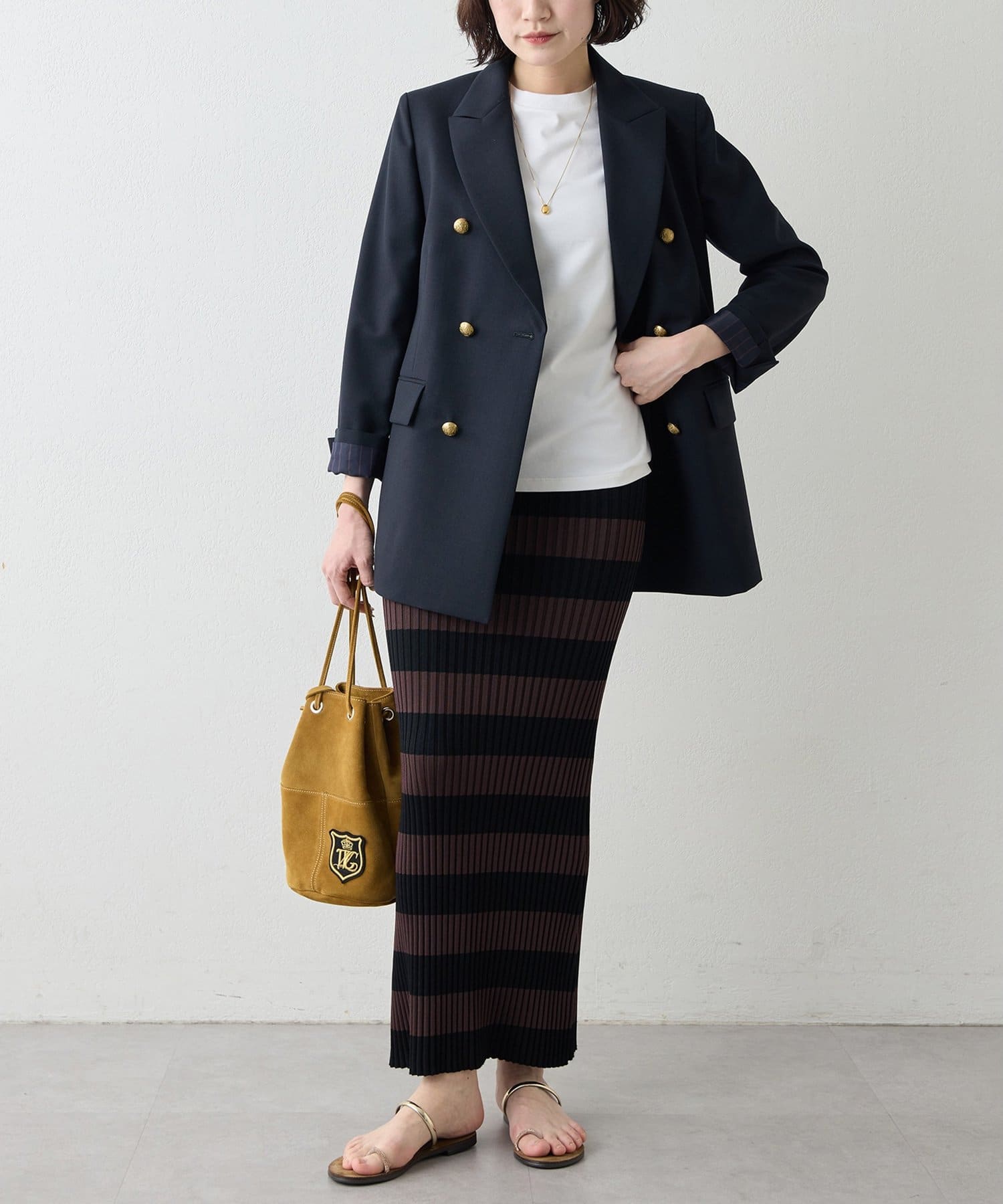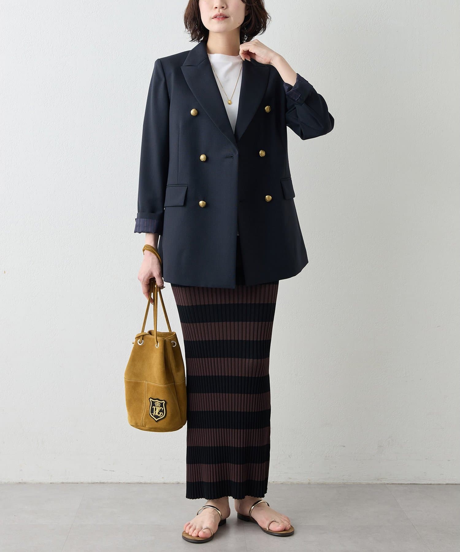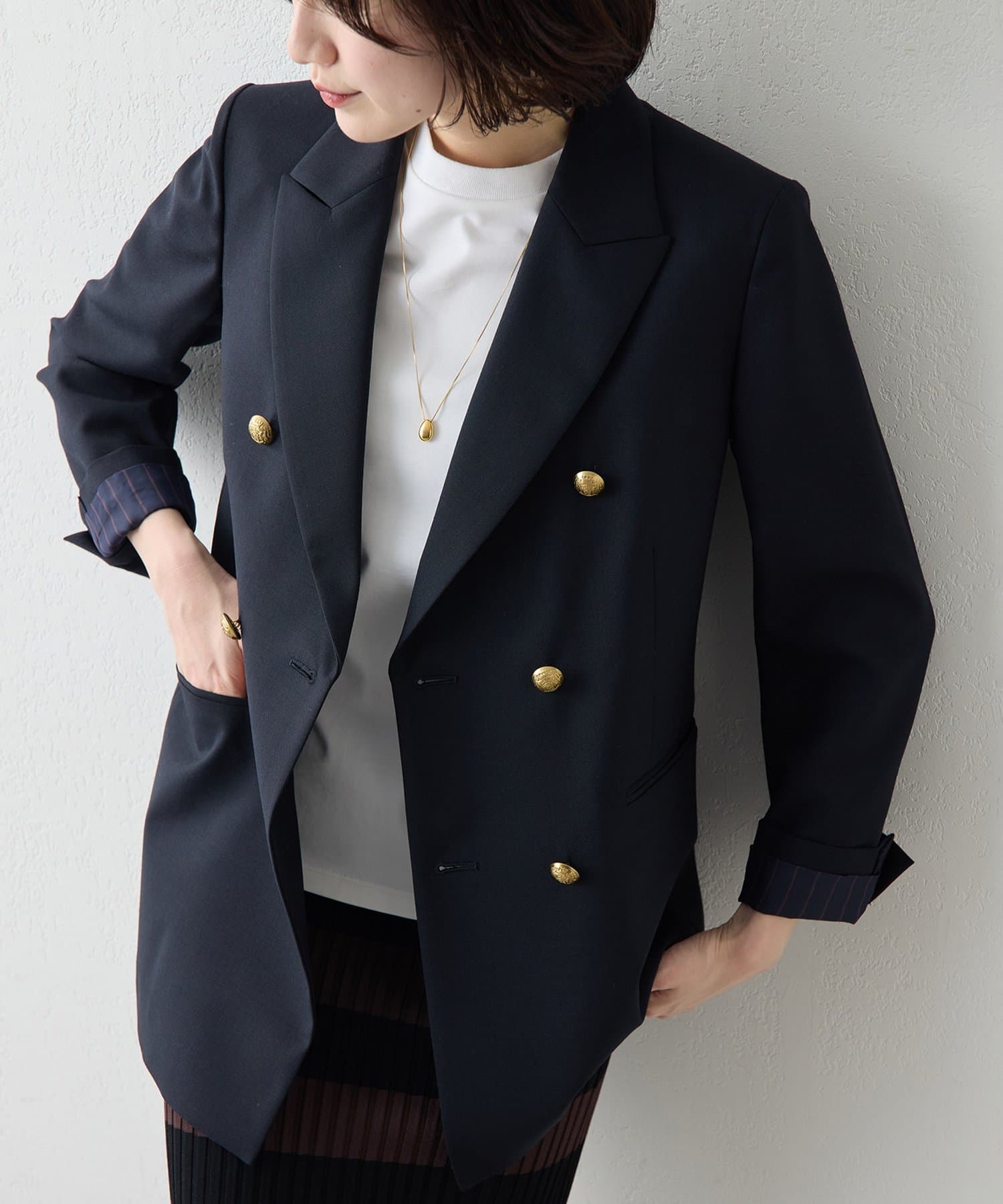 ■肩周りに程よくゆとりを持たせたボクシーなラインに、品のあるダブルブレストが羽織るだけで決まる一着。