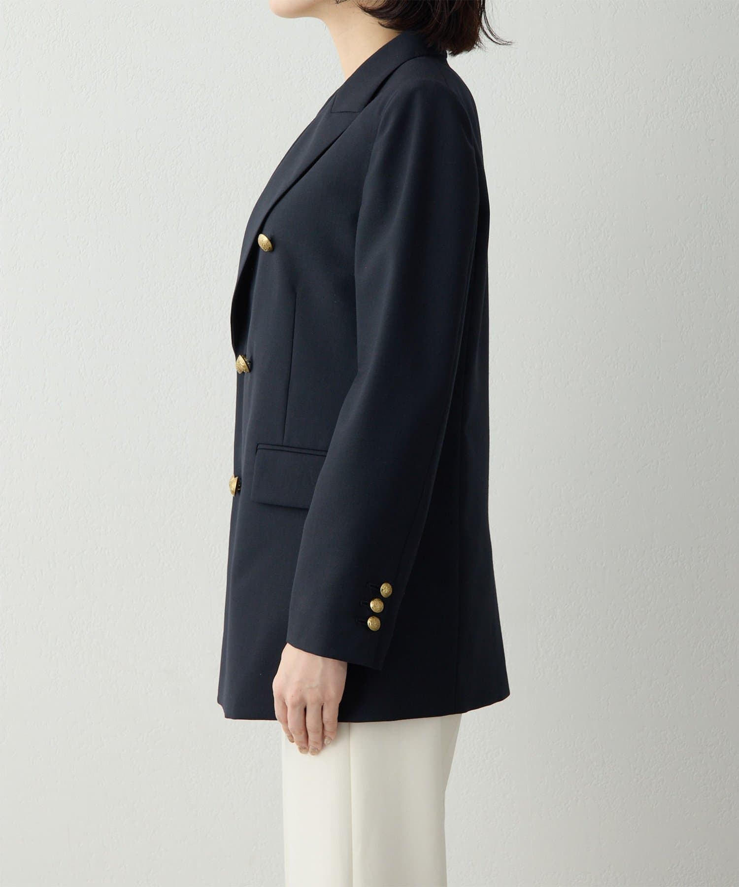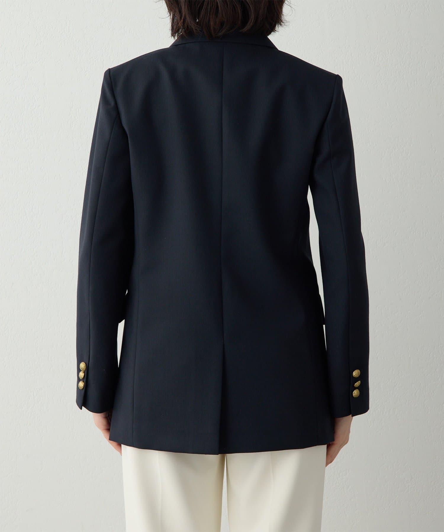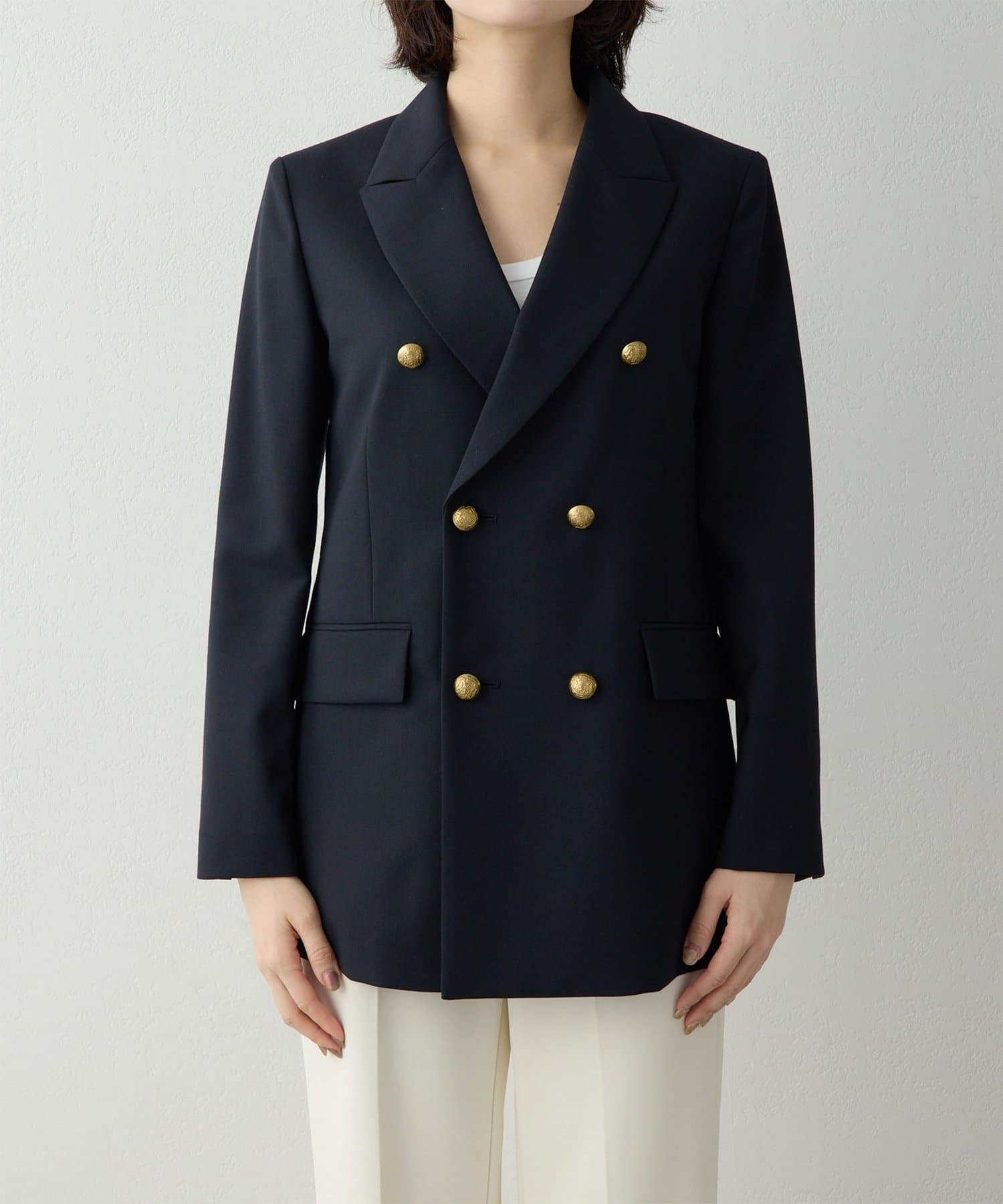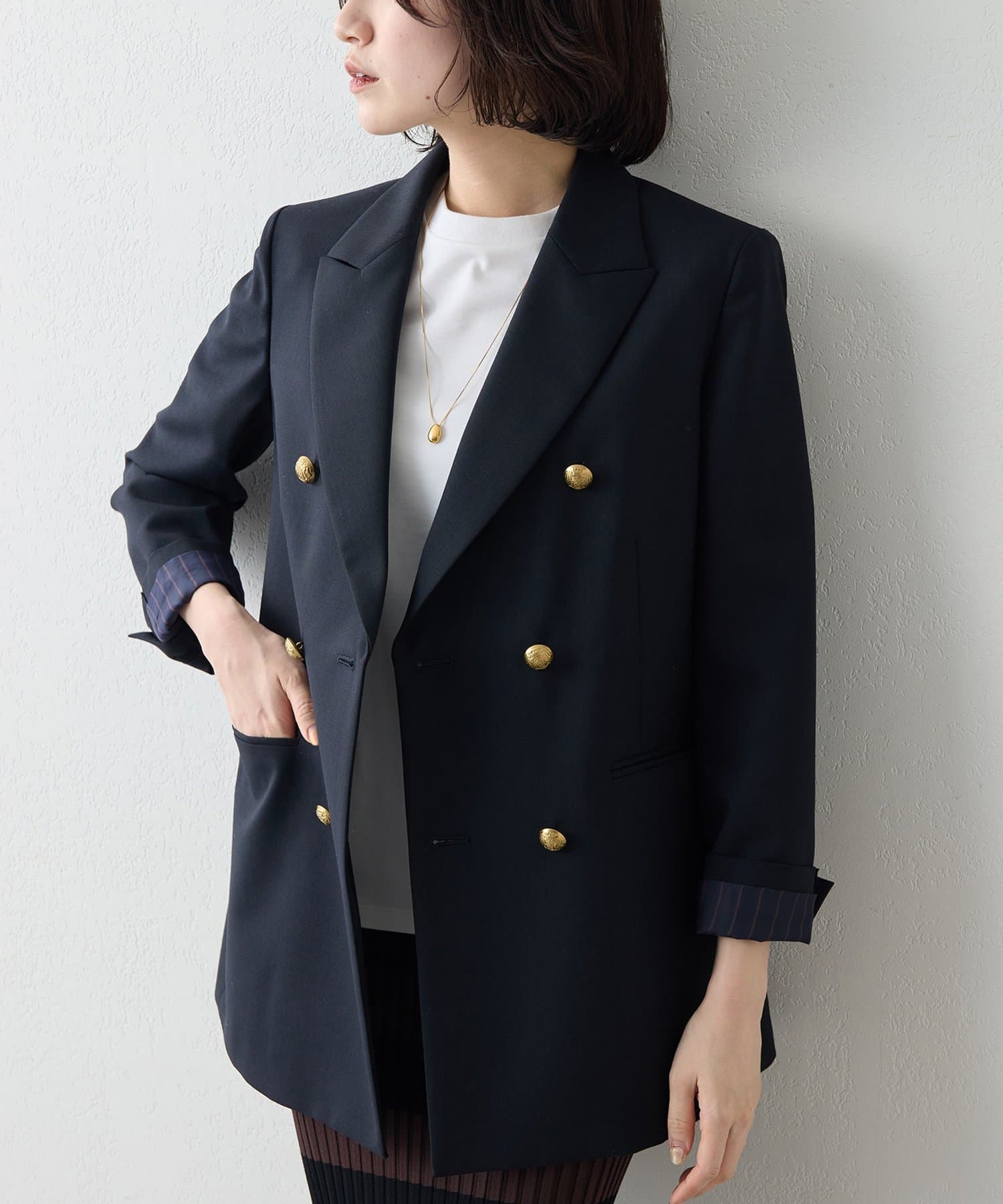 構築的シルエットがクラシカルモダンな定番紺ブレ