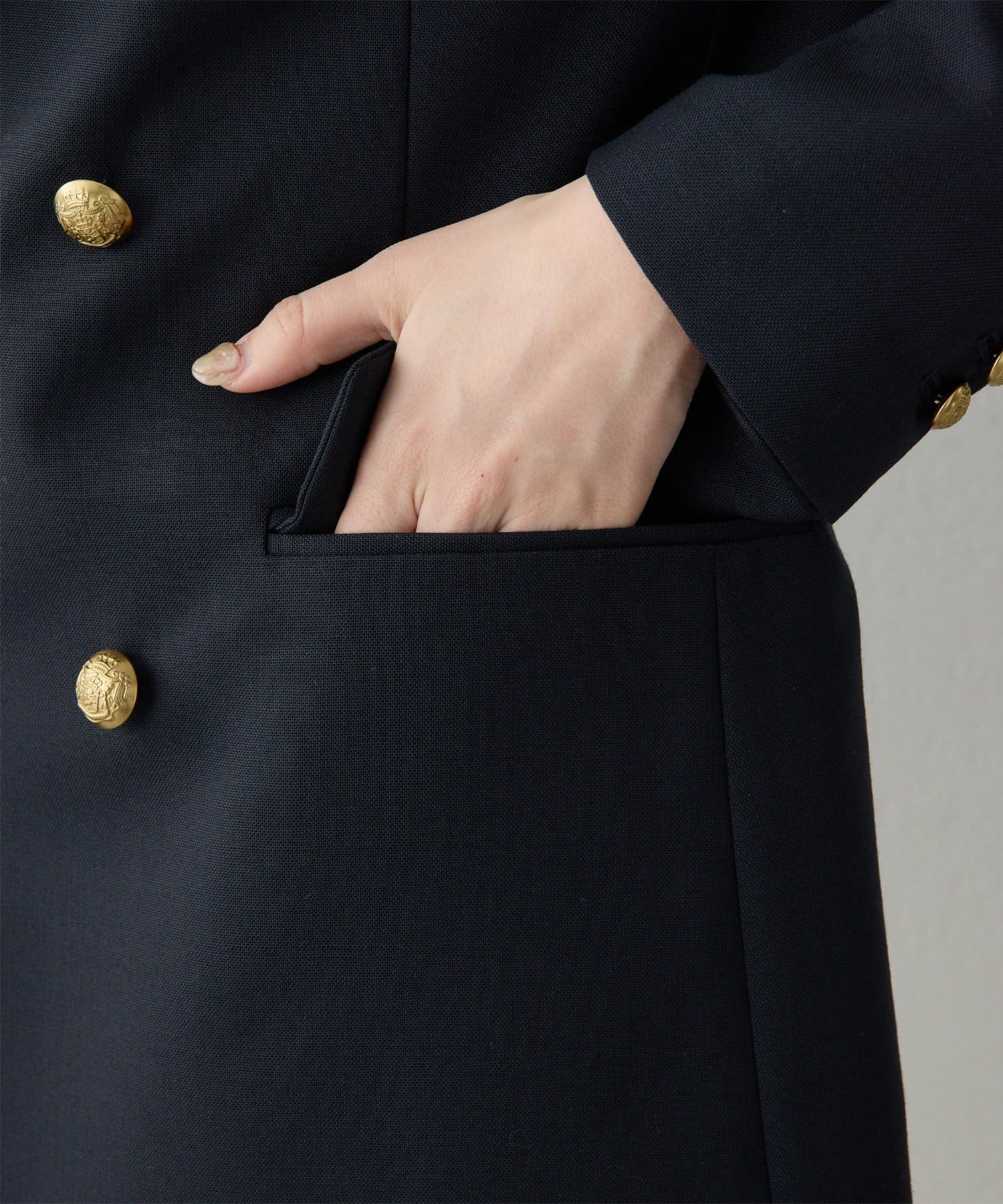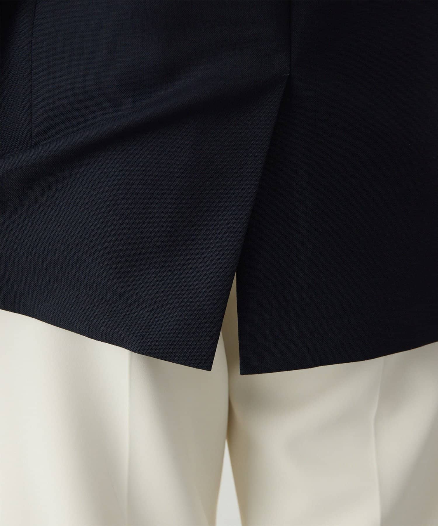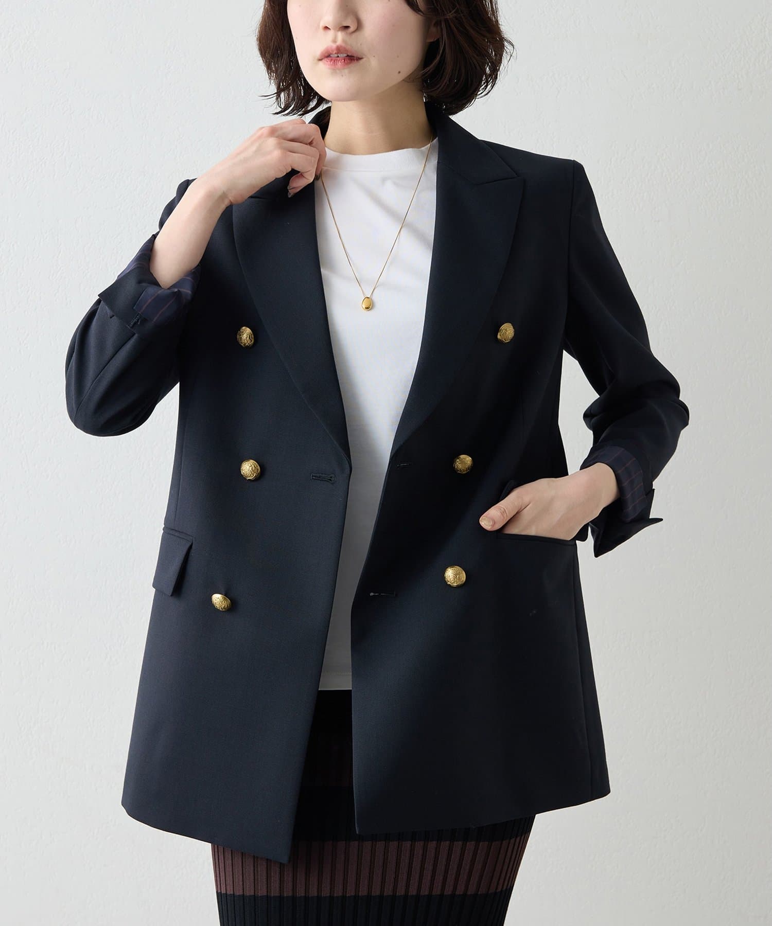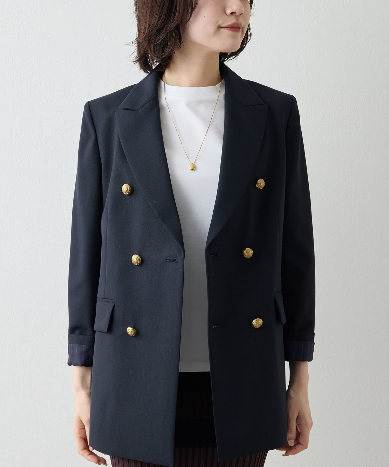 構築的シルエットがクラシカルモダンな定番紺ブレ