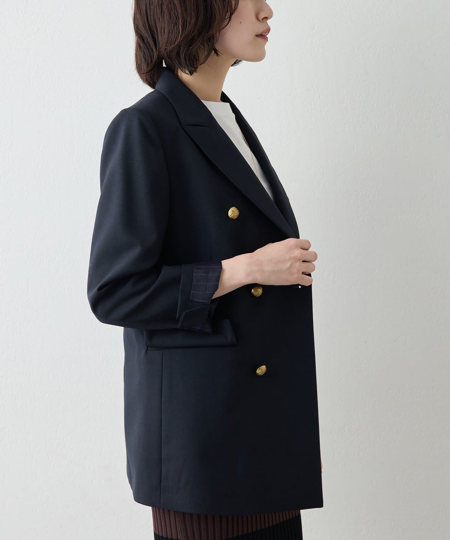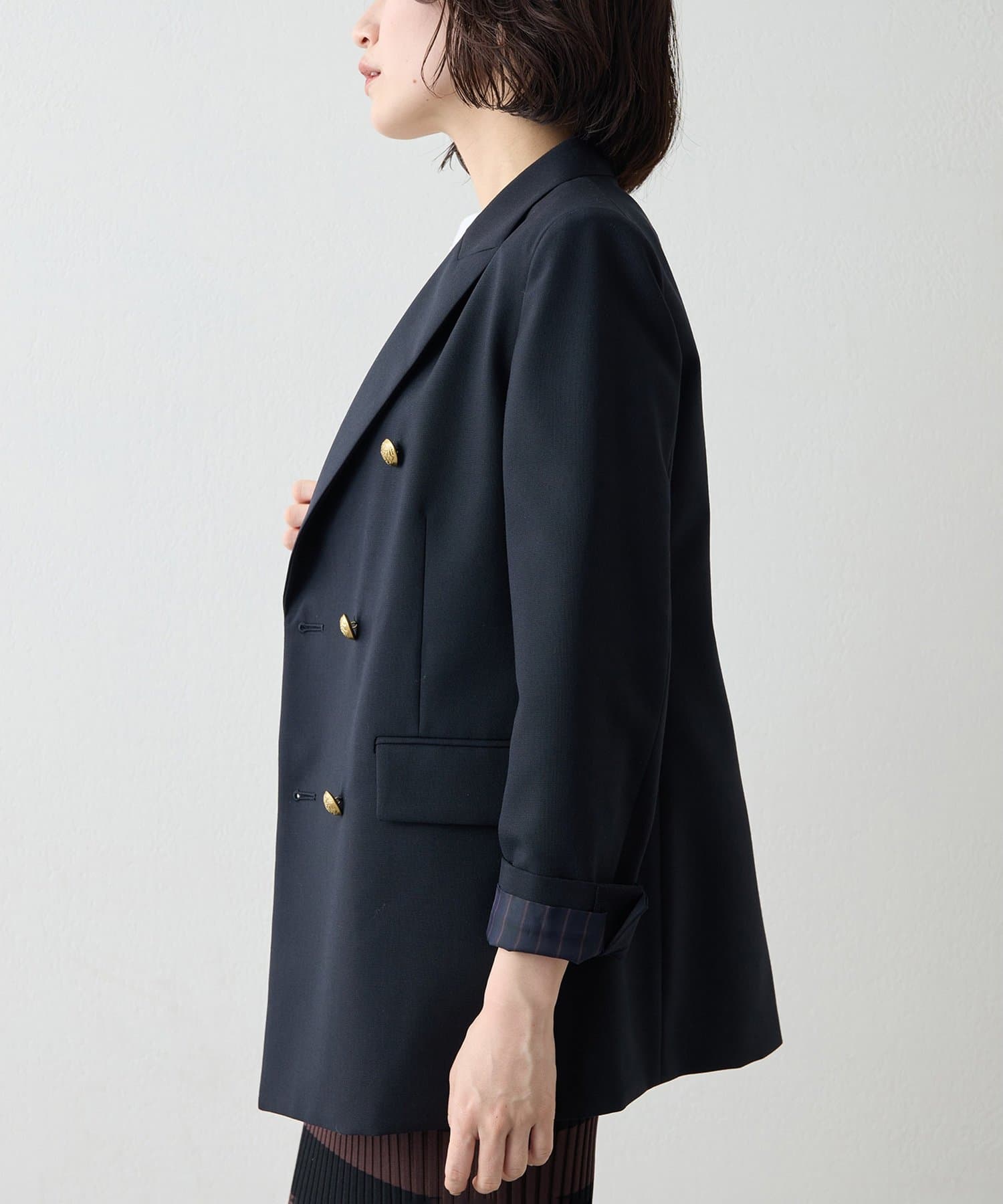 ■シャープな印象の金ボタンがアクセントになり、ストライプ柄の裏地は袖を折り返しても◎。