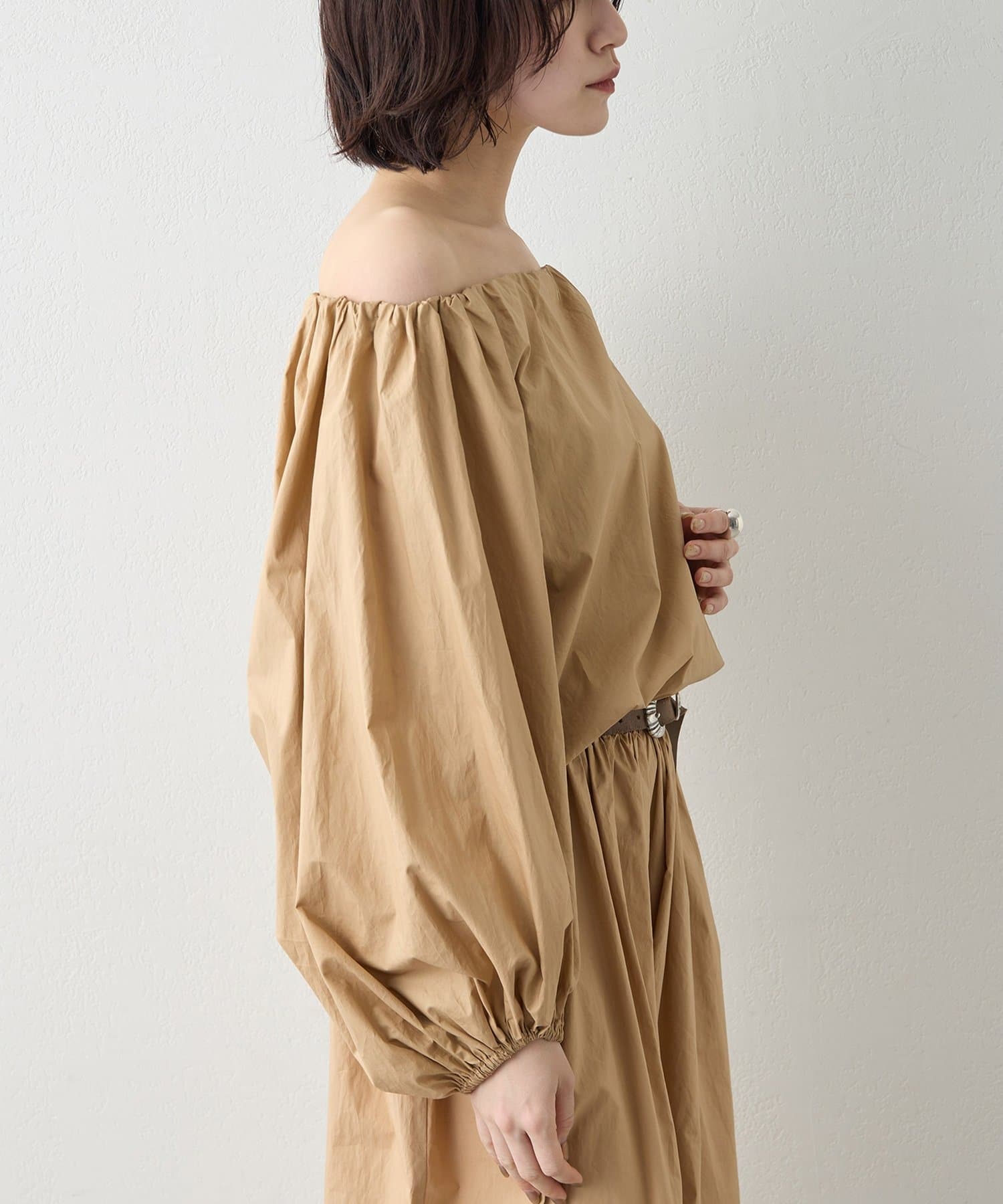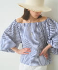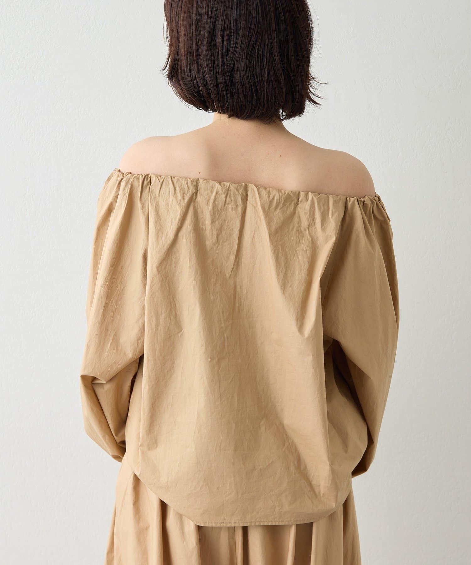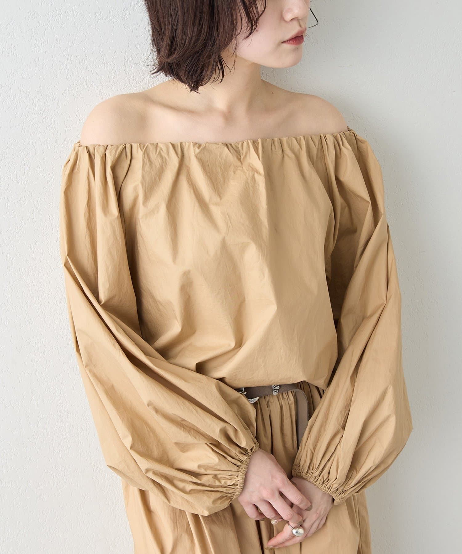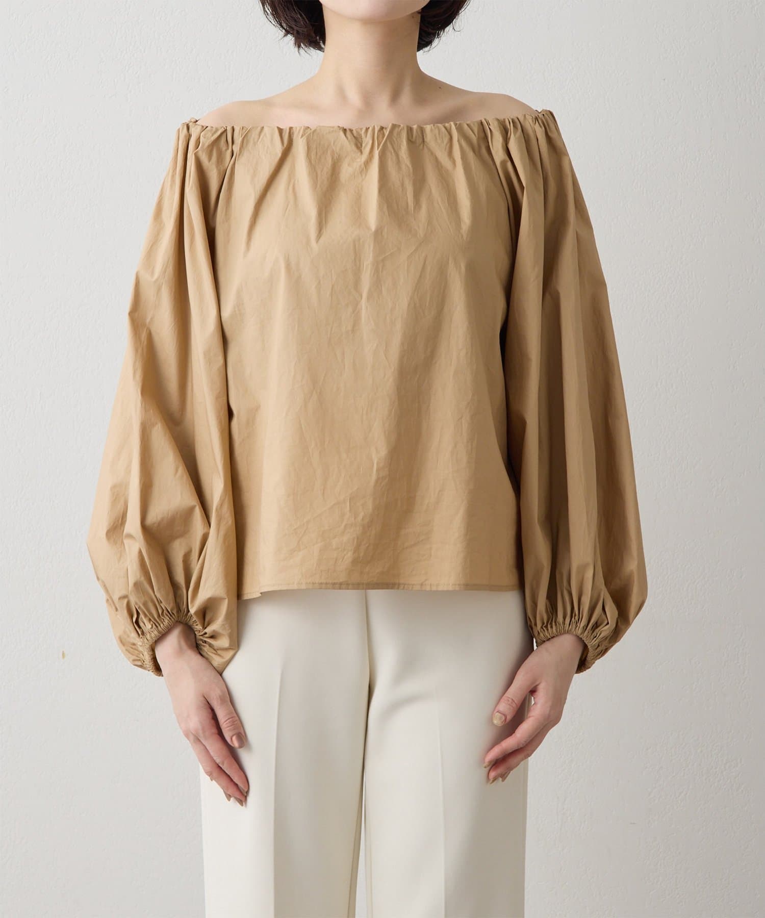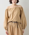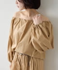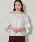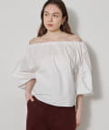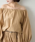 ■ハリのあるタイプライター素材を使用したオフショルダーブラウス。