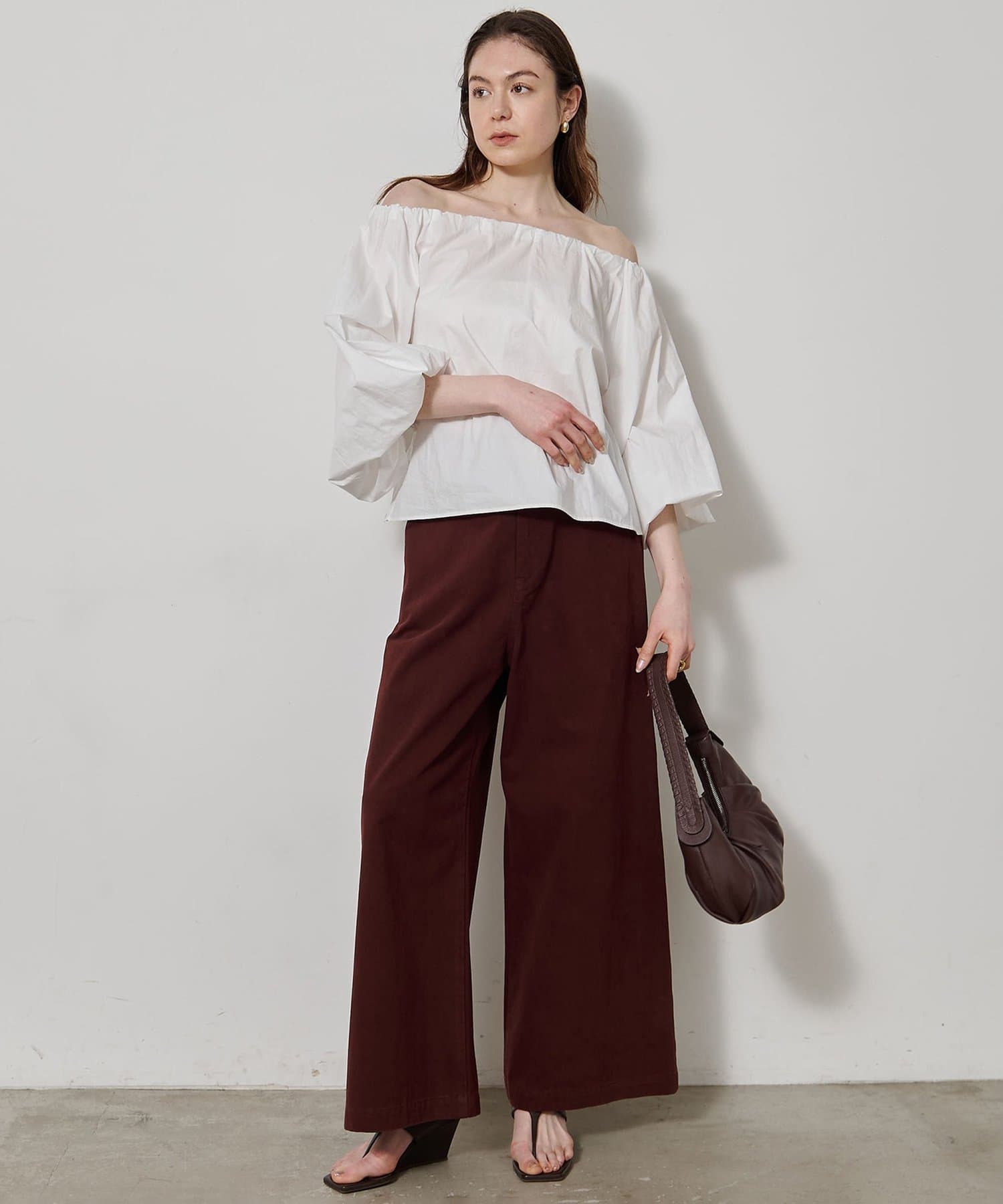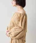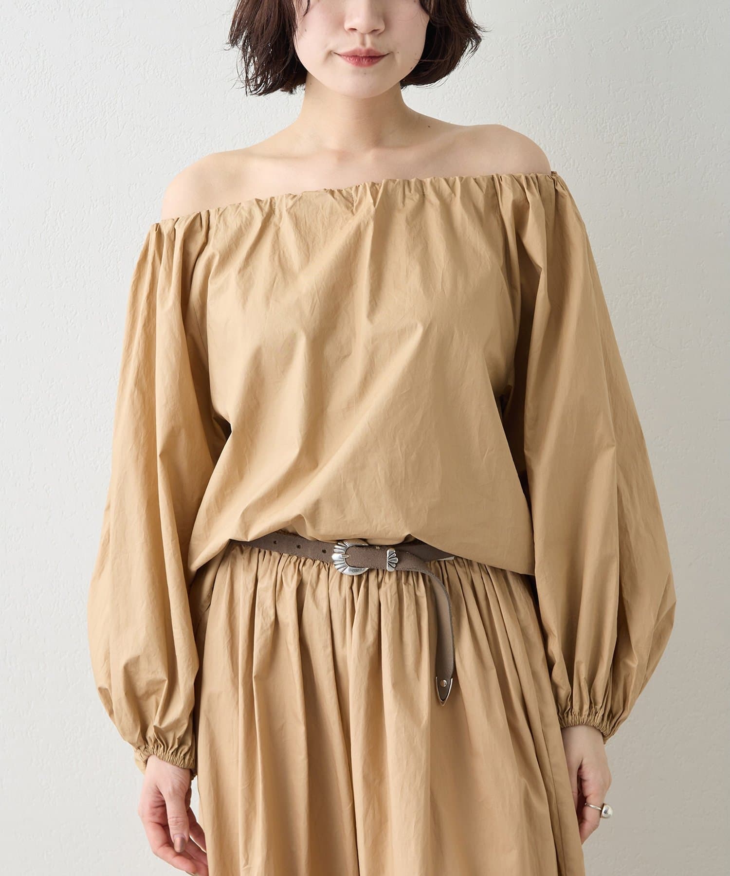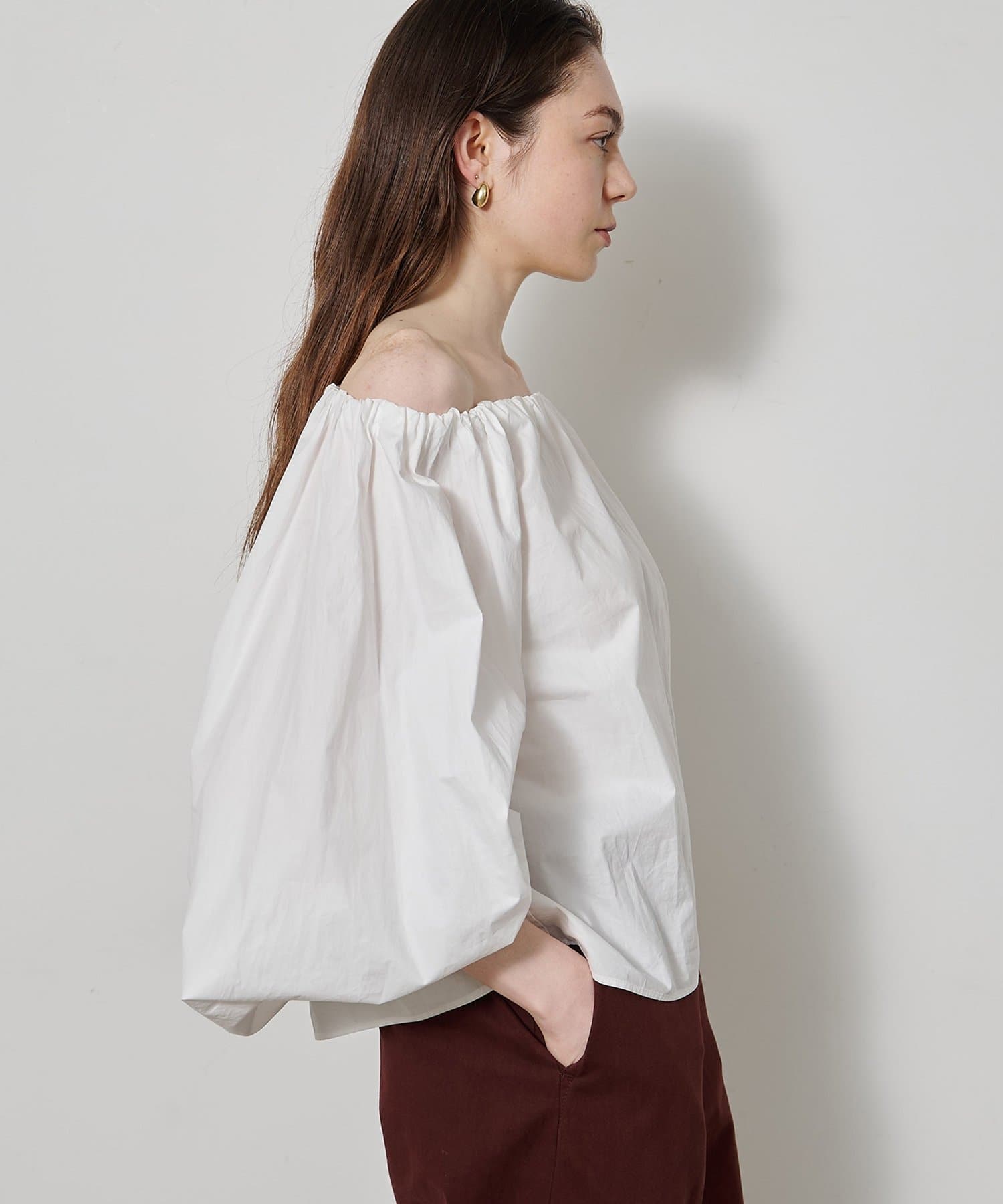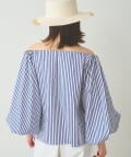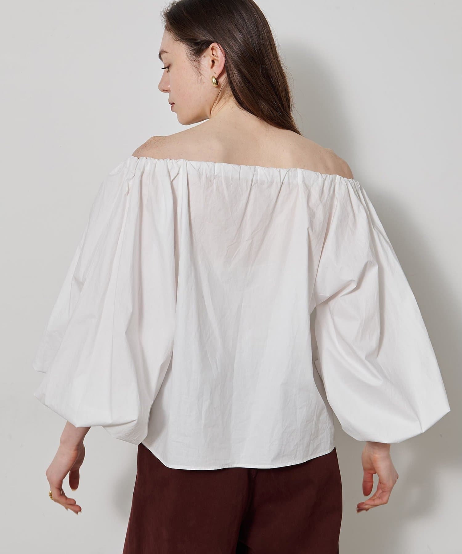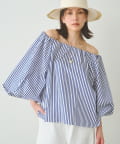■ハリのあるタイプライター素材を使用したオフショルダーブラウス。