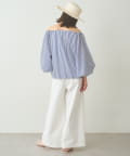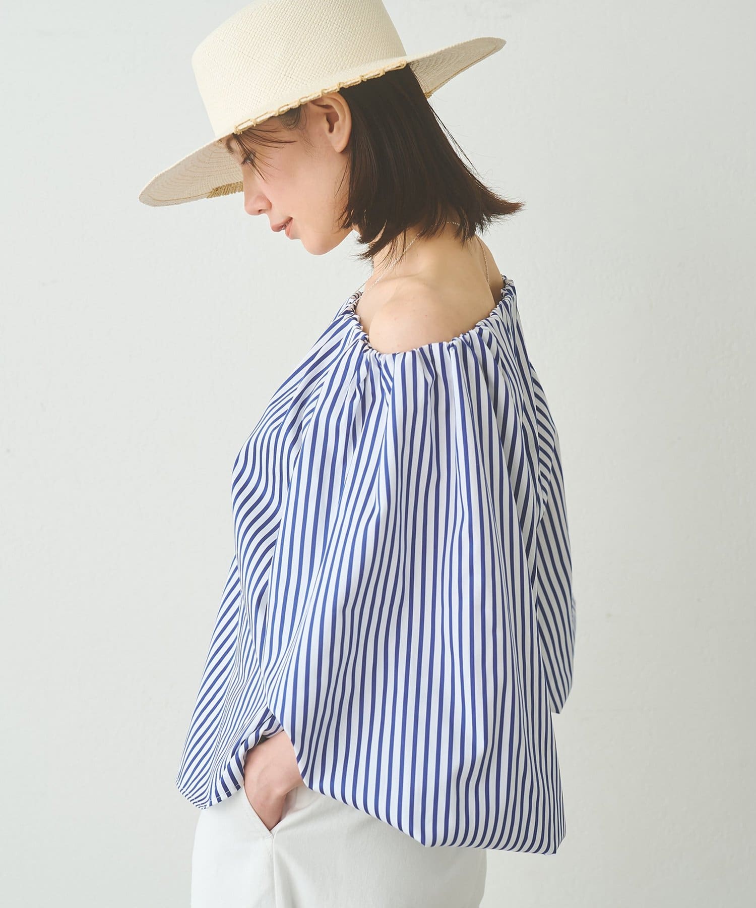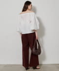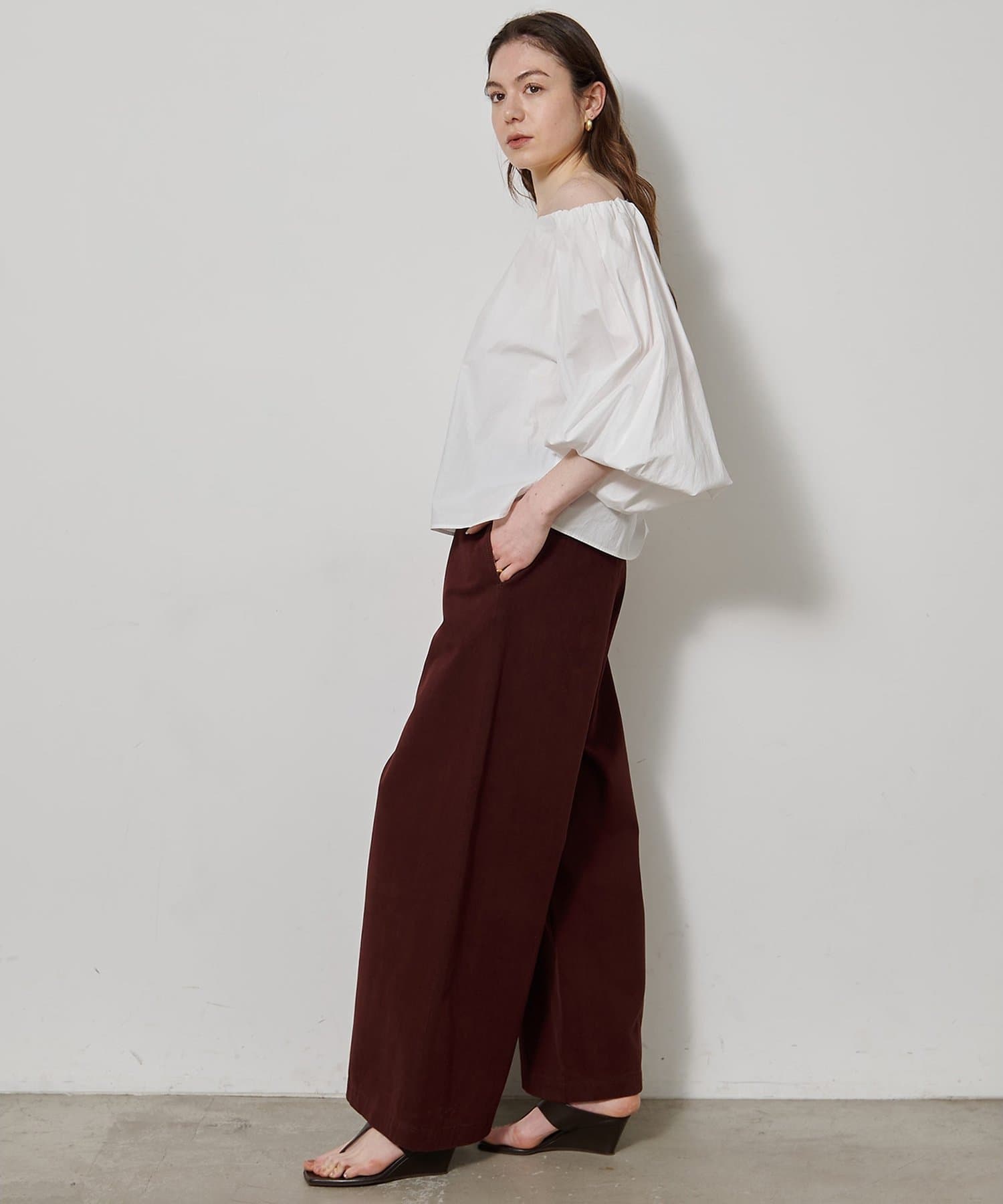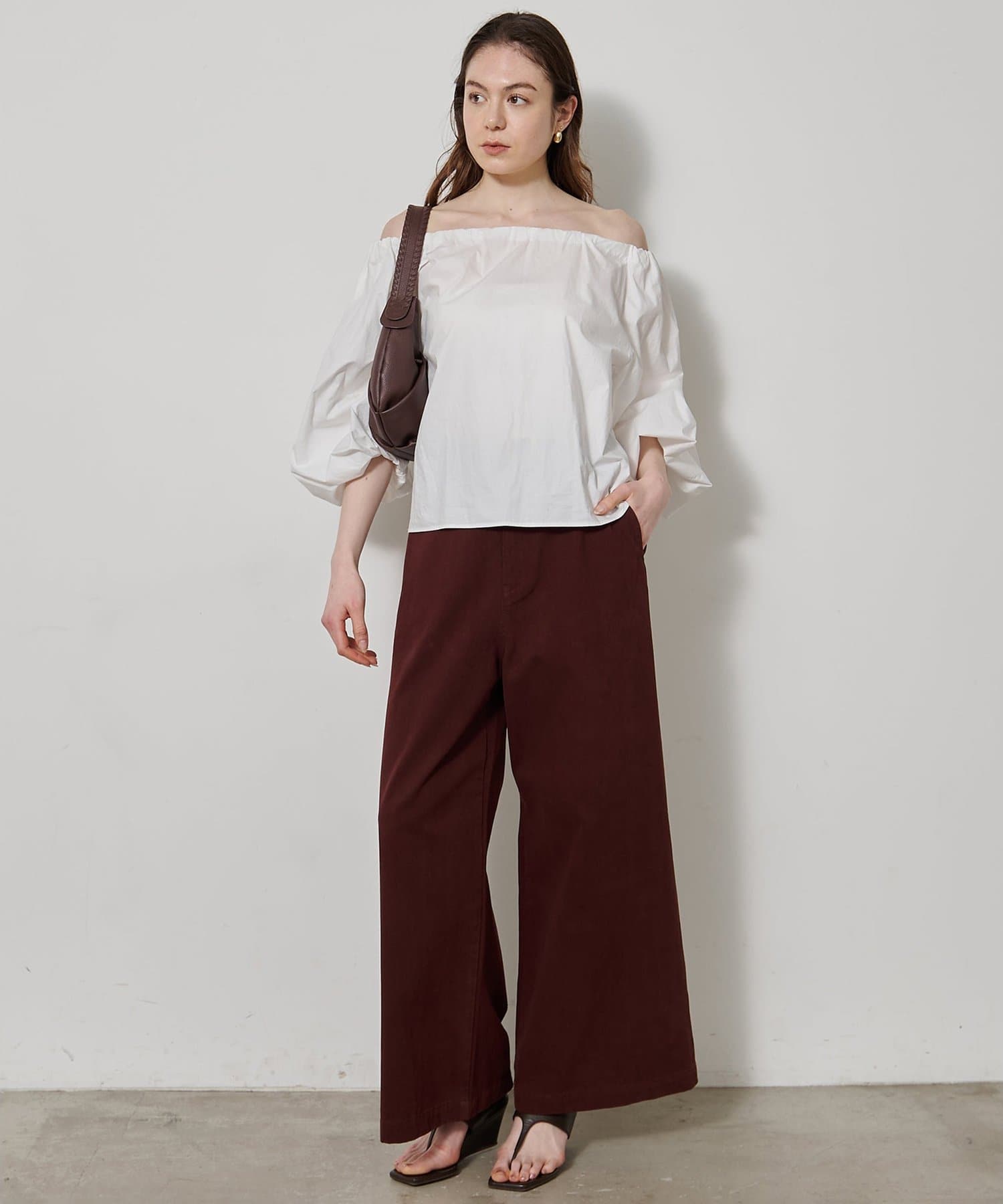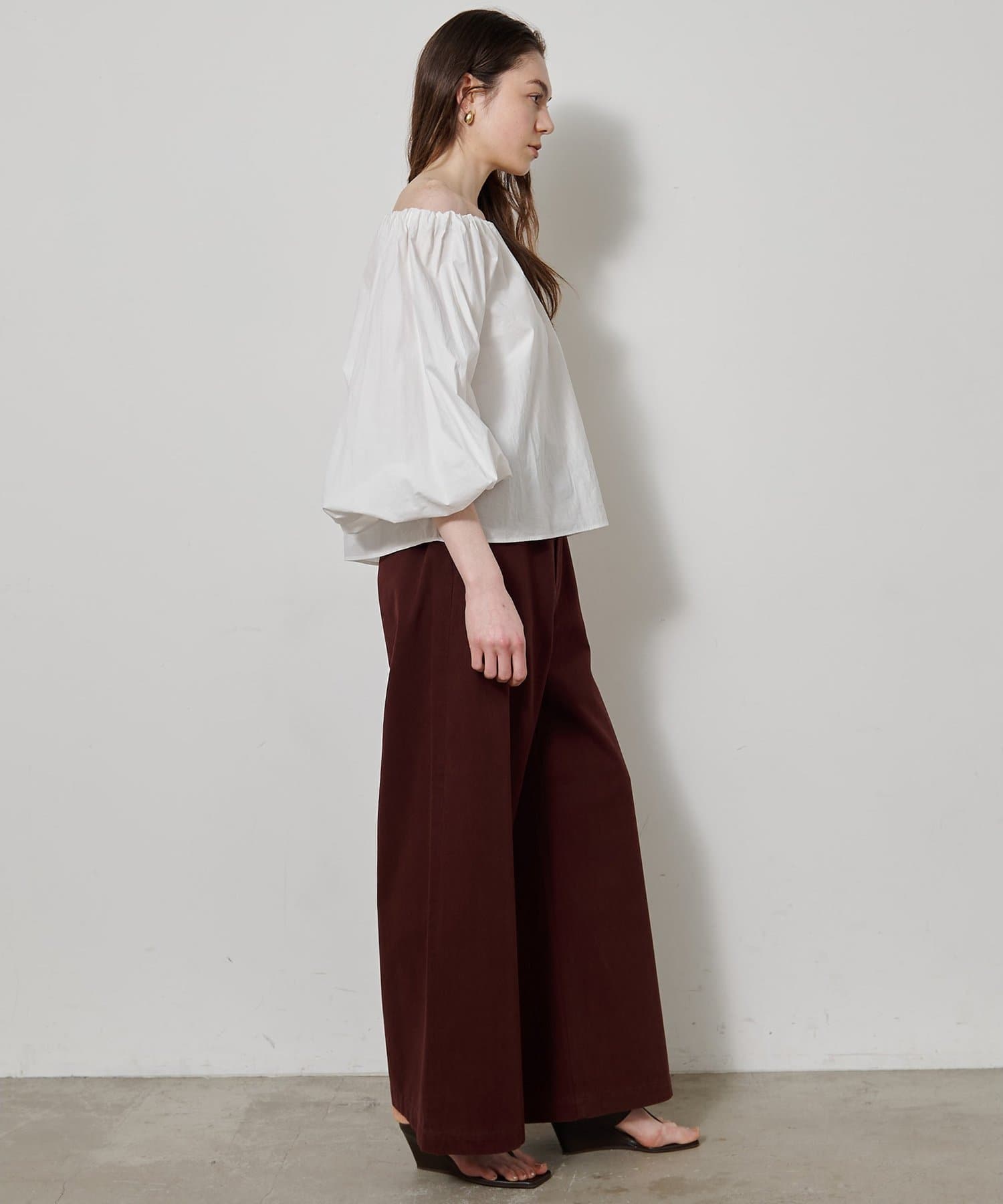 ■ハリのあるタイプライター素材を使用したオフショルダーブラウス。