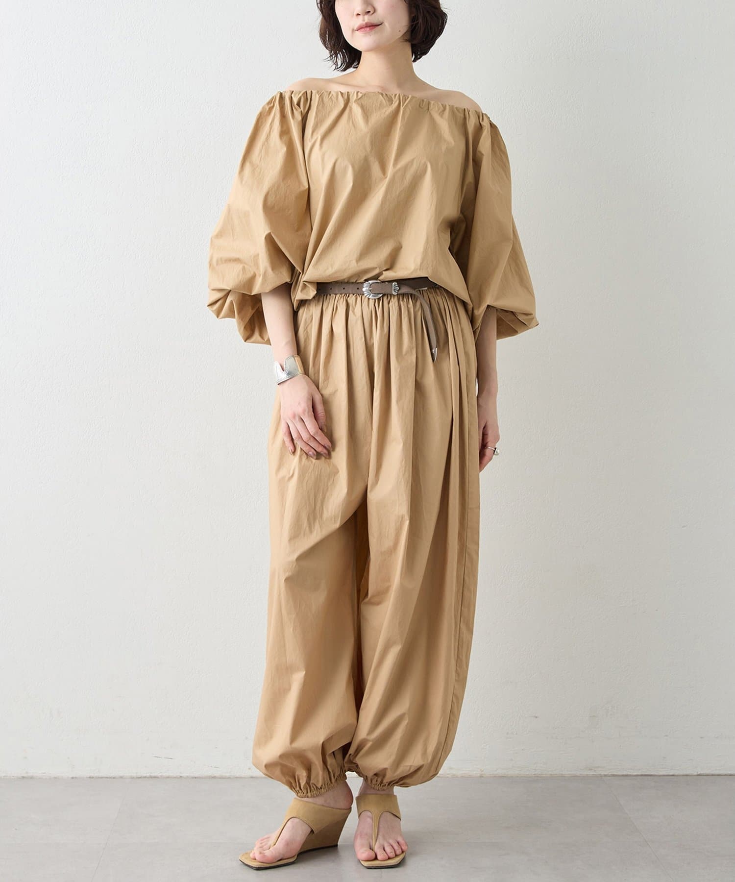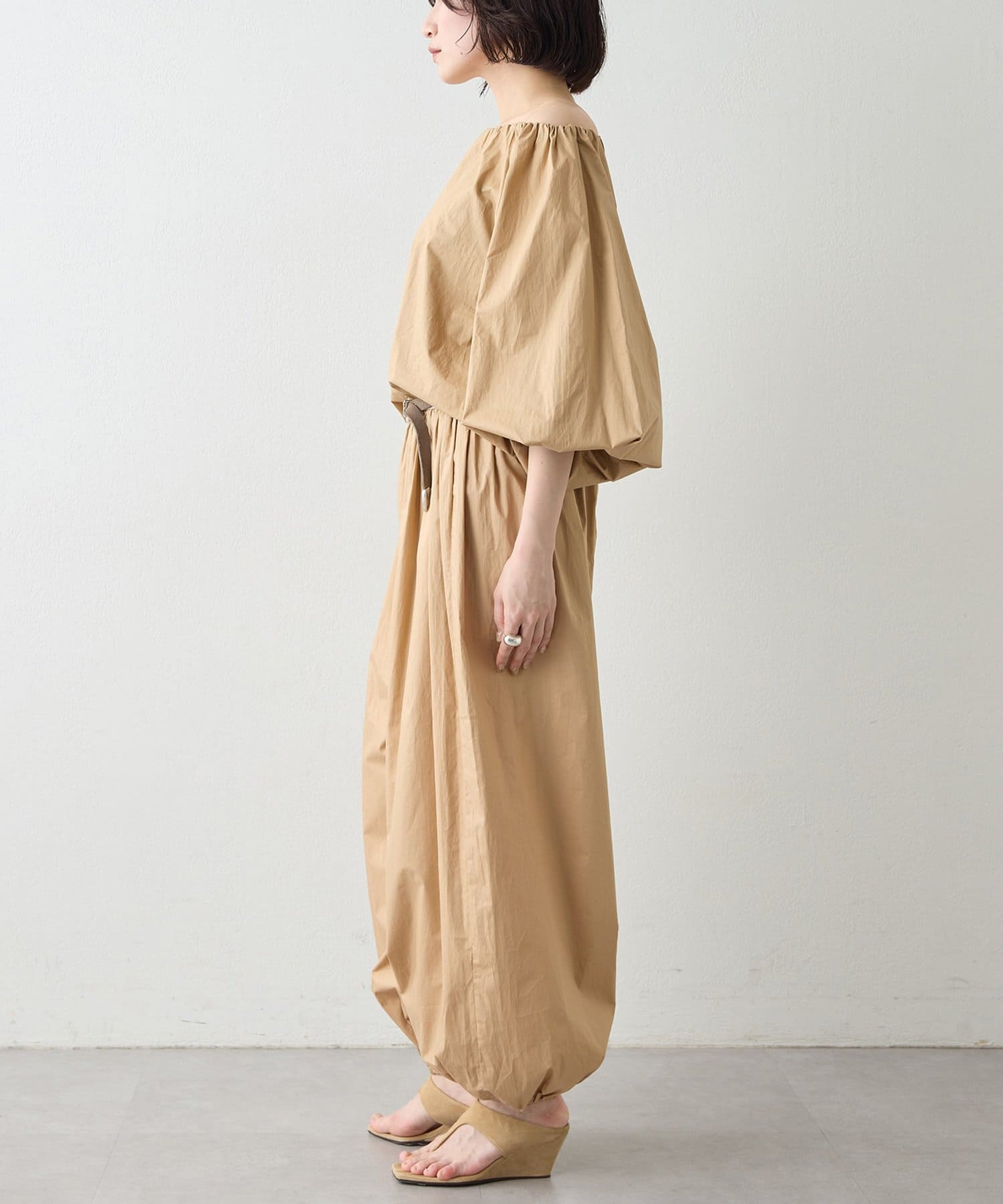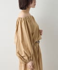 ■デコルテを美しく見せるオフショルダーデザインと、ボリュームを持たせたスリーブが女性らしい抜け感を演出。