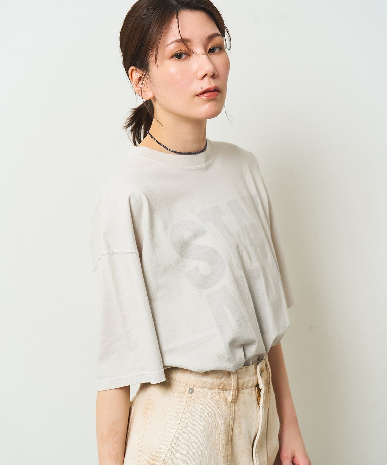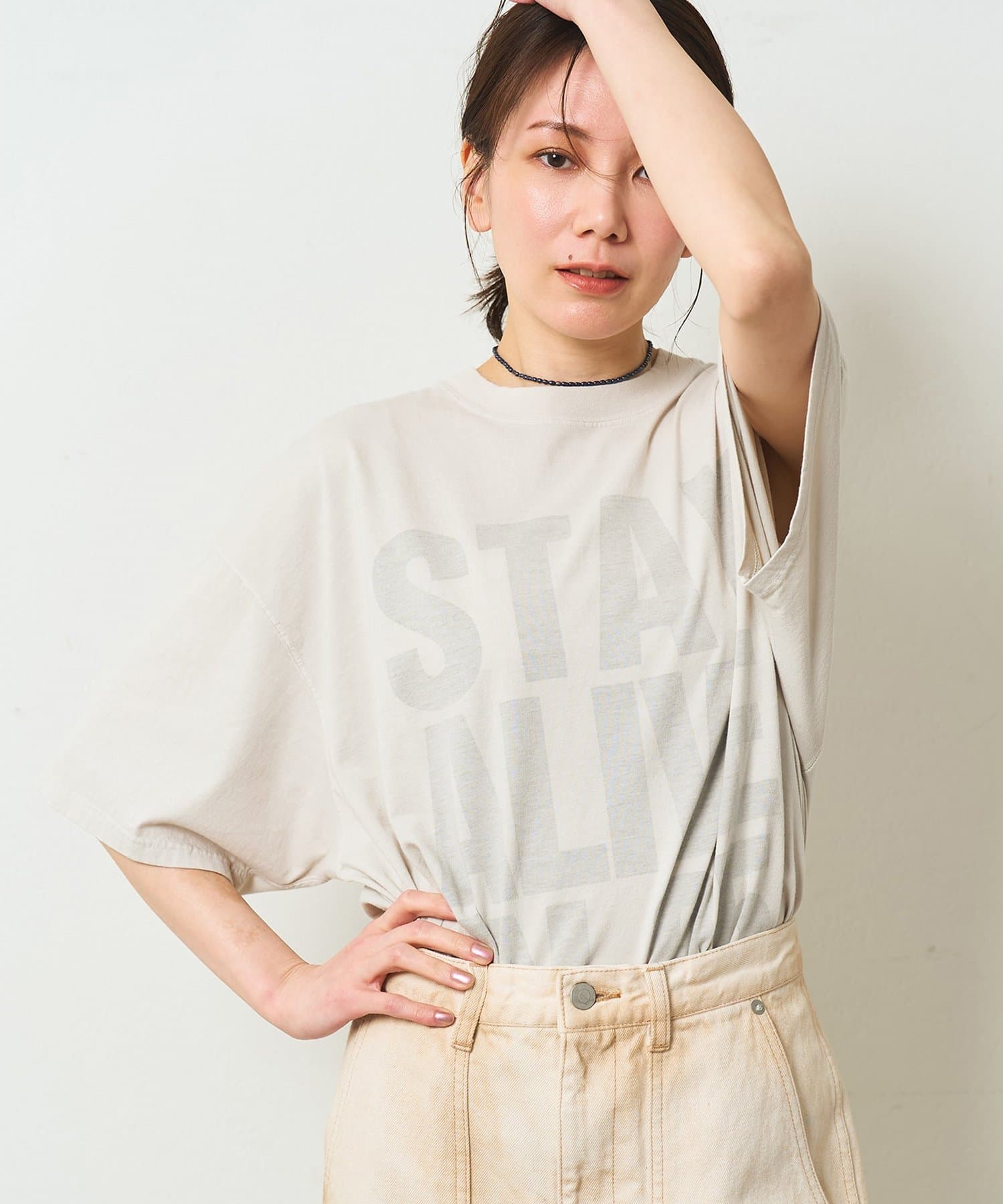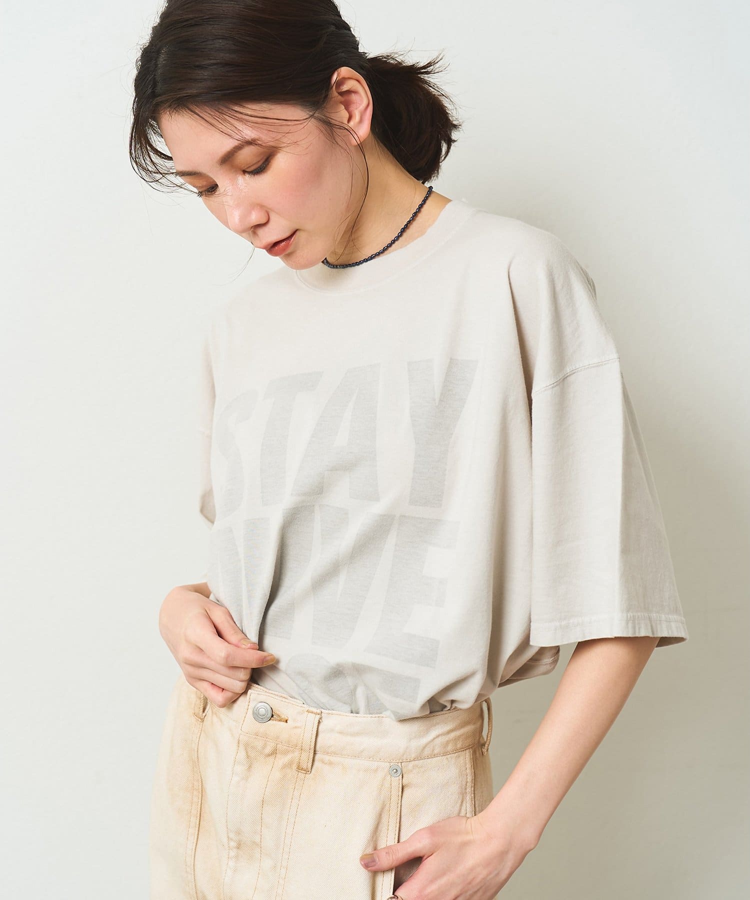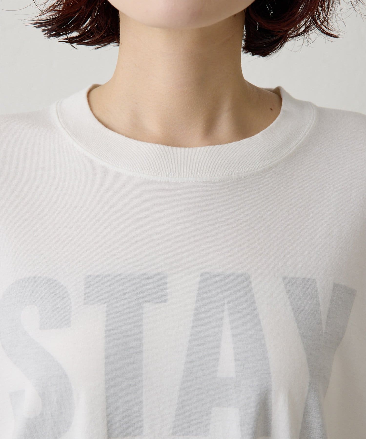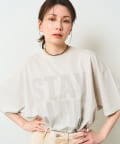 ■スローガンをTシャツの裏側からプリントすることで、ハードな印象を抑え柔らかくニュアンスのある印象に。