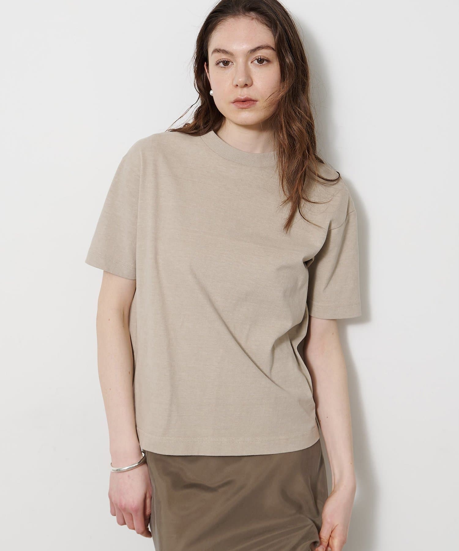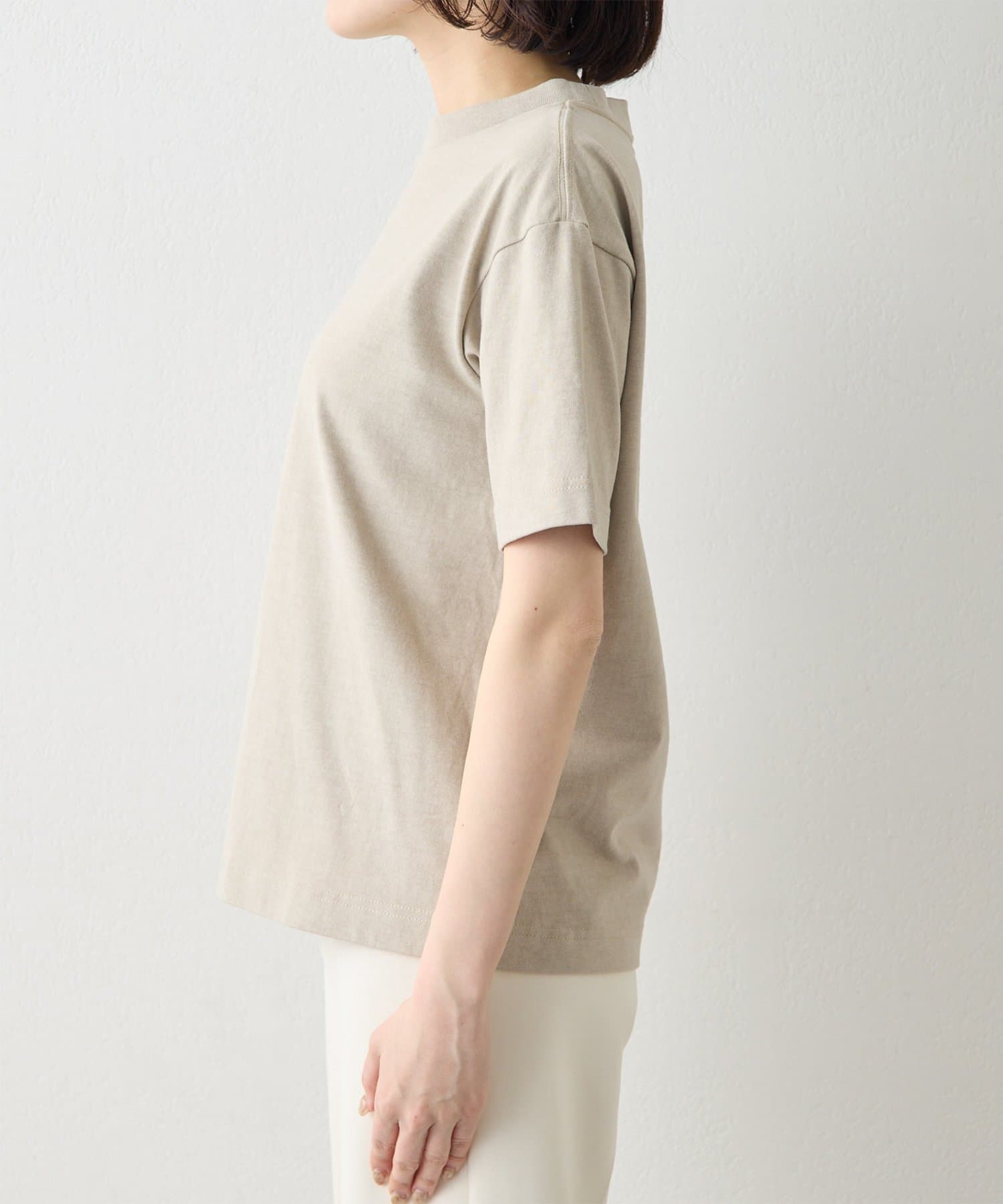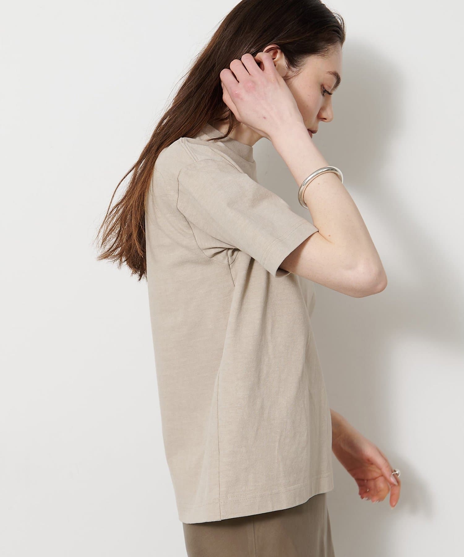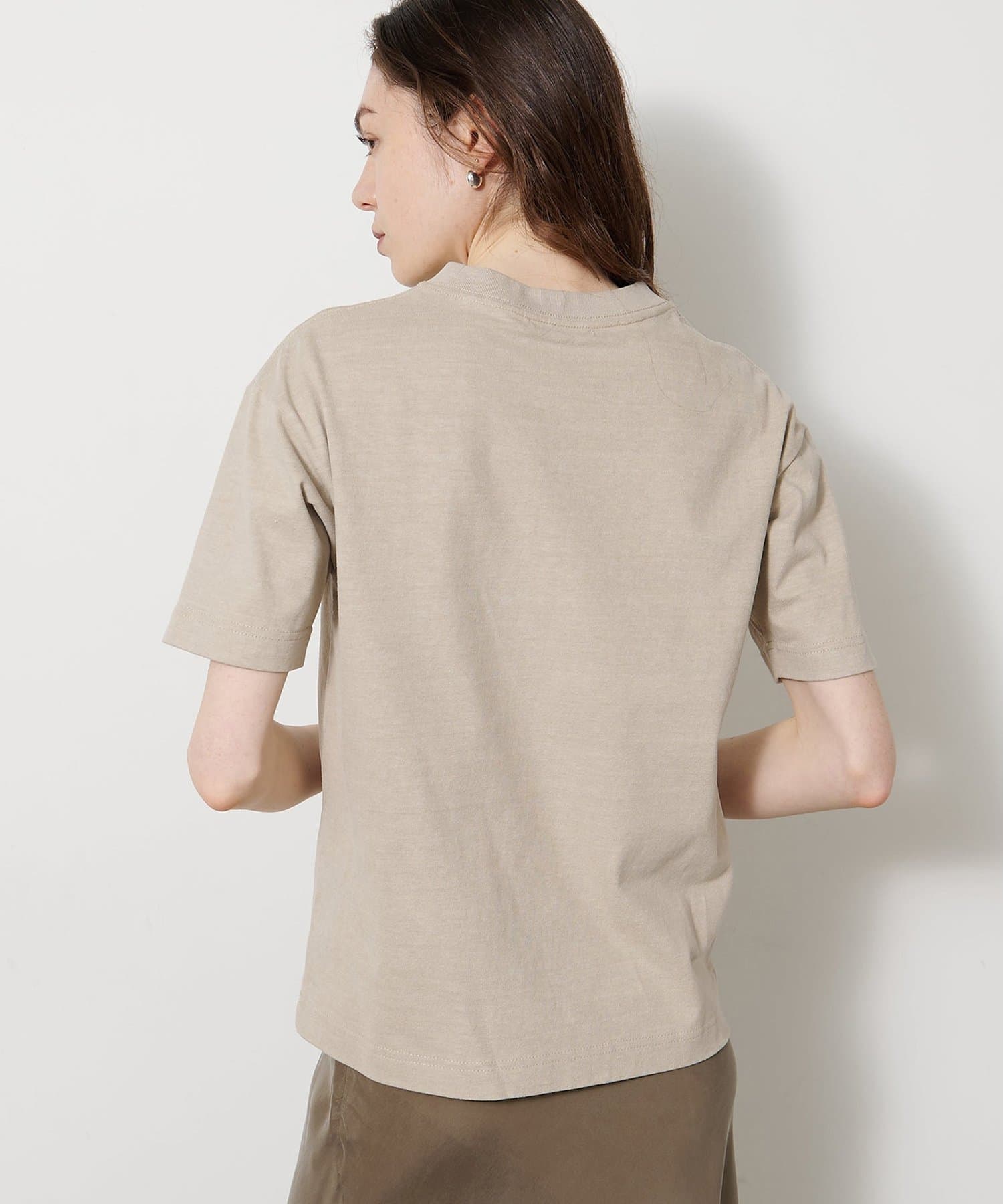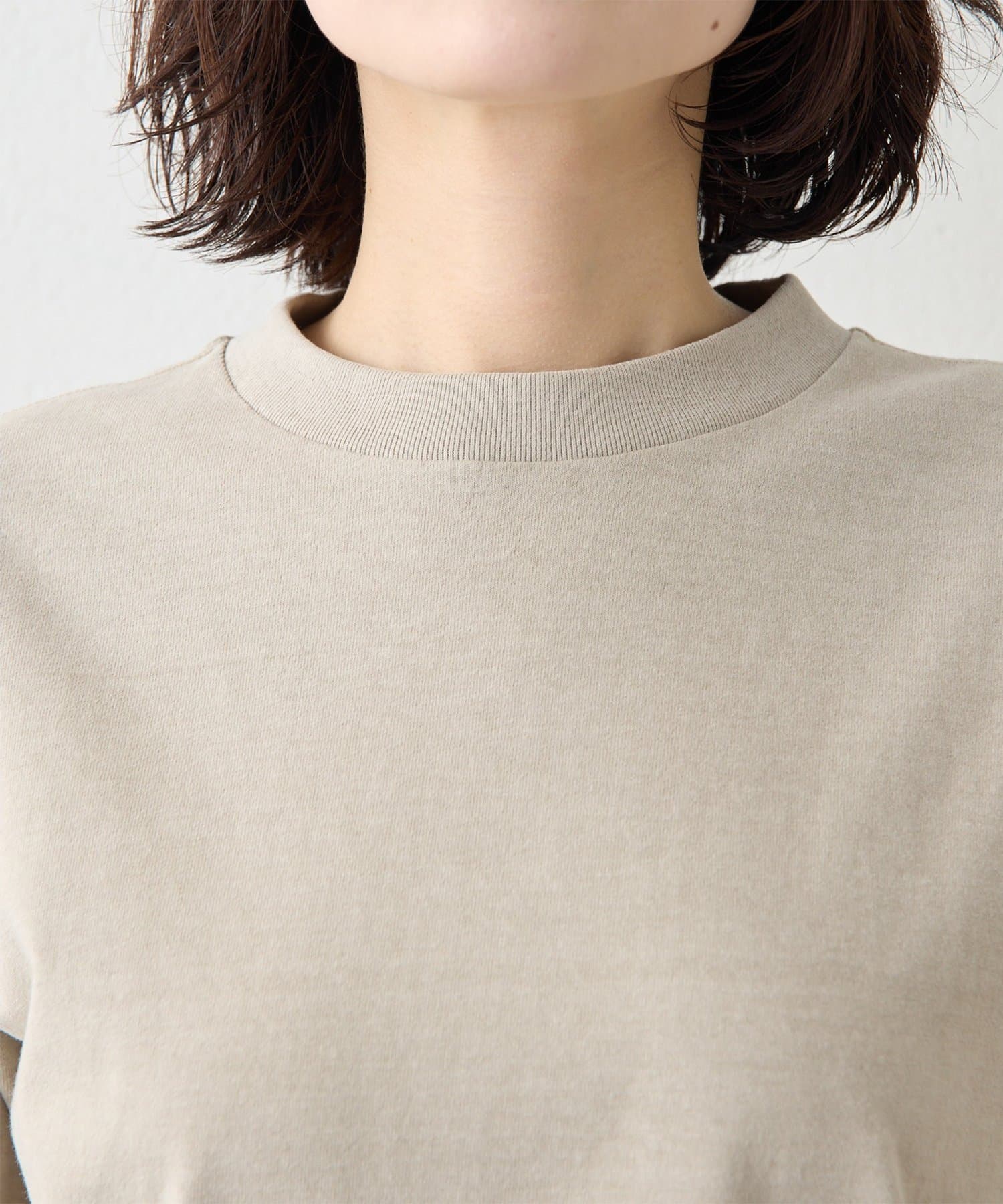 空紡糸を使用した天竺で、ヴィンテージルックを引き出すために染料のブレンドや起毛加工、タンブラー加工で表情を出した素材。