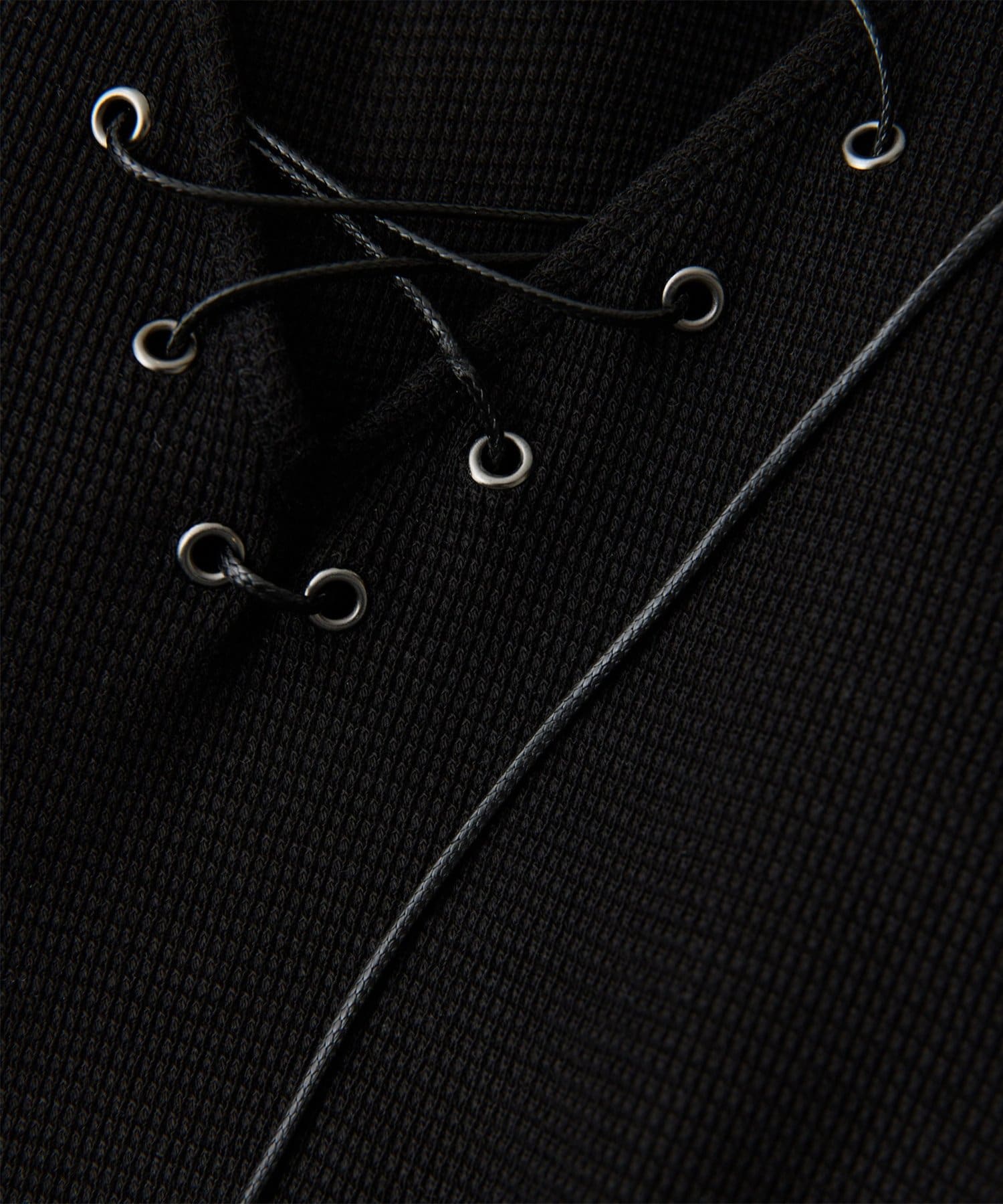 ■フロントのレースアップがスタイリングのポイントになり、紐の開き具合で印象の変化も楽しめる一枚。