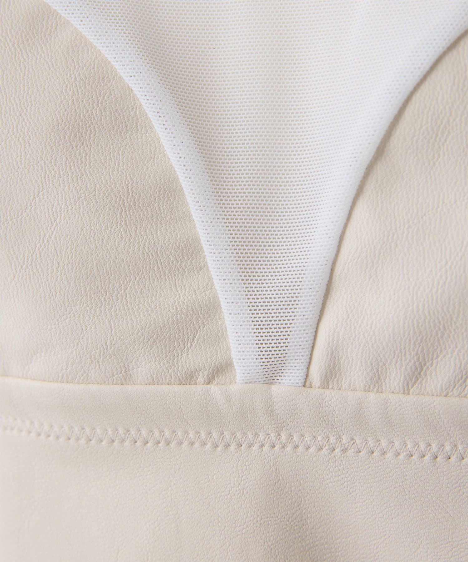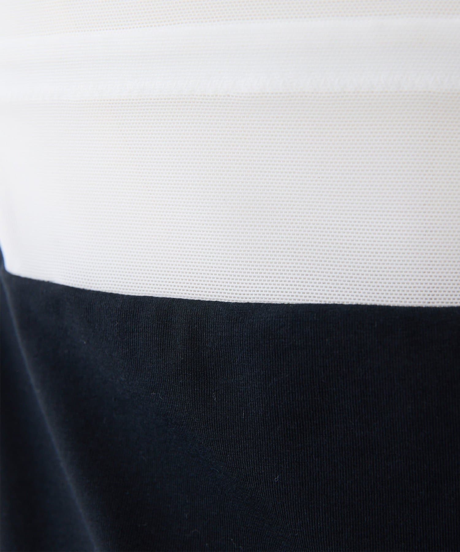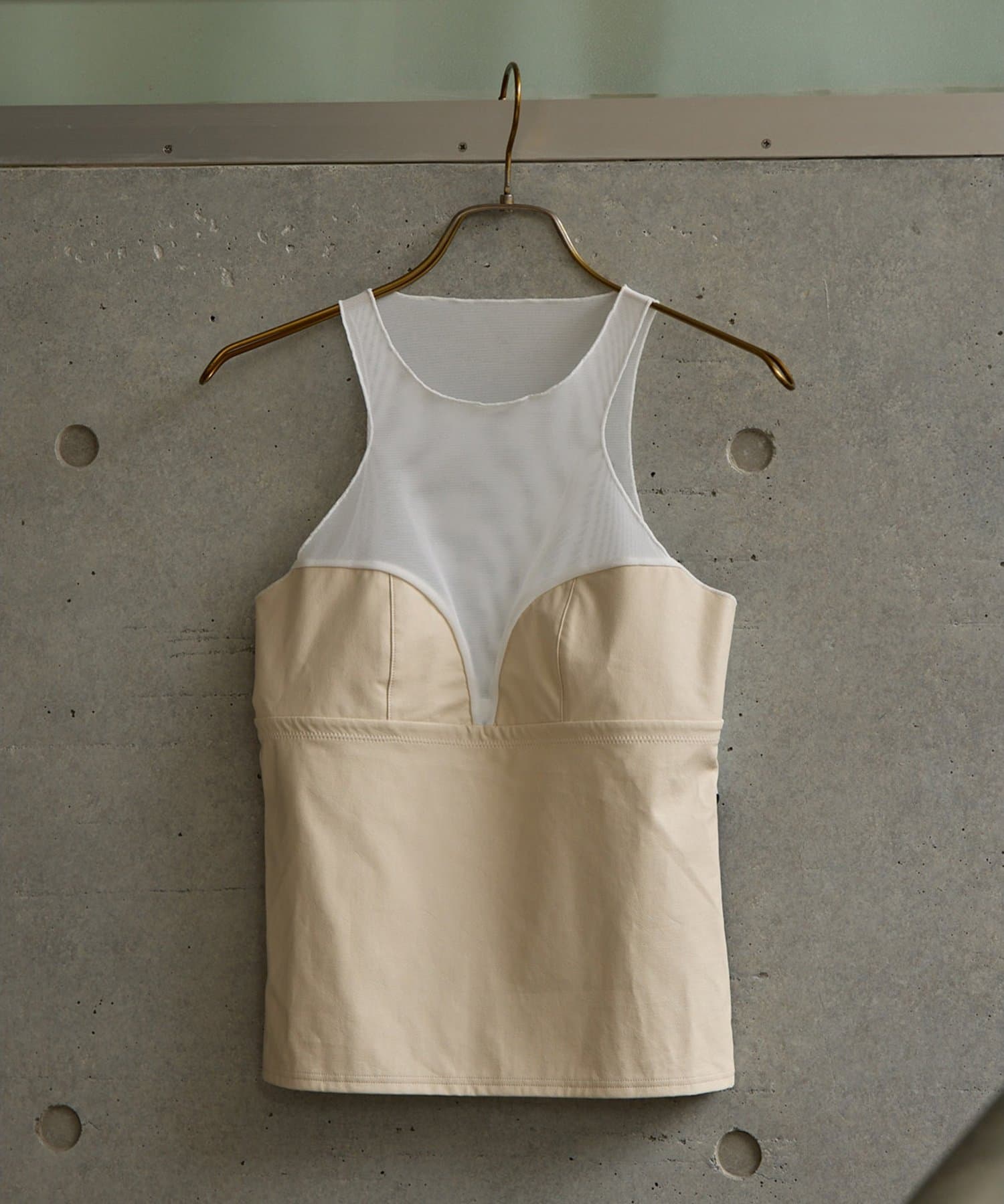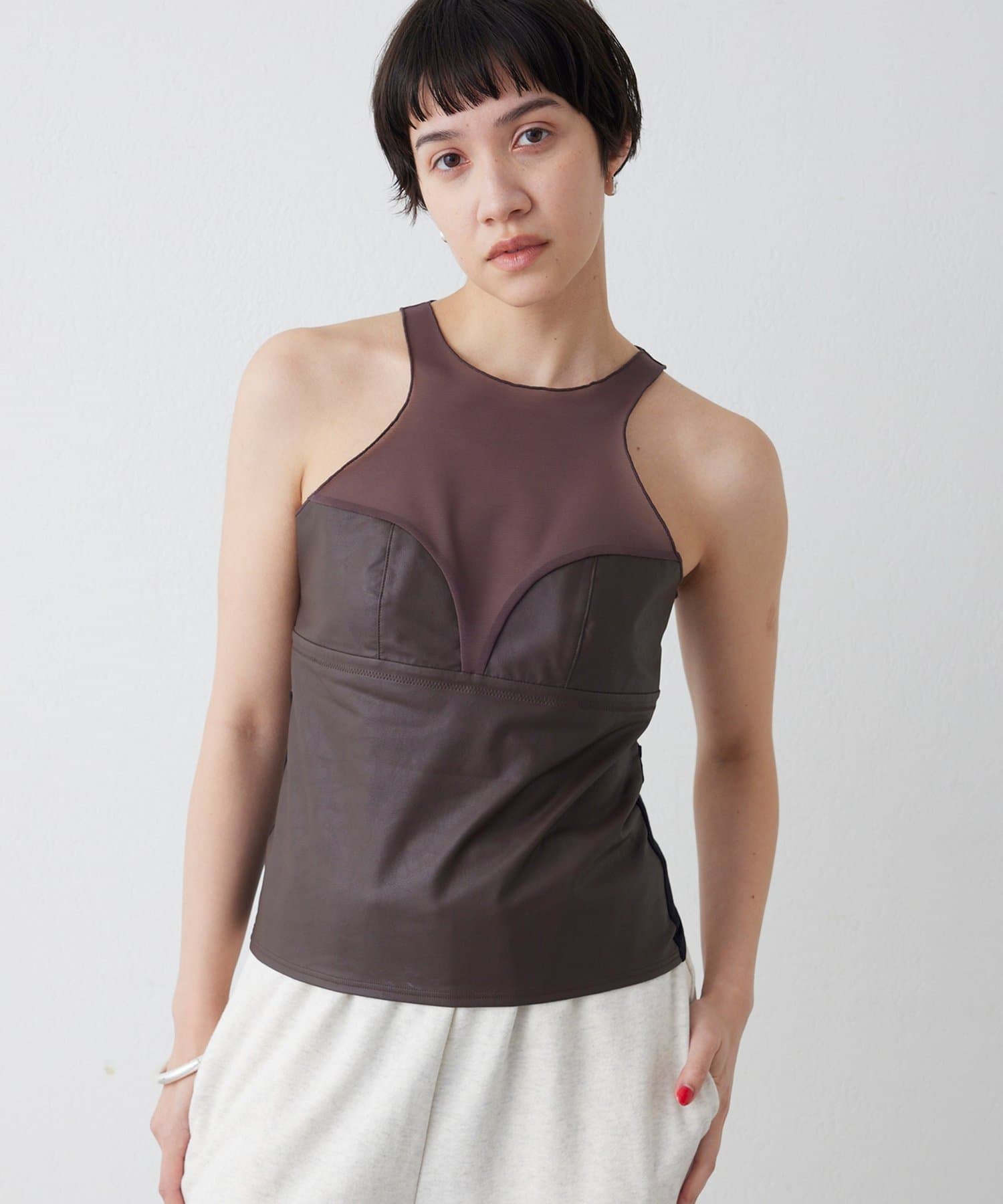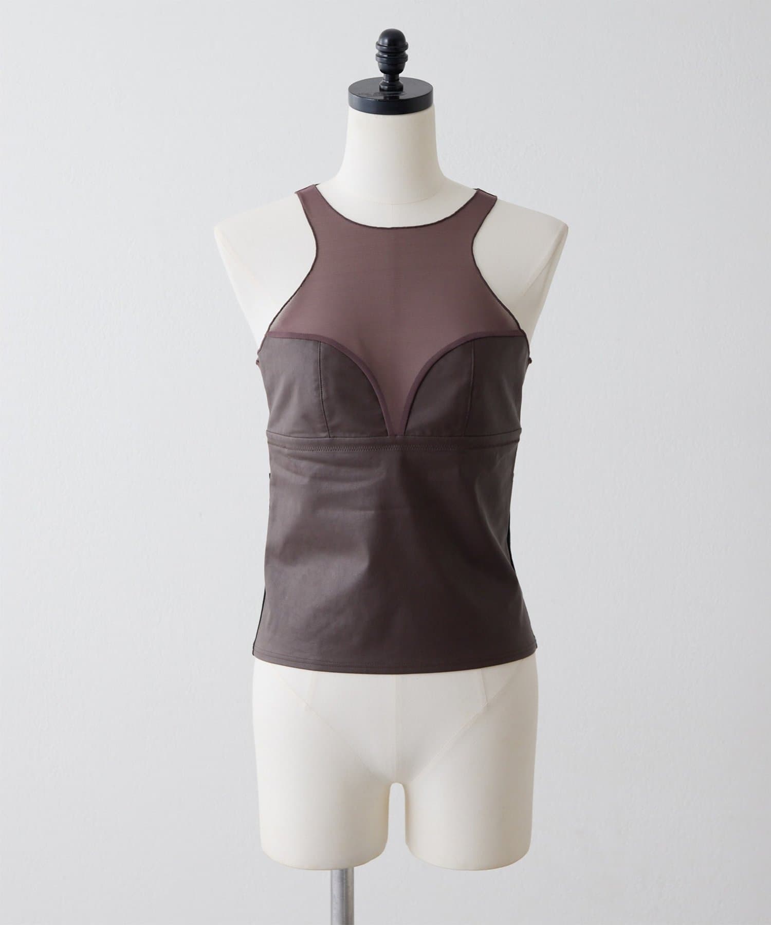 ■前身頃にはレザーライク素材を使用し、トーンを合わせたネット素材とのコントラストで甘さを抑えモードな印象に仕上げた別注デザイン。