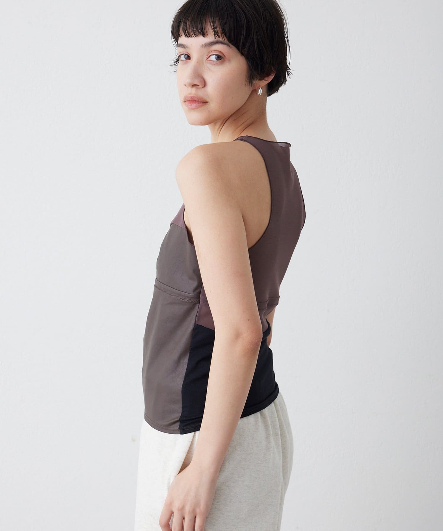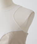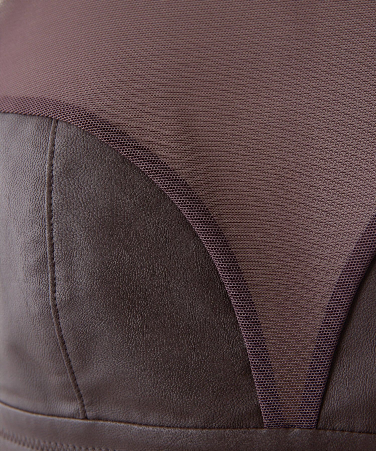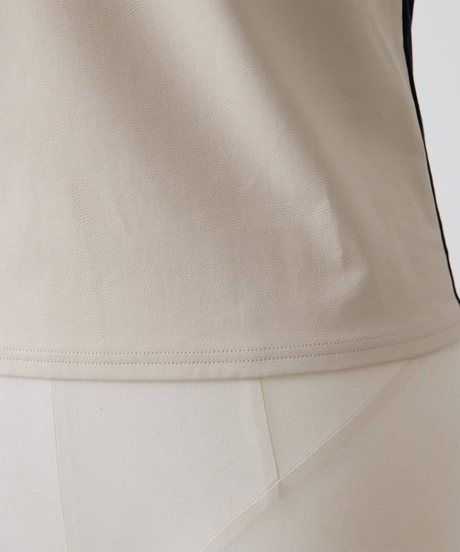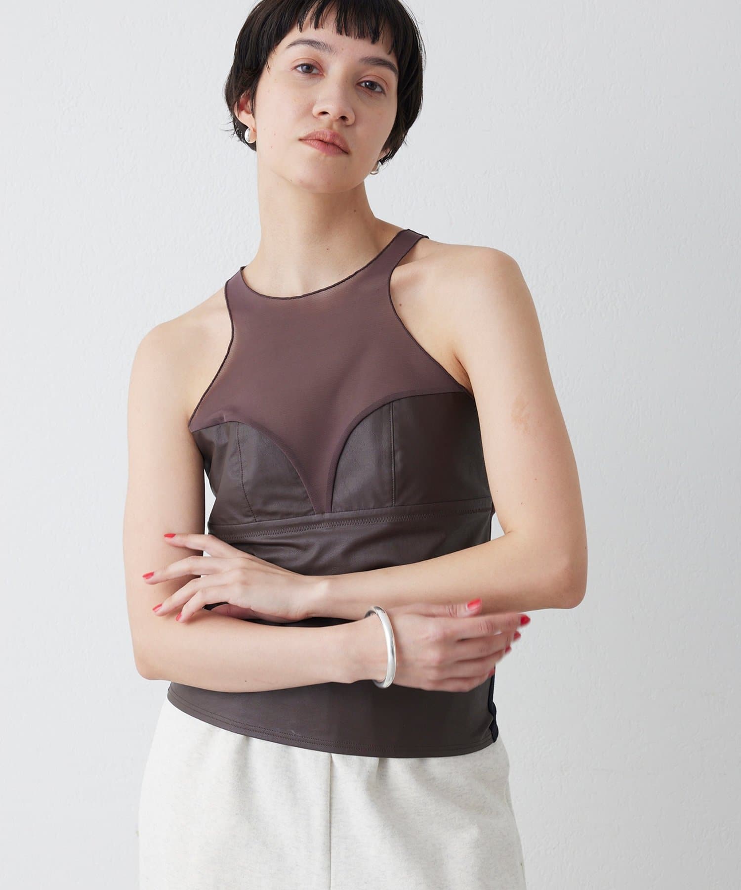 ■前身頃にはレザーライク素材を使用し、トーンを合わせたネット素材とのコントラストで甘さを抑えモードな印象に仕上げた別注デザイン。