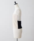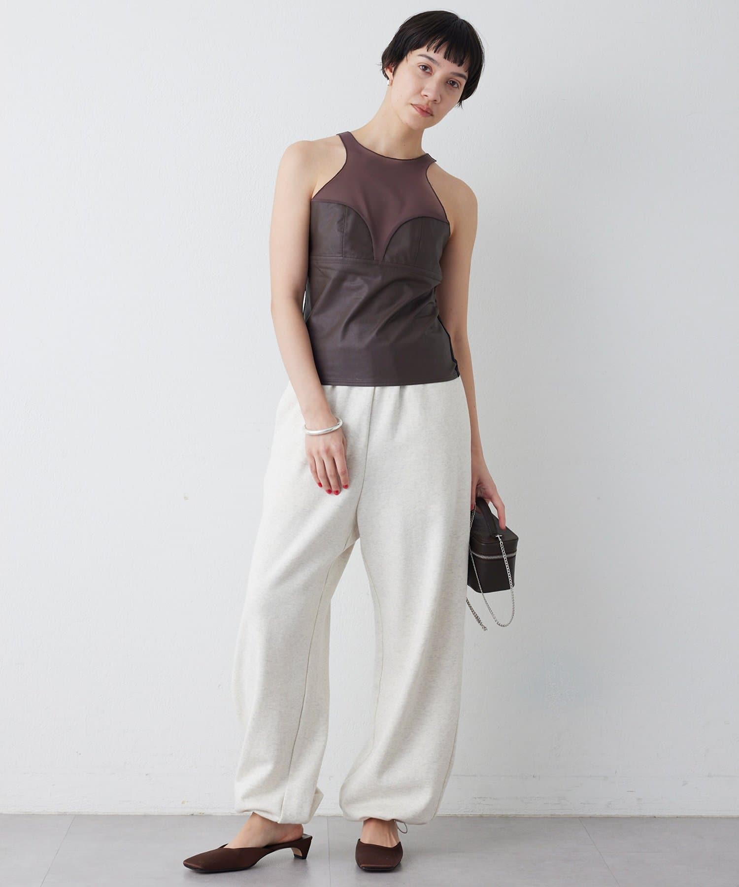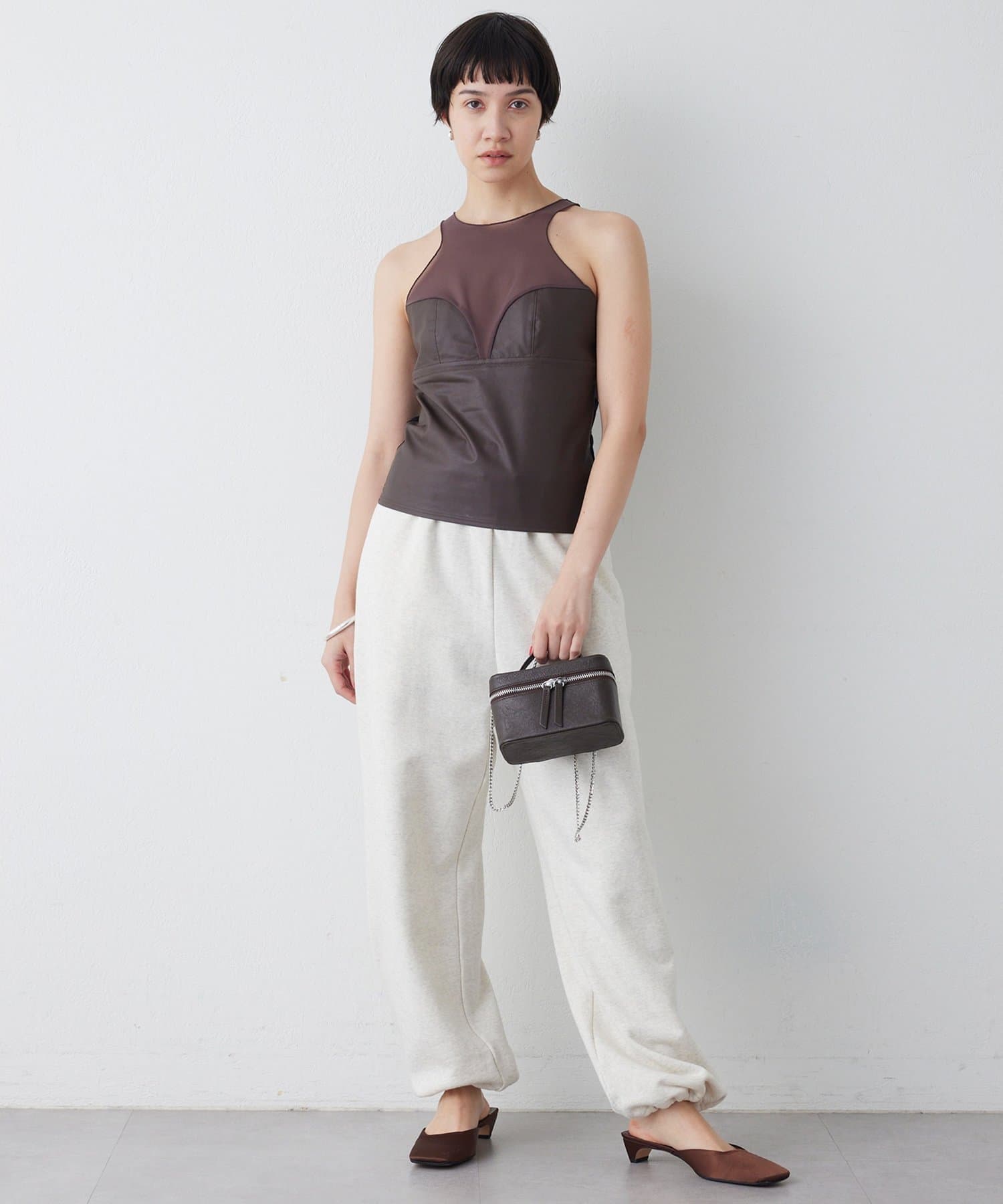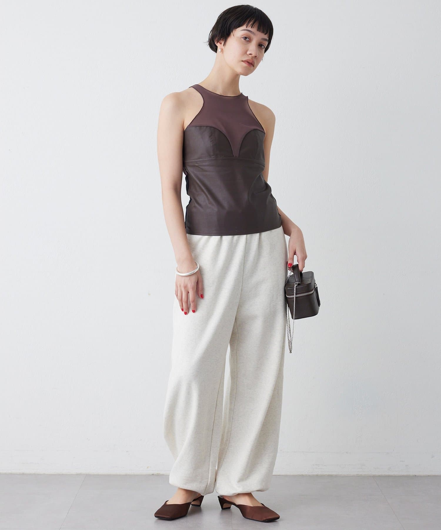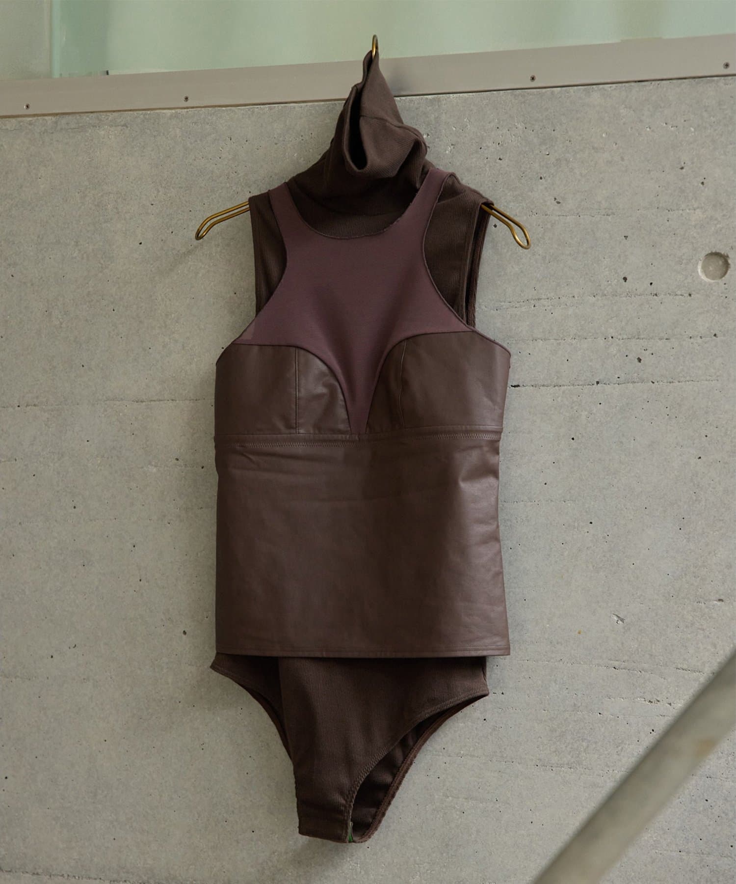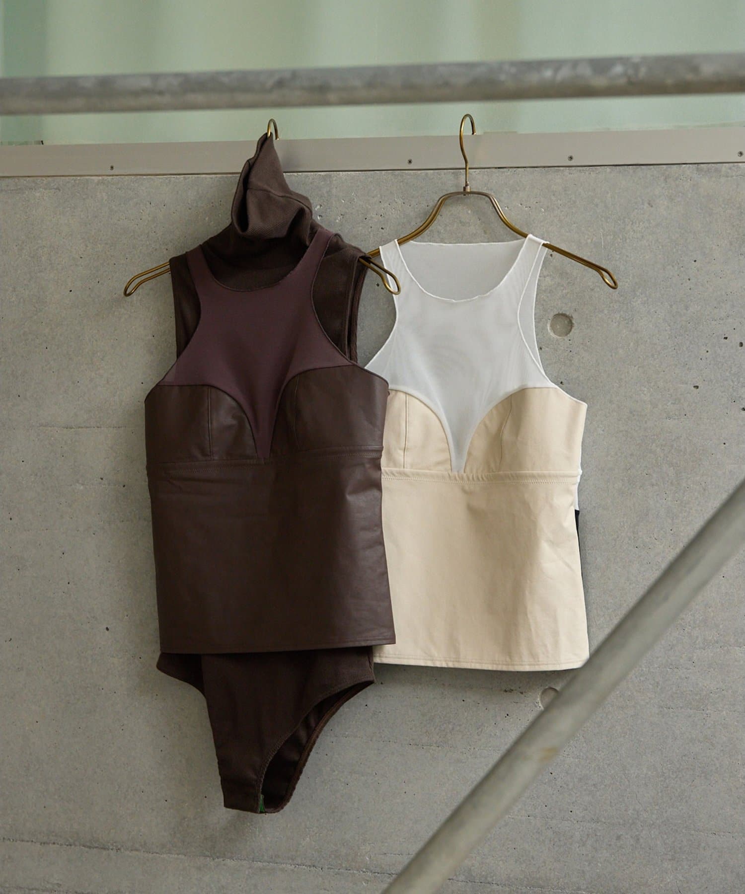 ■前身頃にはレザーライク素材を使用し、トーンを合わせたネット素材とのコントラストで甘さを抑えモードな印象に仕上げた別注デザイン。