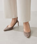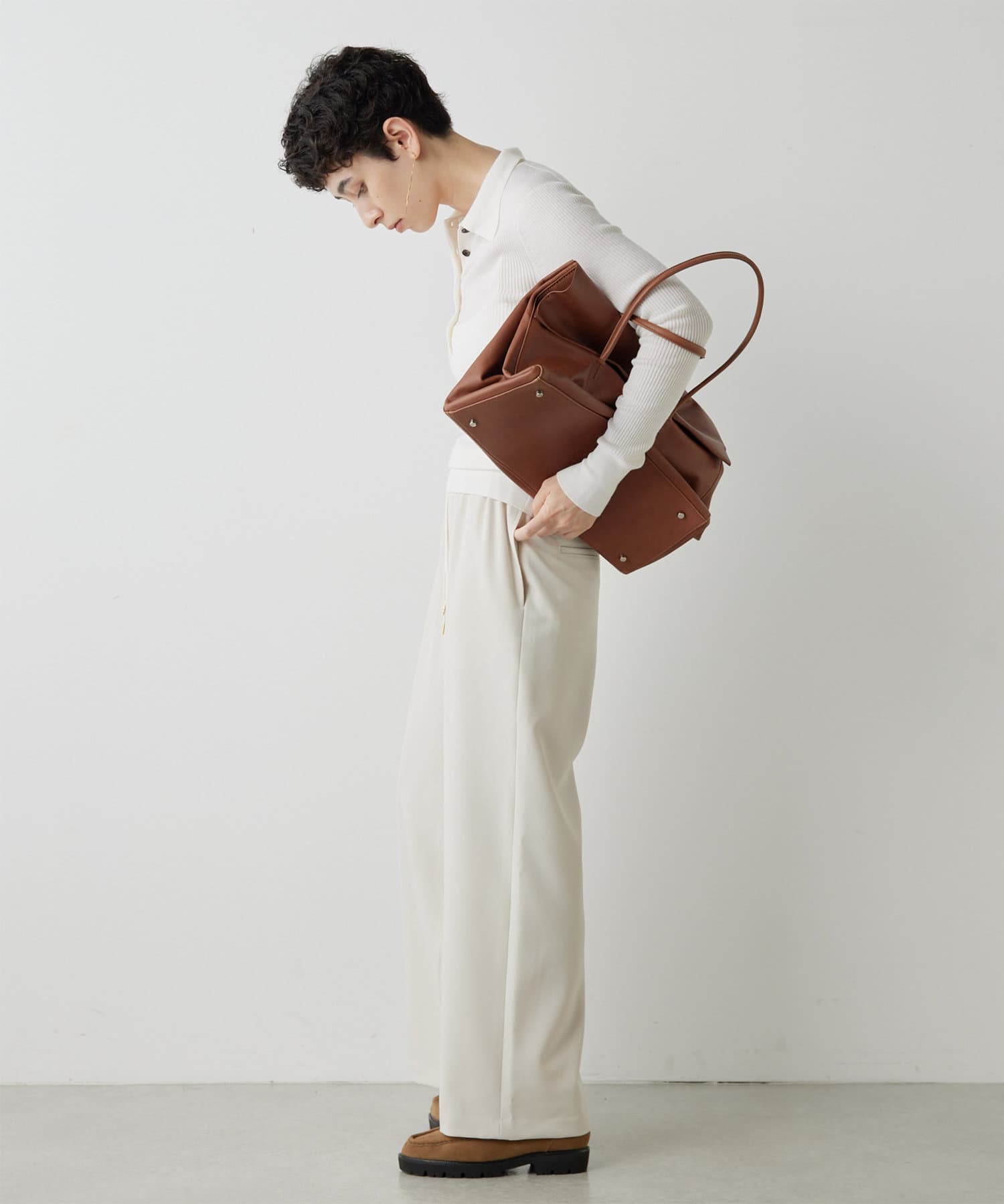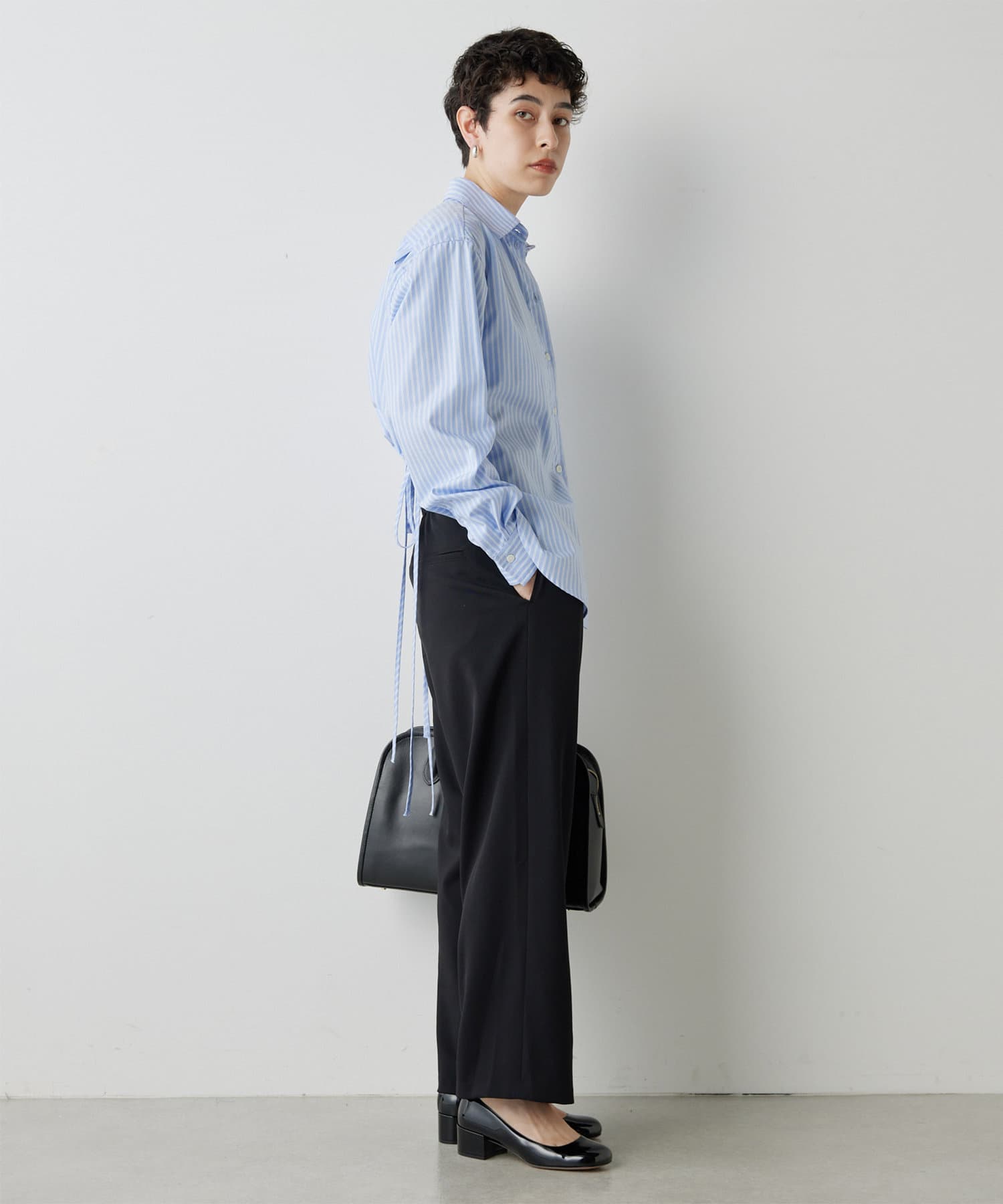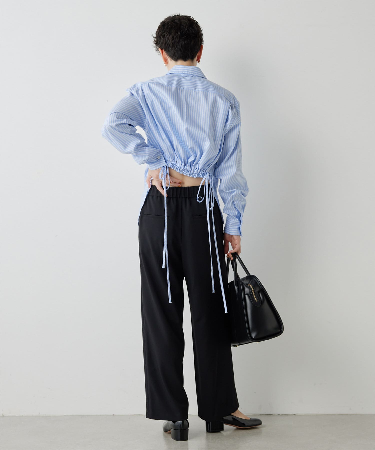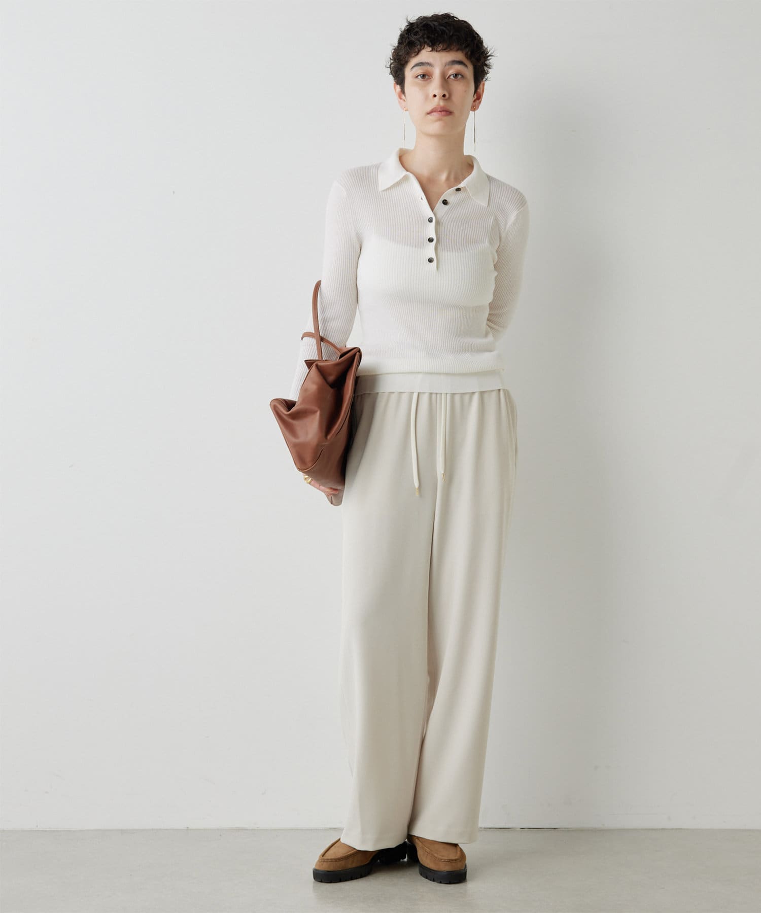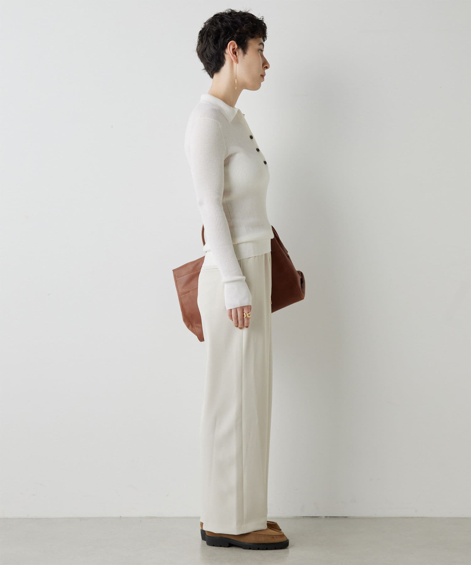 ■ドロスト仕様のウエストが抜け感をプラスし、ゴールドのループトップも着こなしのアクセントに。
