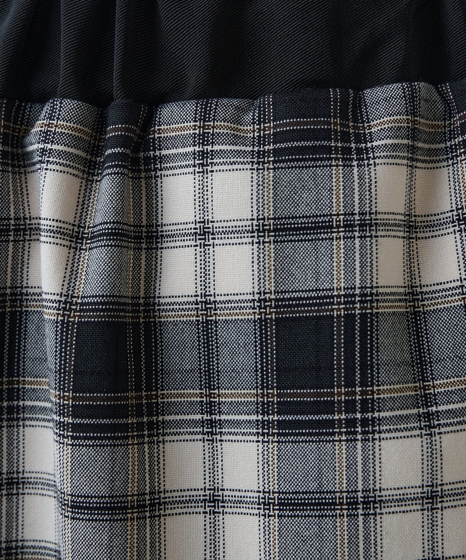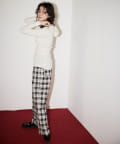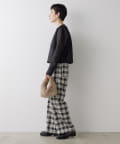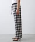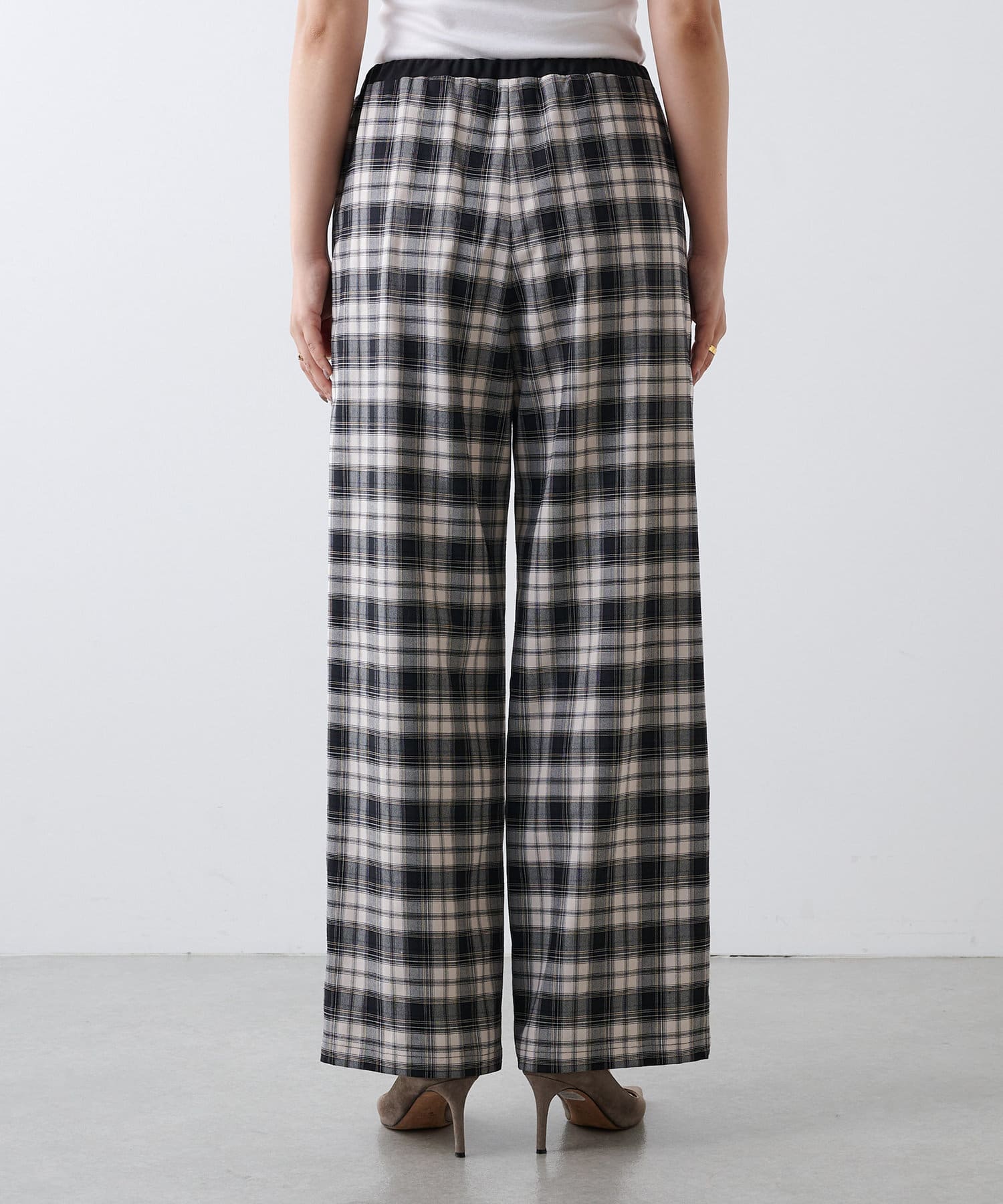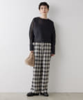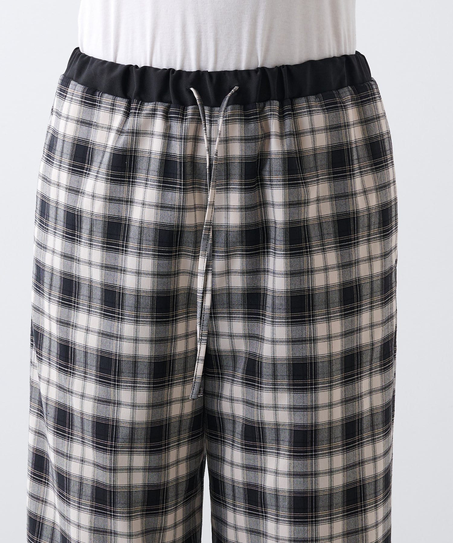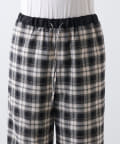 ■ストライプ柄のグレー、チェック柄のブラックの2色展開で、ウエスト部分は配色でアクセントに。