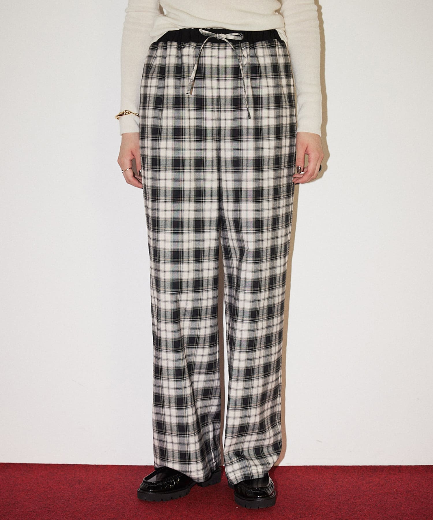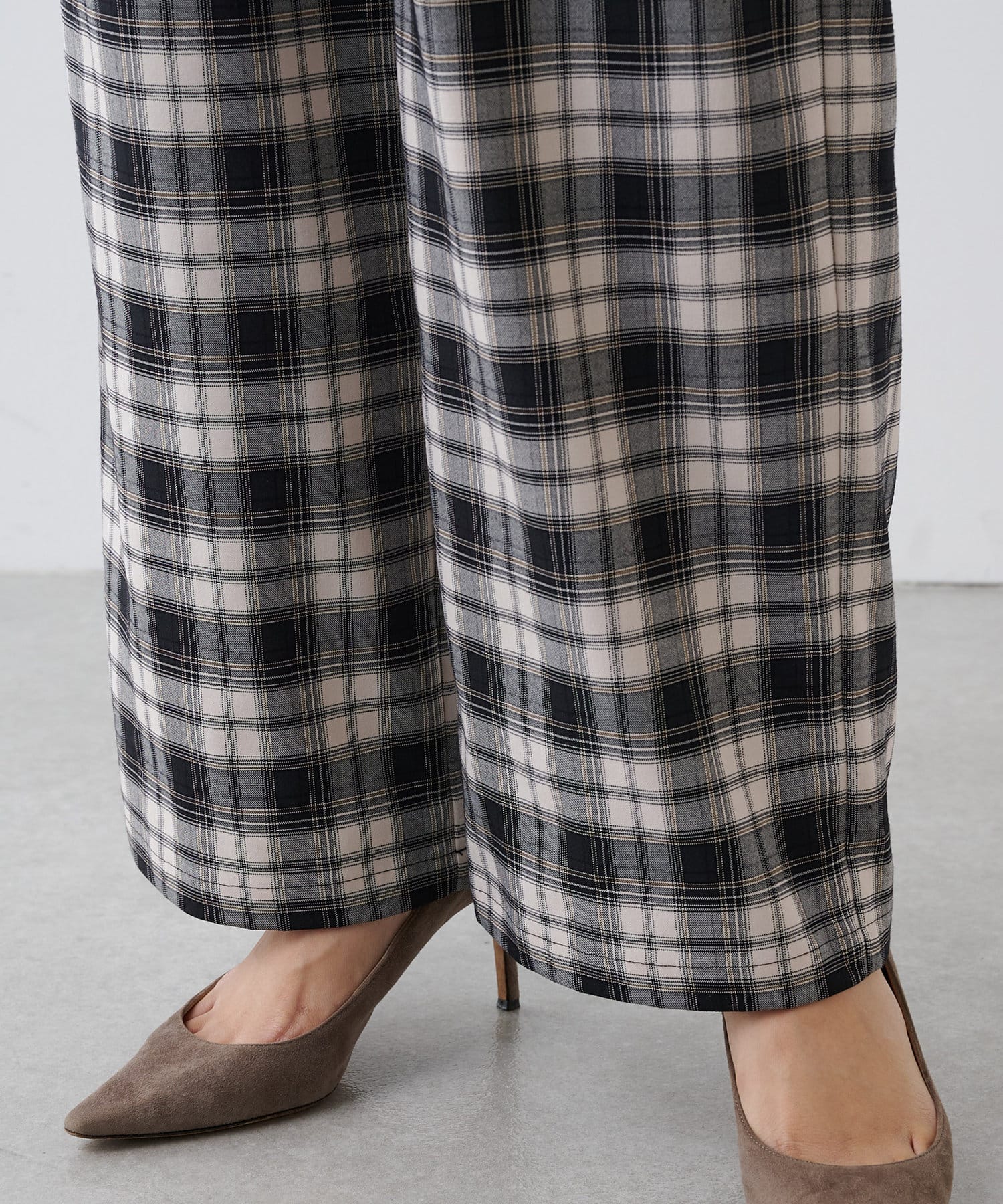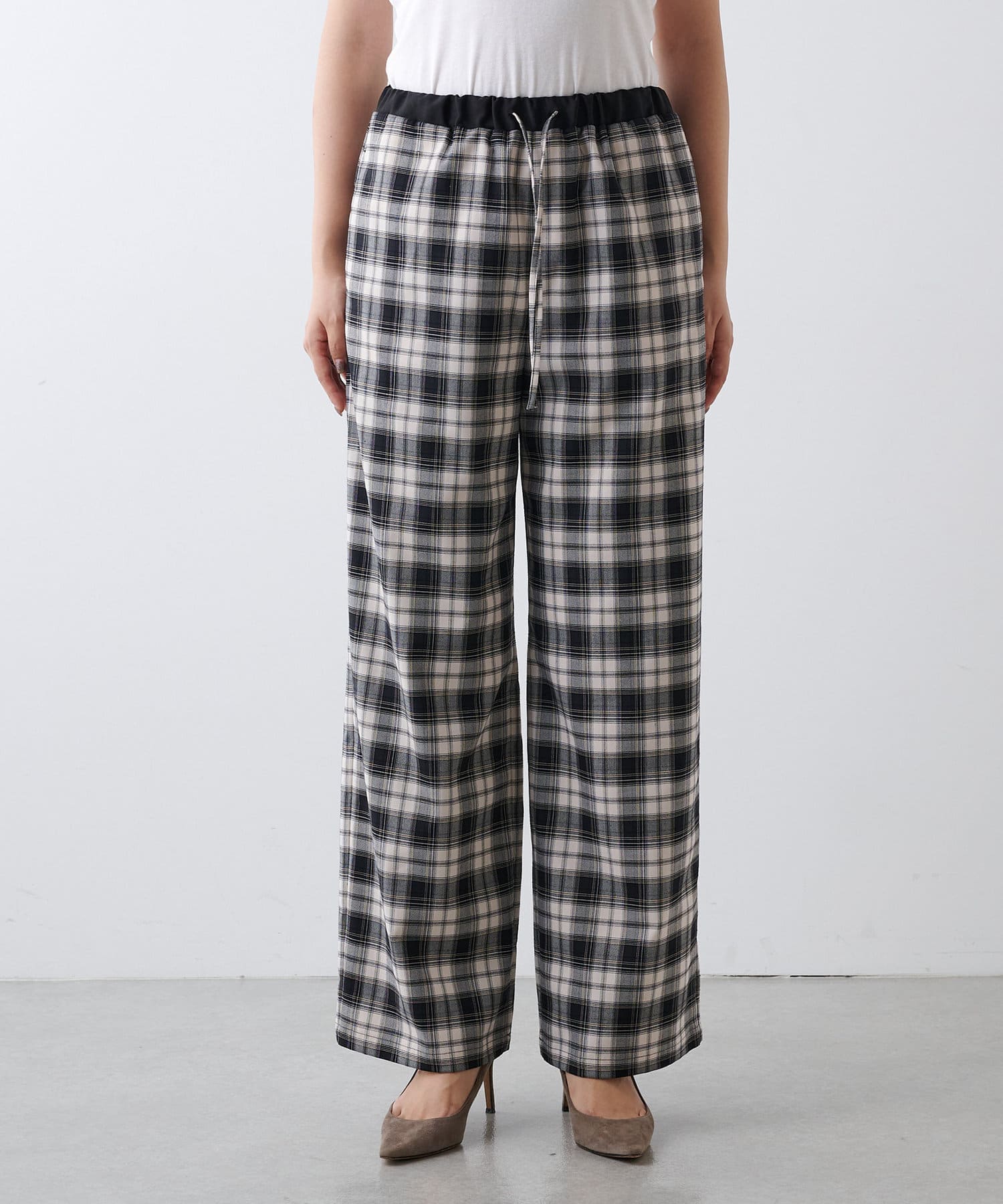 ■ストライプ柄のグレー、チェック柄のブラックの2色展開で、ウエスト部分は配色でアクセントに。