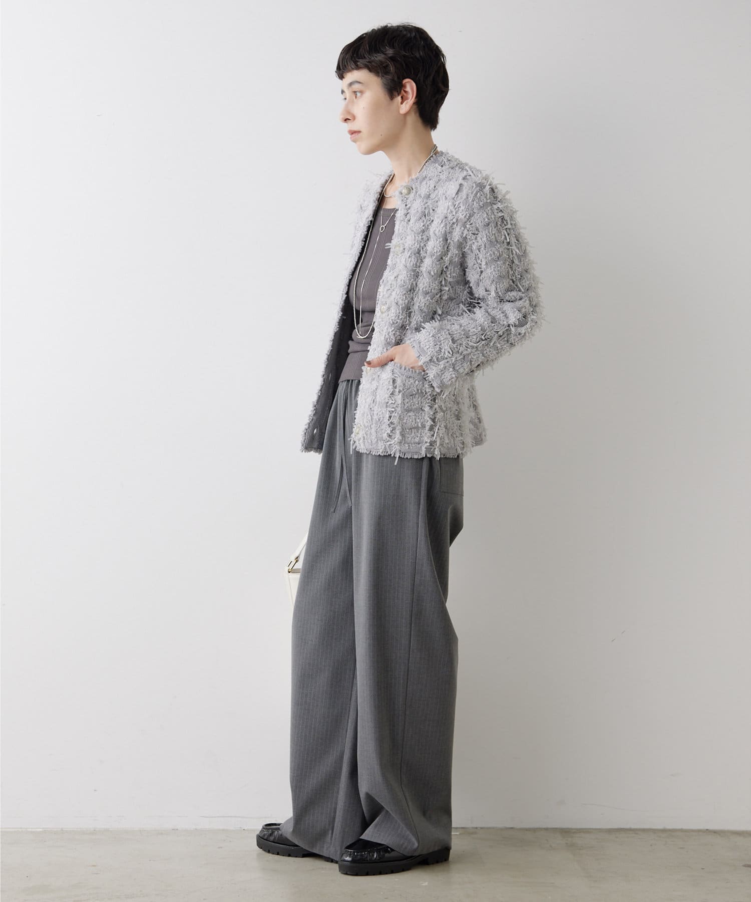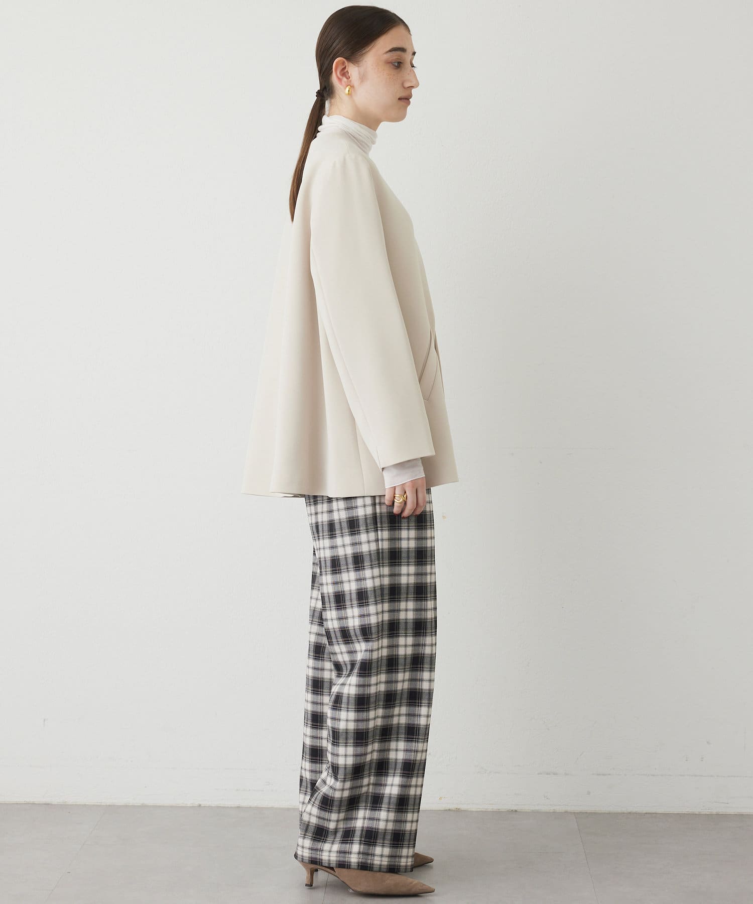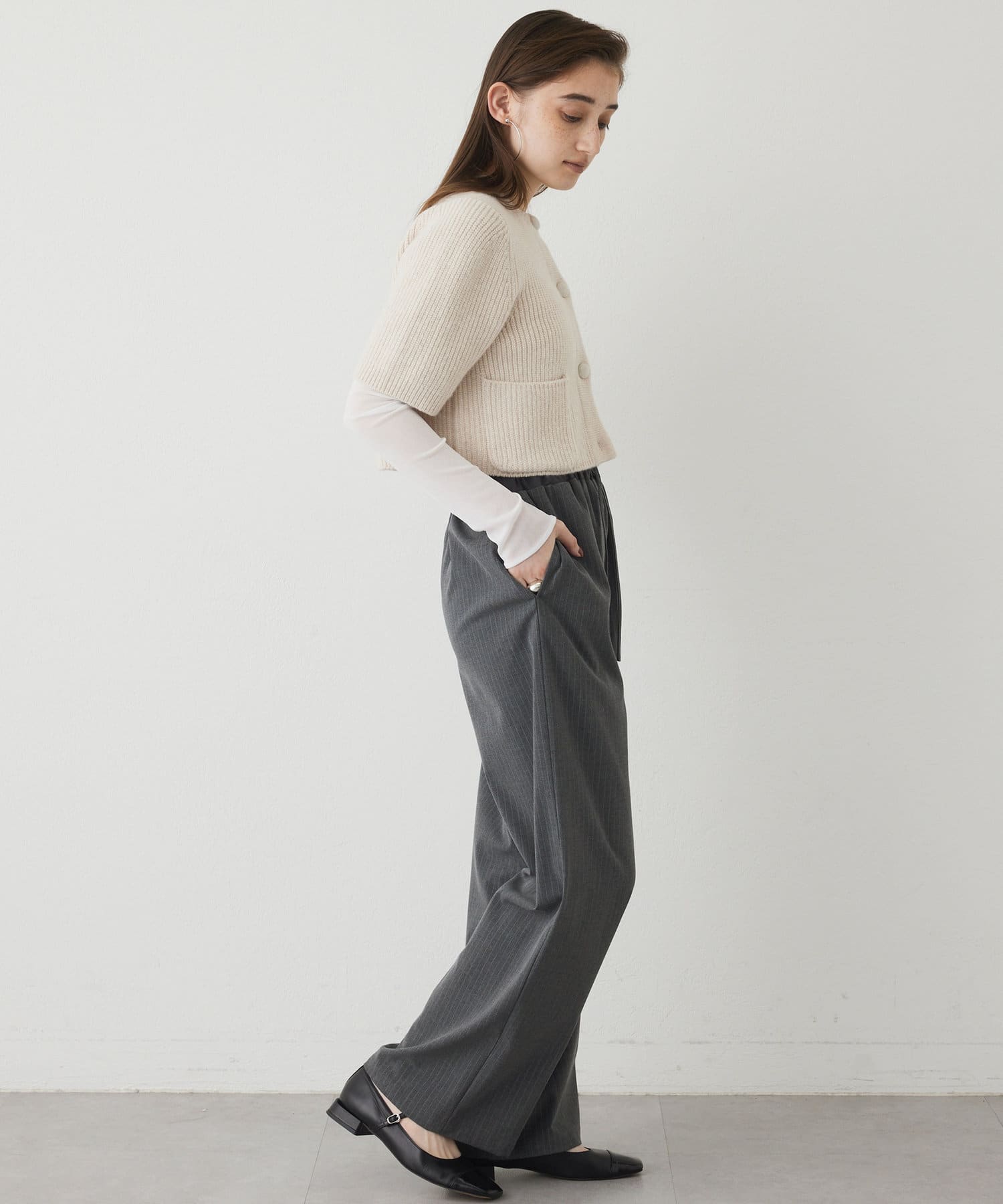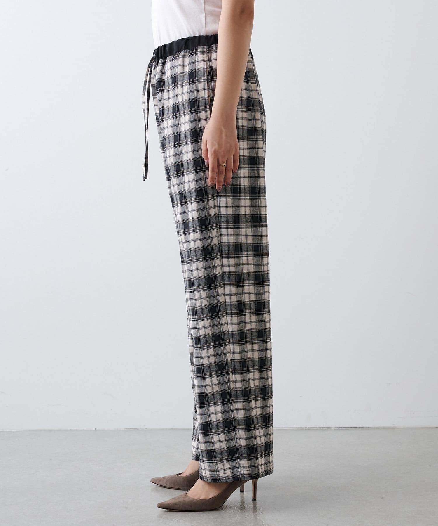 ■やや厚手でハリのある素材を使用することでシルエットがきれいで、イージーな履き心地ながらカジュアルになりすぎない一枚。
