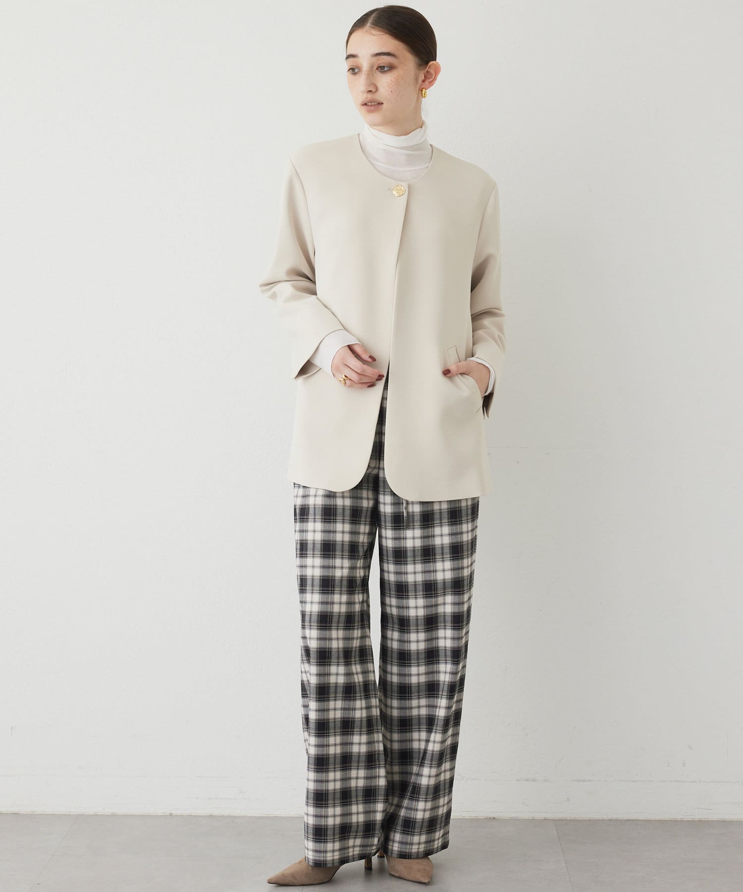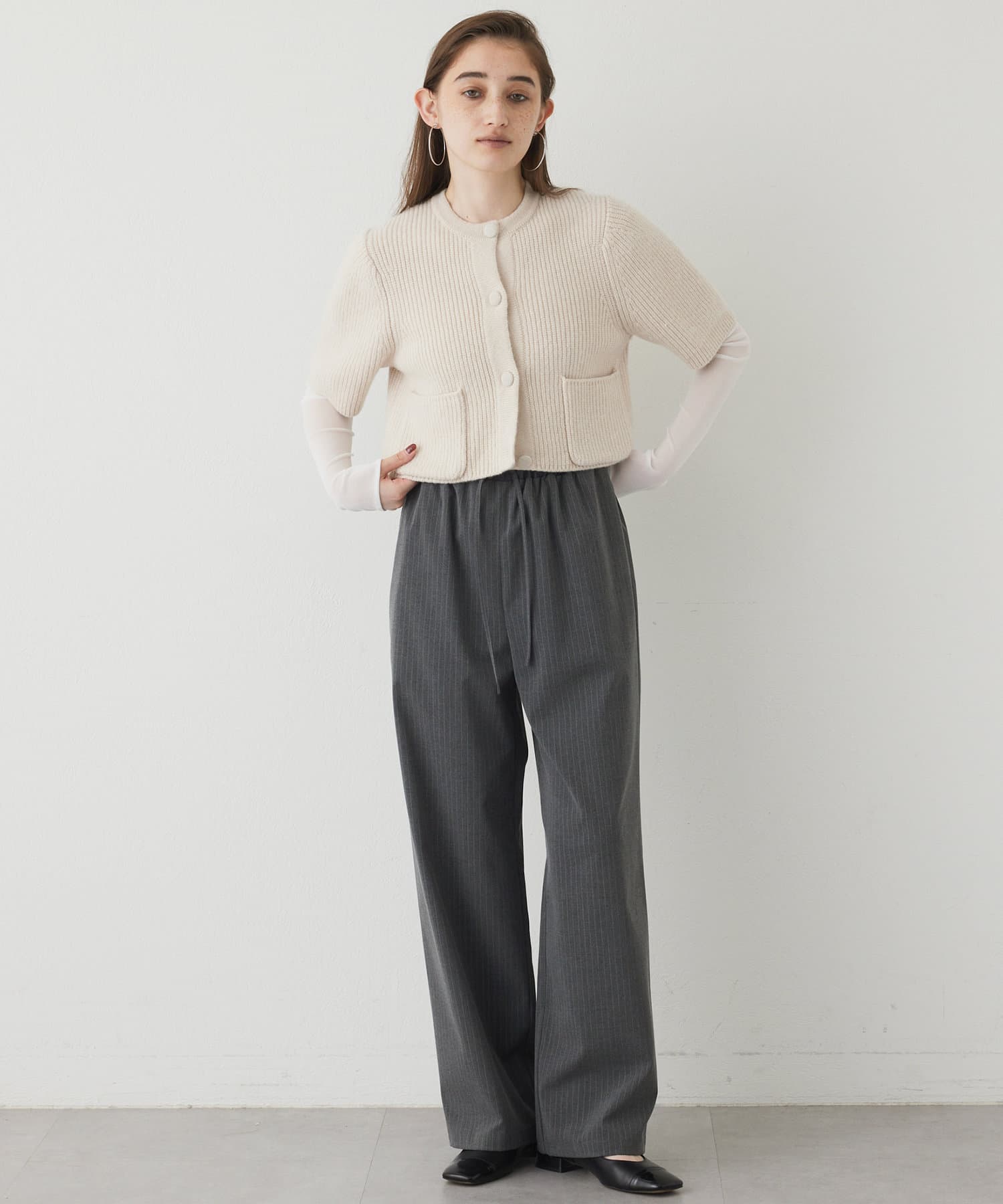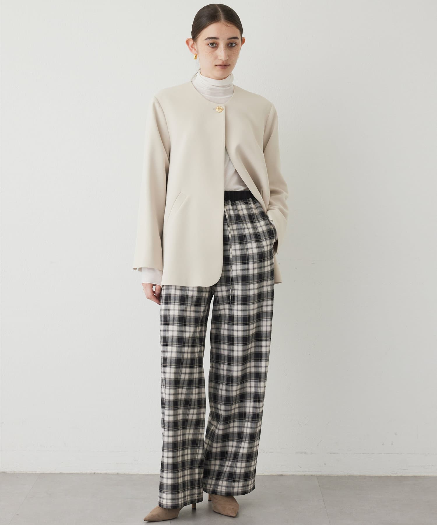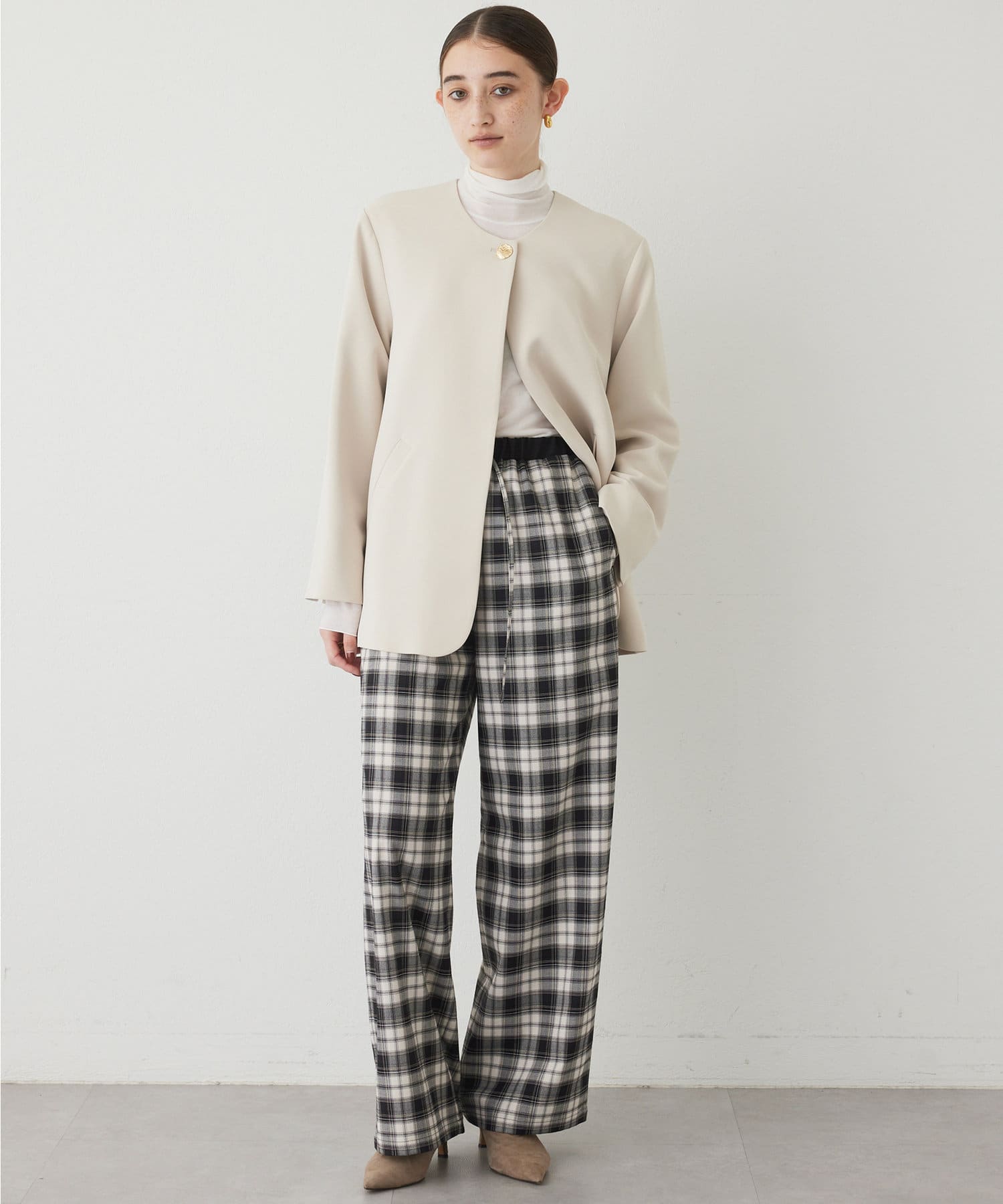 ■やや厚手でハリのある素材を使用することでシルエットがきれいで、イージーな履き心地ながらカジュアルになりすぎない一枚。