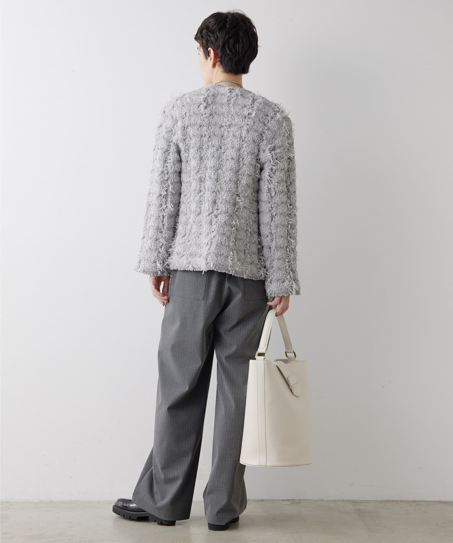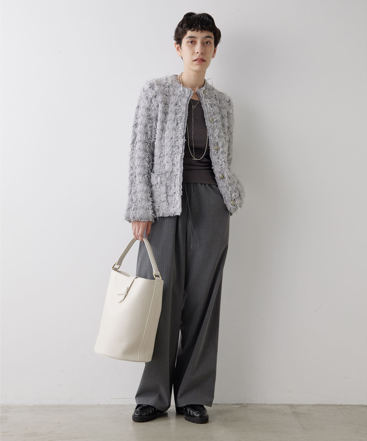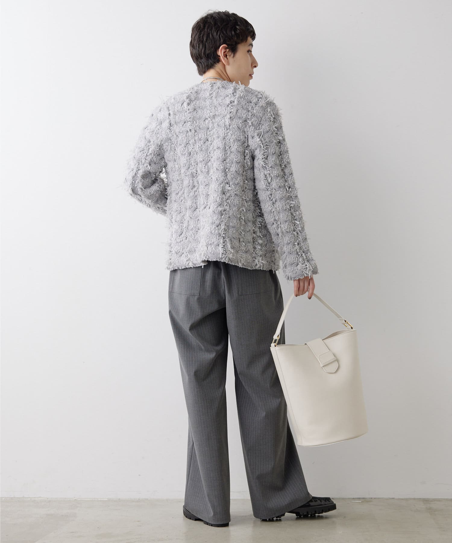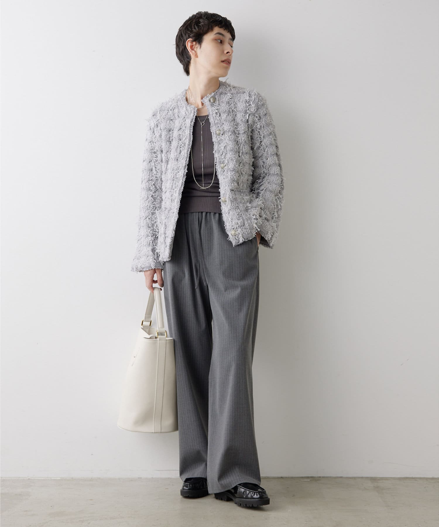 ■やや厚手でハリのある素材を使用することでシルエットがきれいで、イージーな履き心地ながらカジュアルになりすぎない一枚。