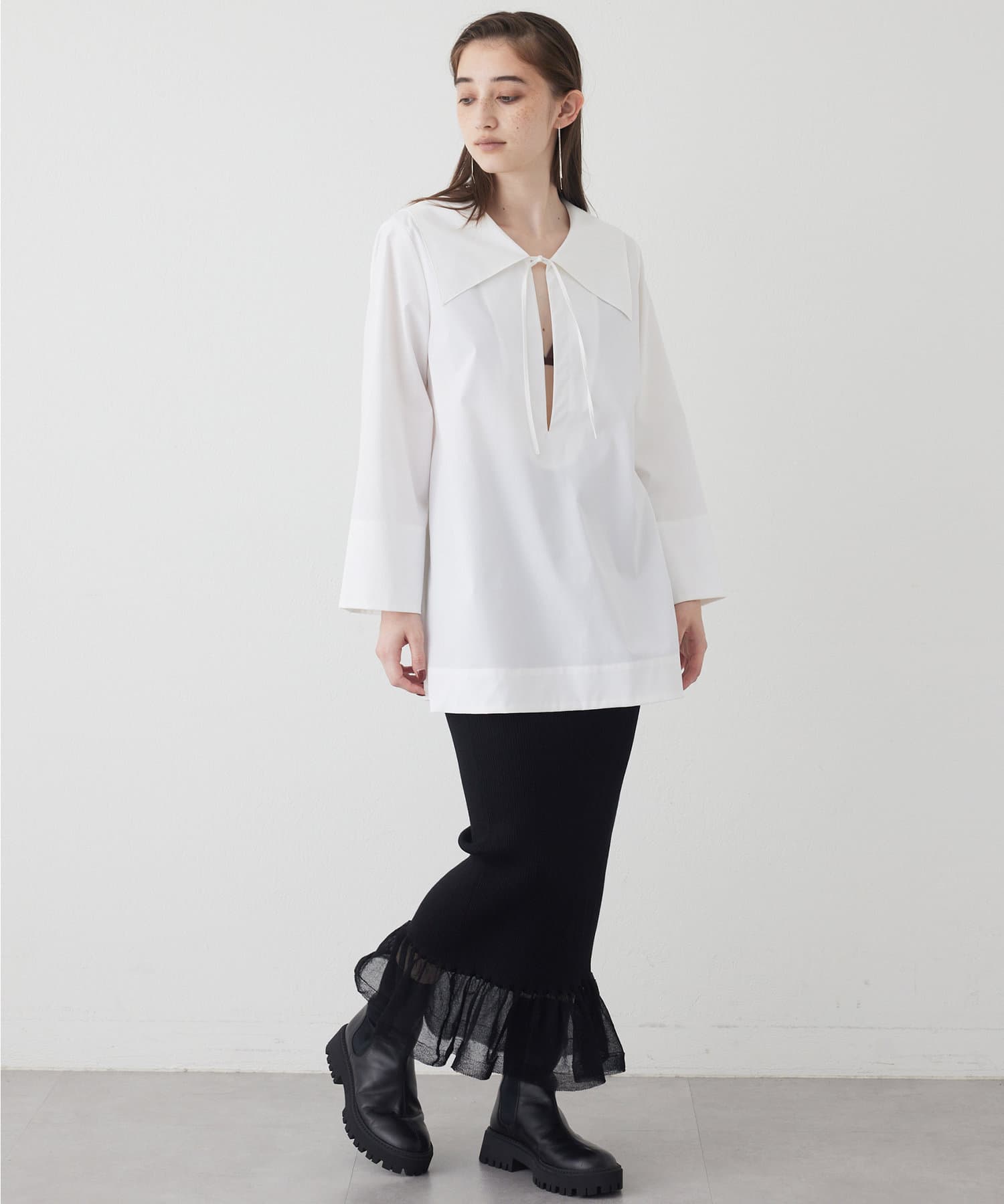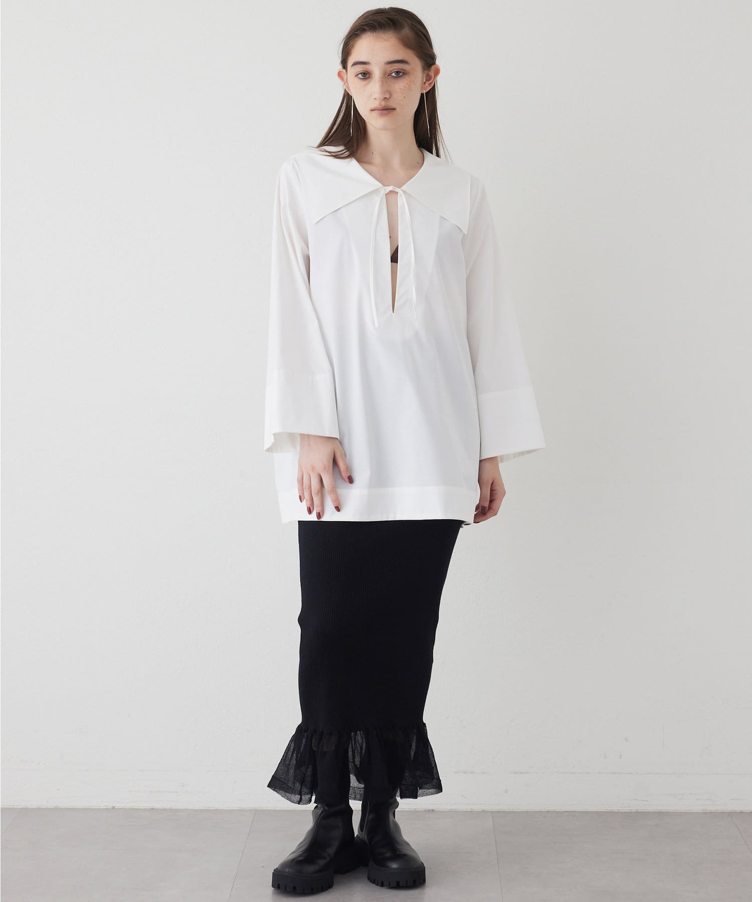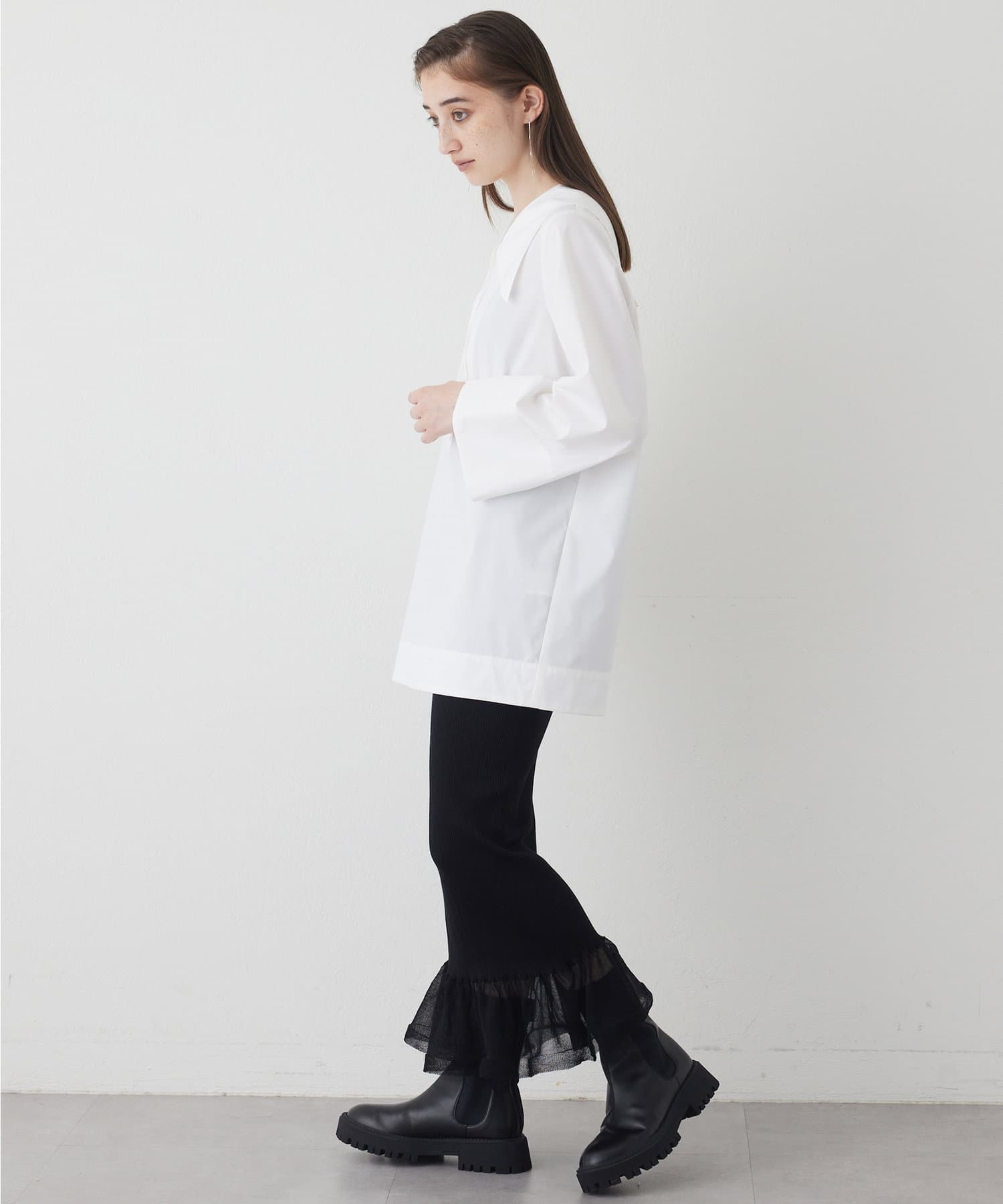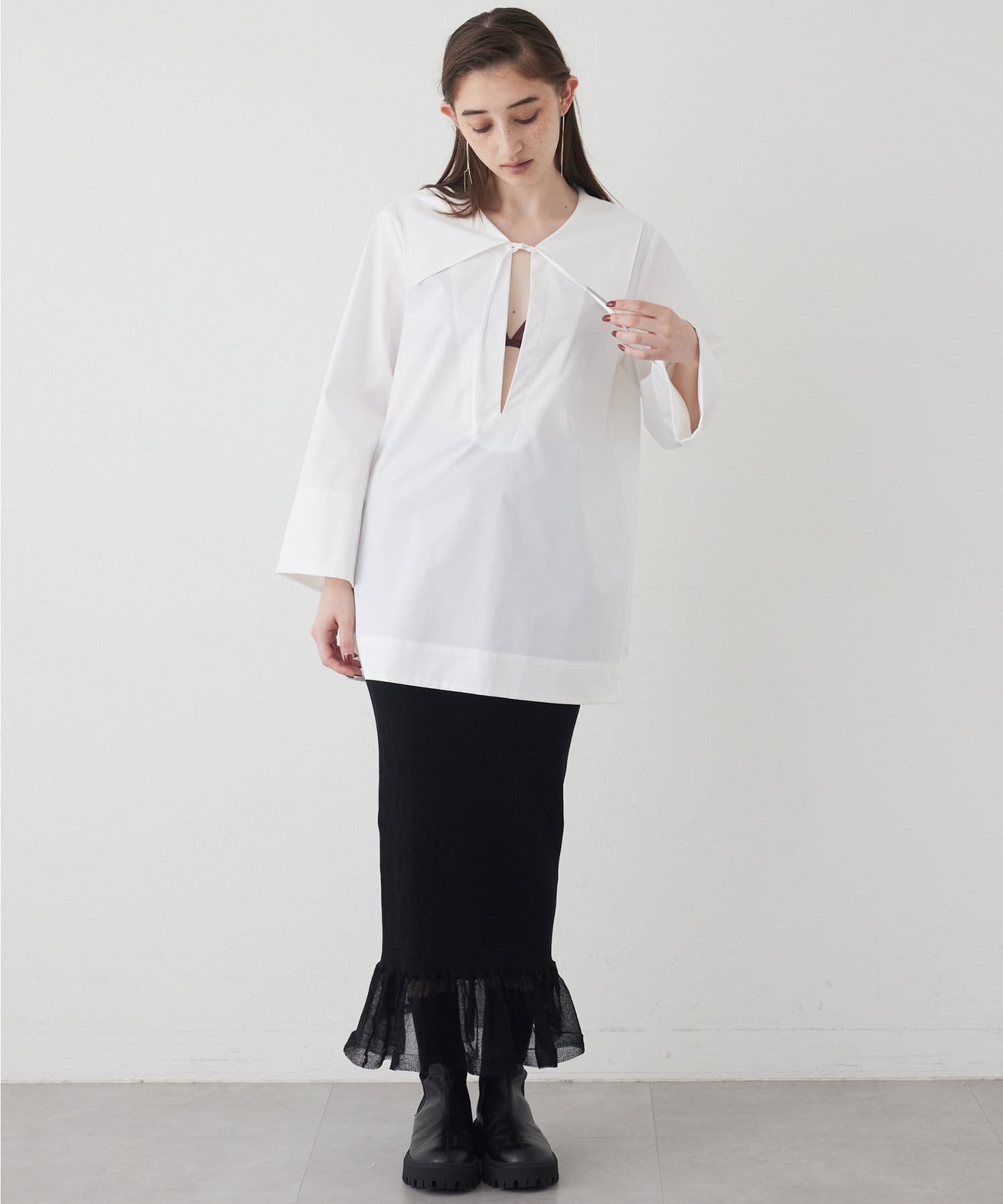 ■胸元には深めのスリットを入れ、インナーを見せたりタートルを合わせたり重ね着を楽しめるデザインに。