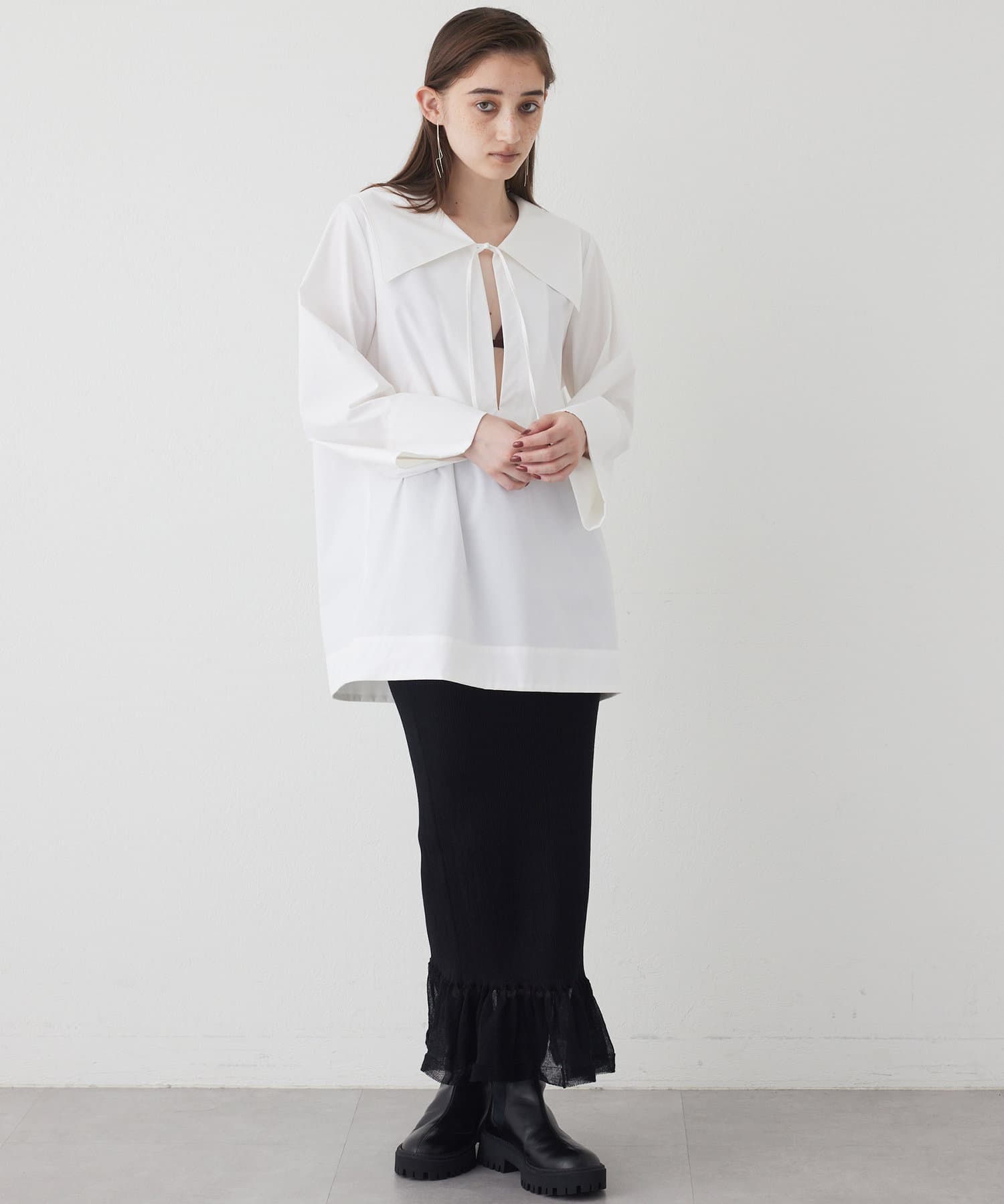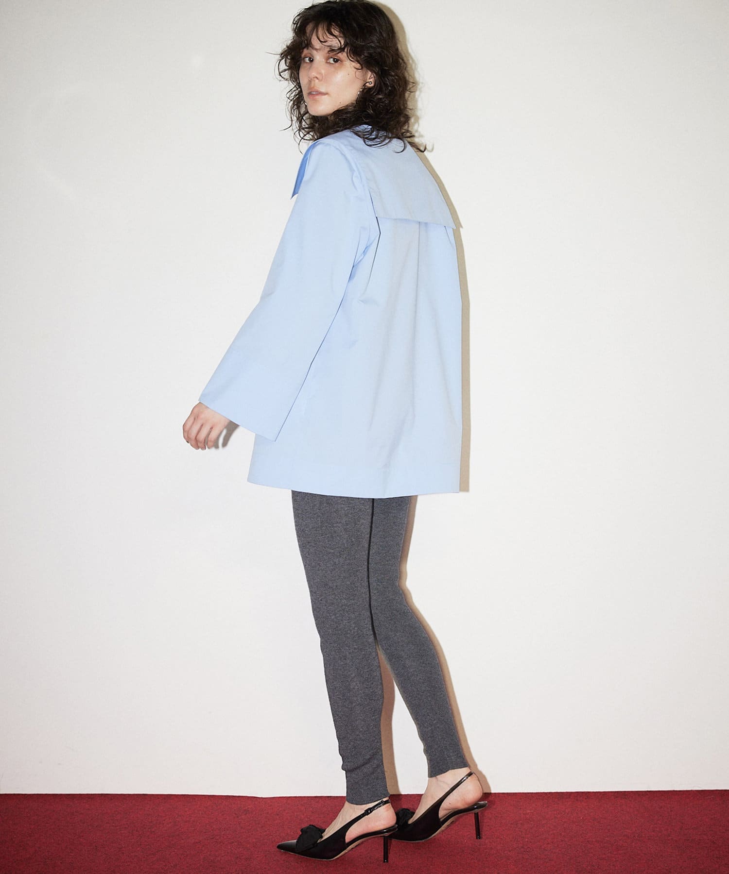 ■上からニットやジャケットを重ねて襟をポイントにした着こなしもおすすめ。