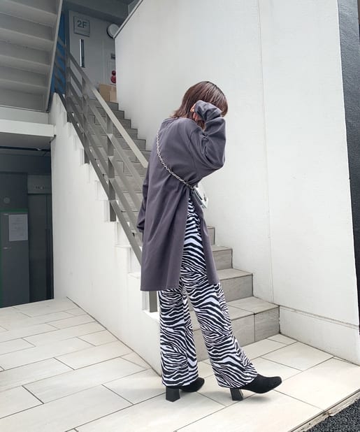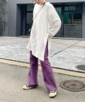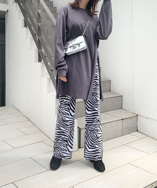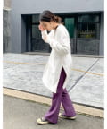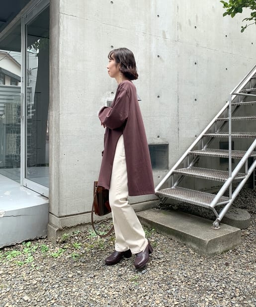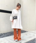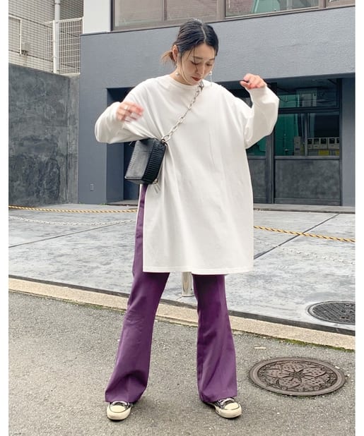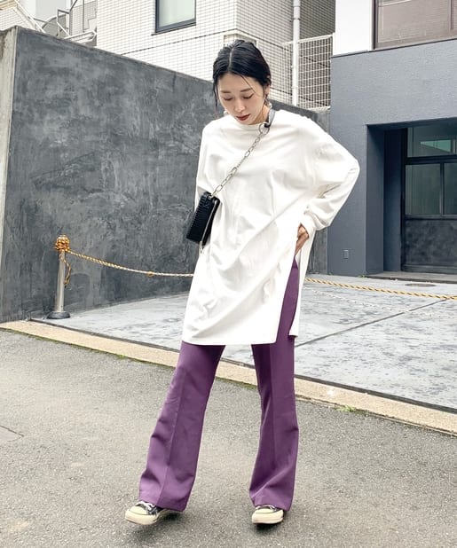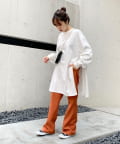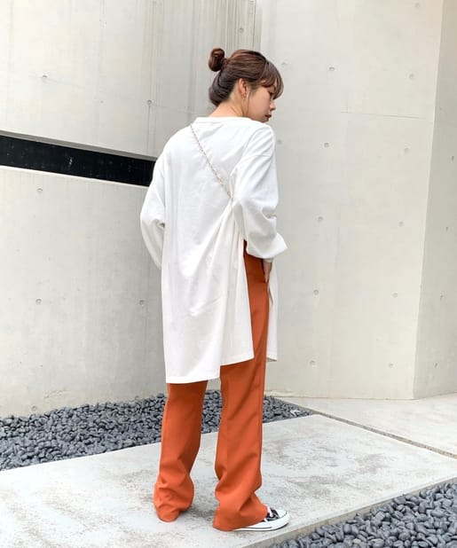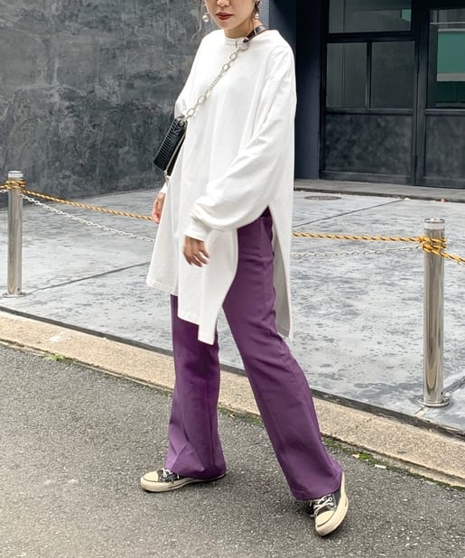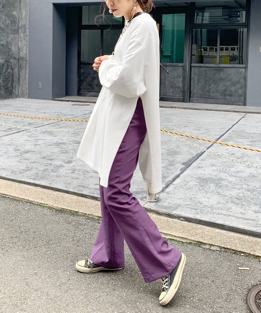 ・カラーパンツや柄物のスカート等をサイドスリットからチラっと見せるとよりオシャレなコーデに!