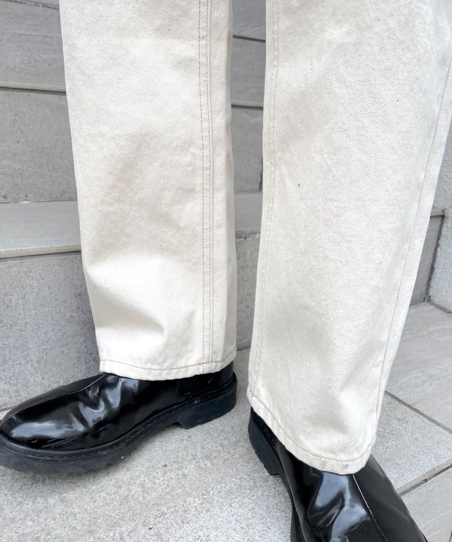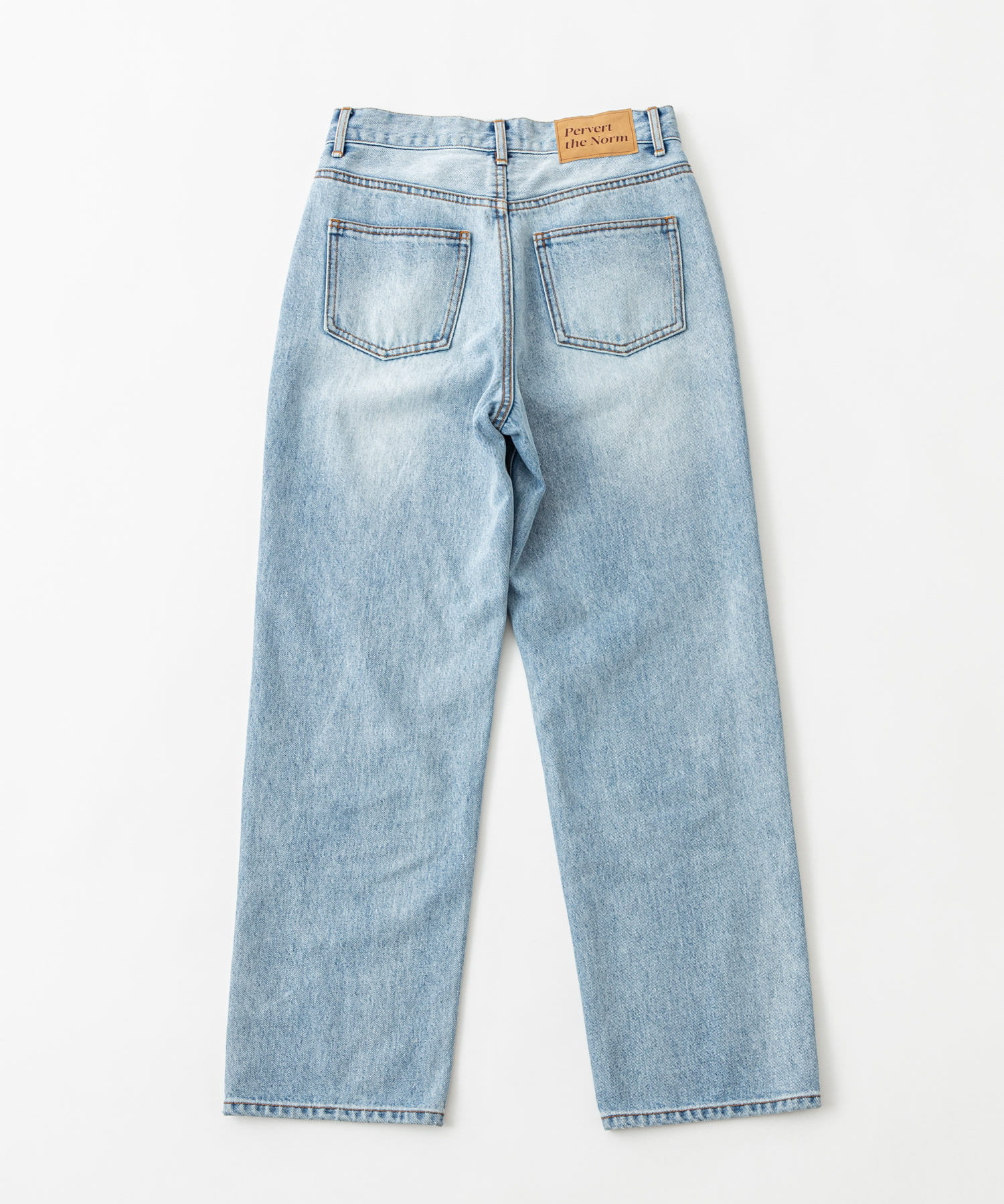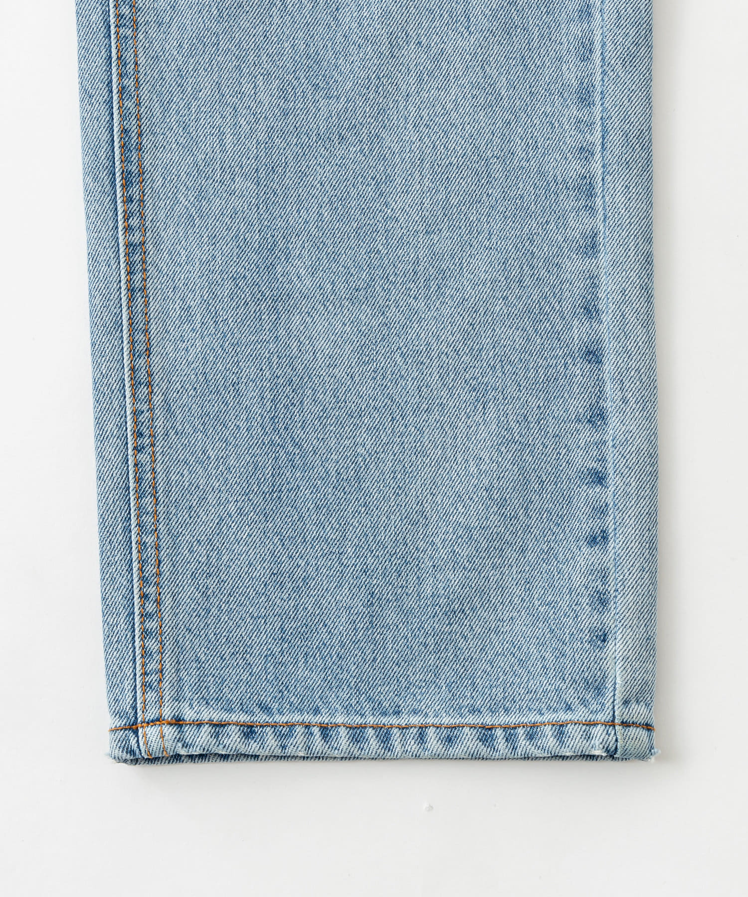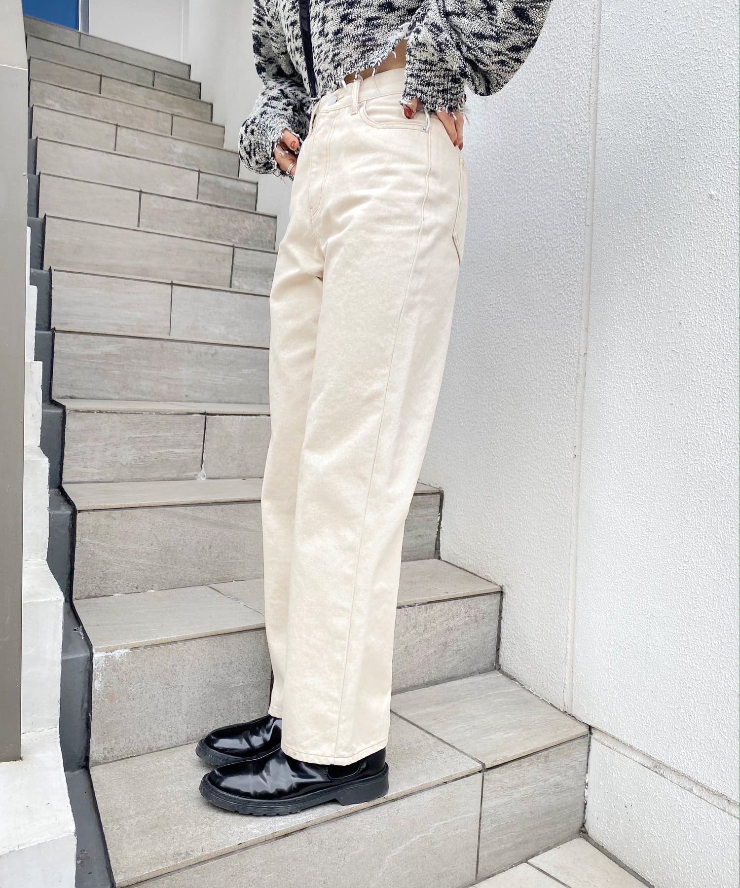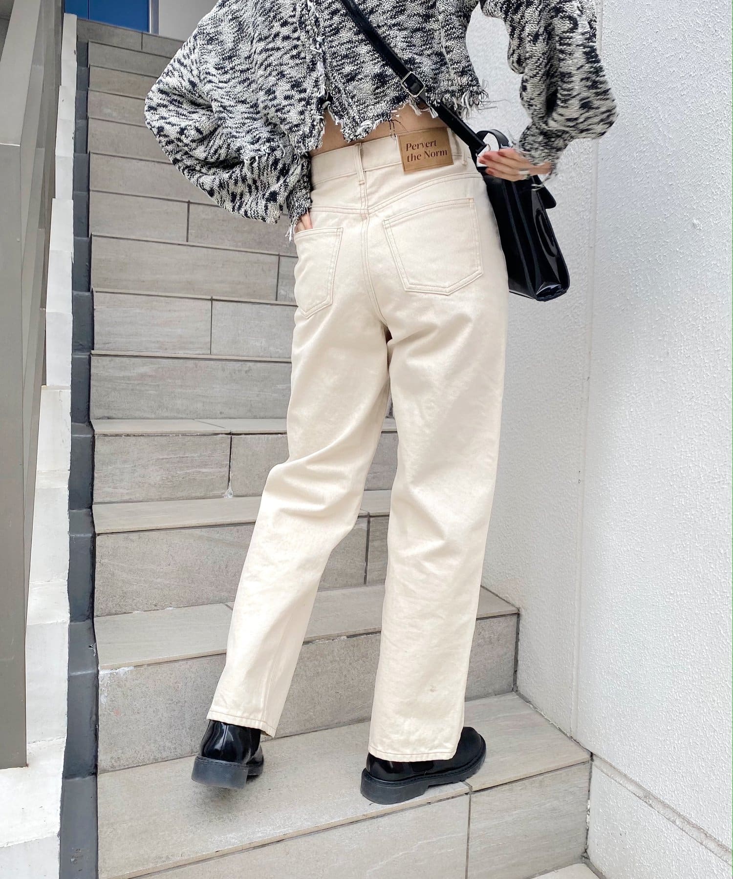 バックの紙ネームパッチがアクセントに。美脚が叶うストレートなシンプルデニム