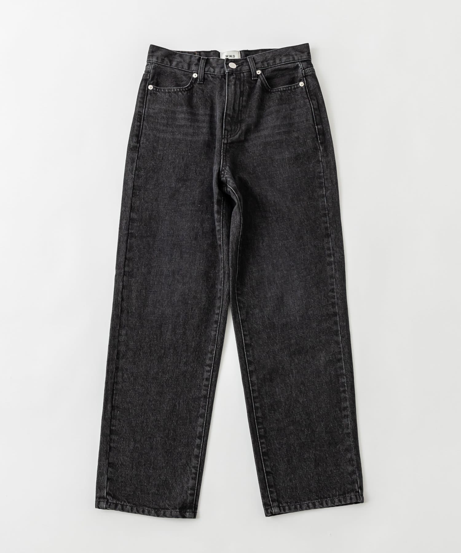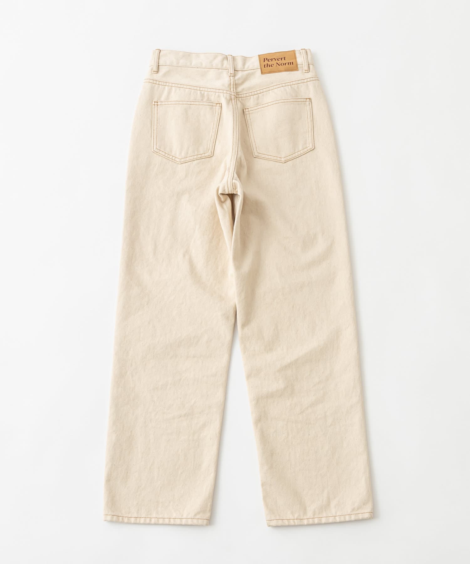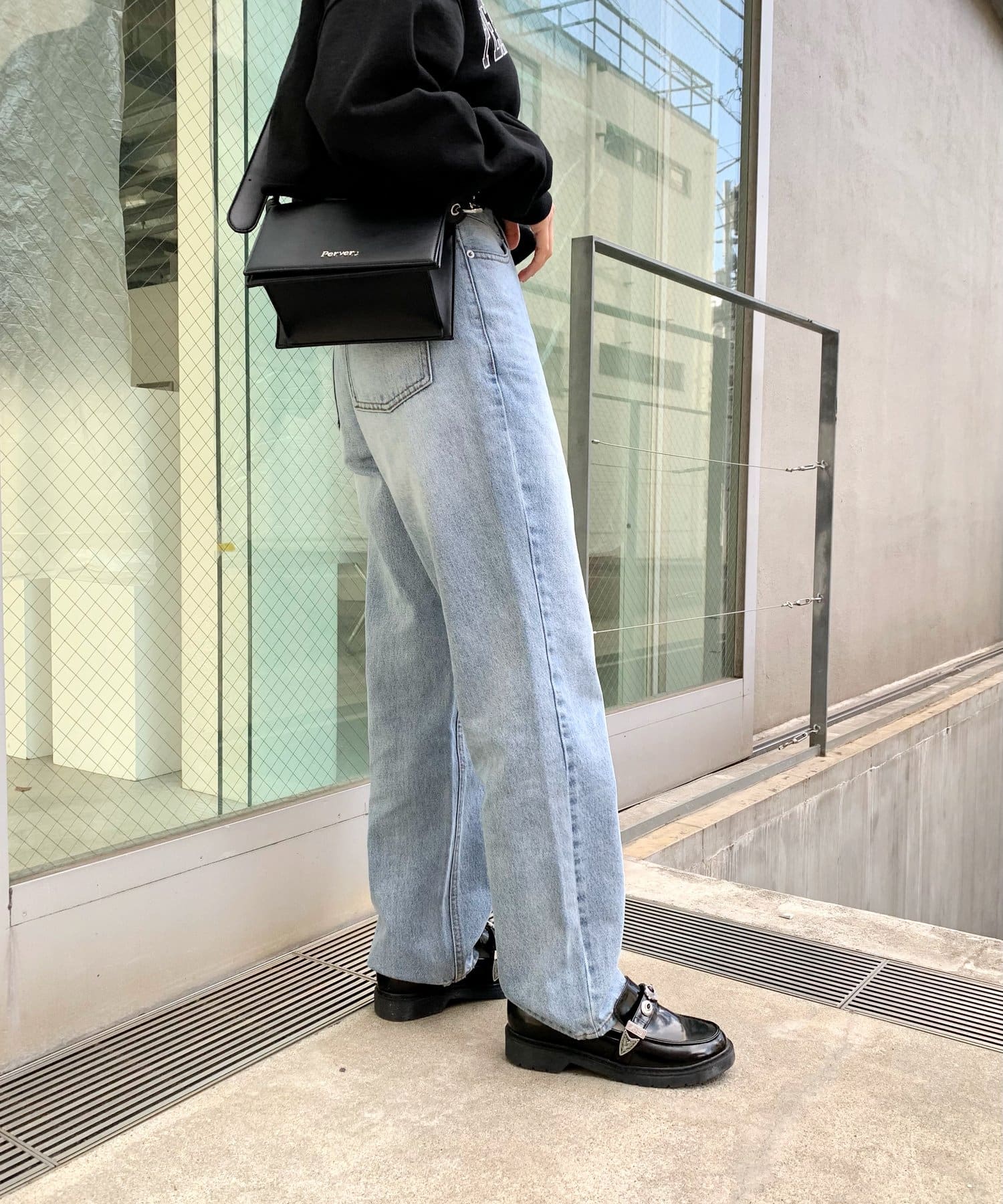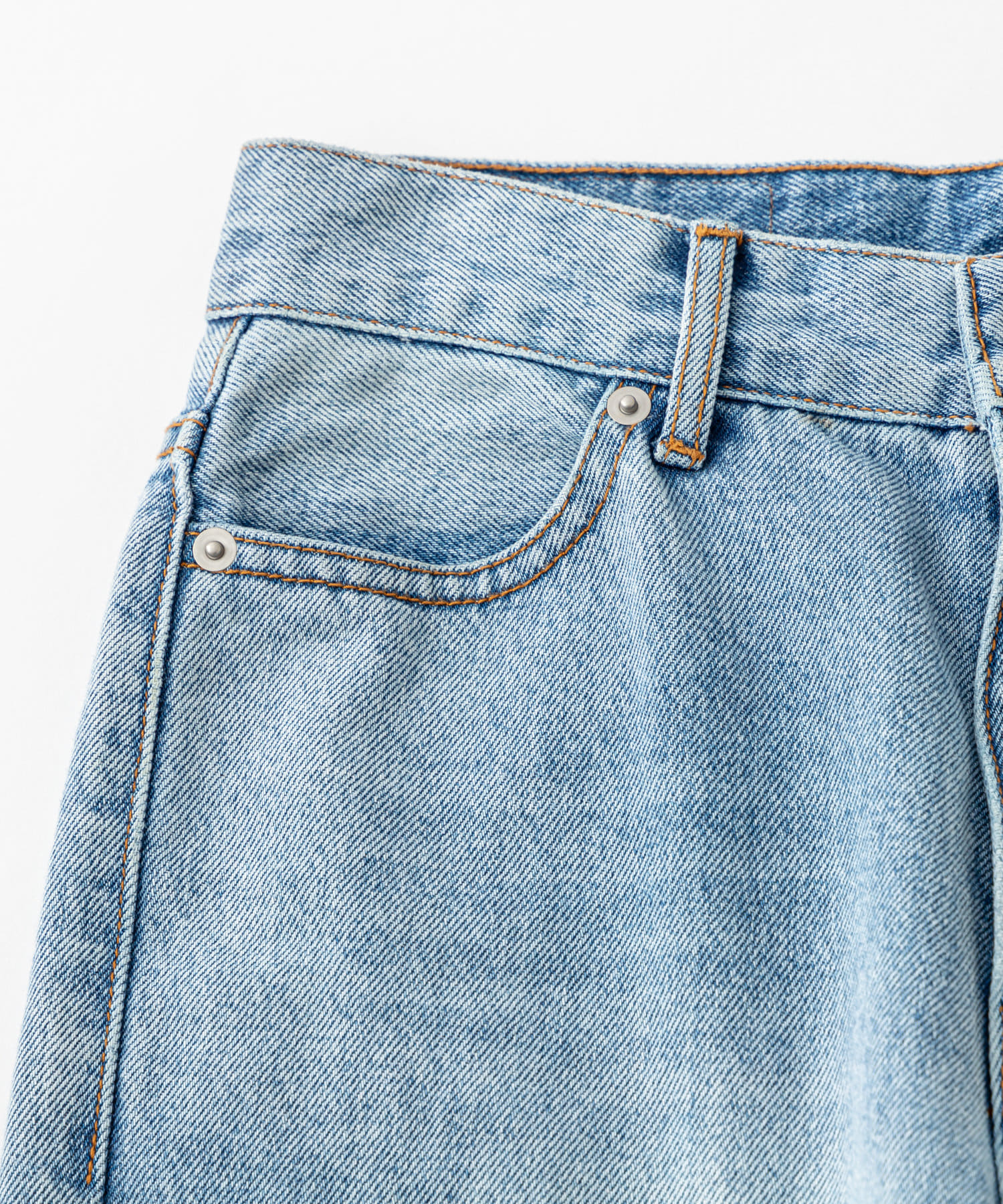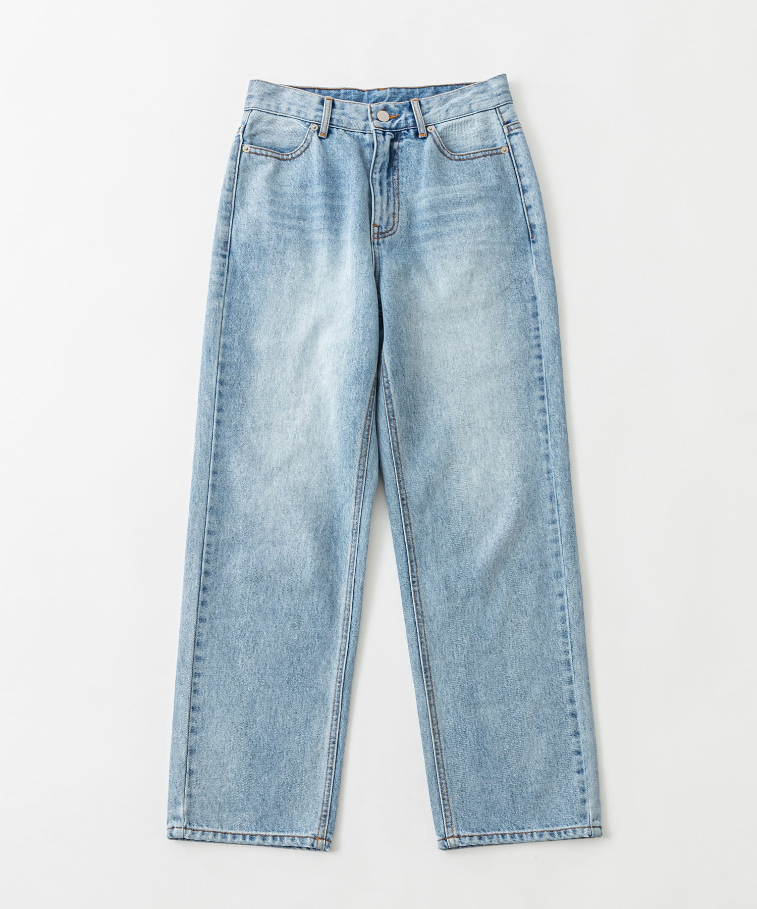バックの紙ネームパッチがアクセントに。美脚が叶うストレートなシンプルデニム