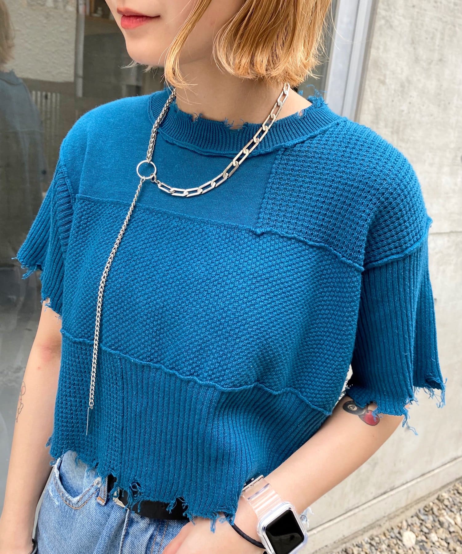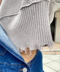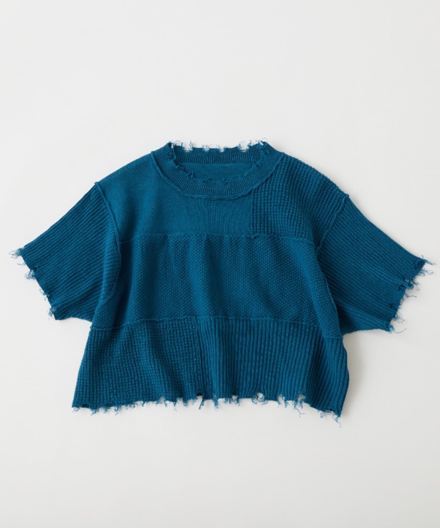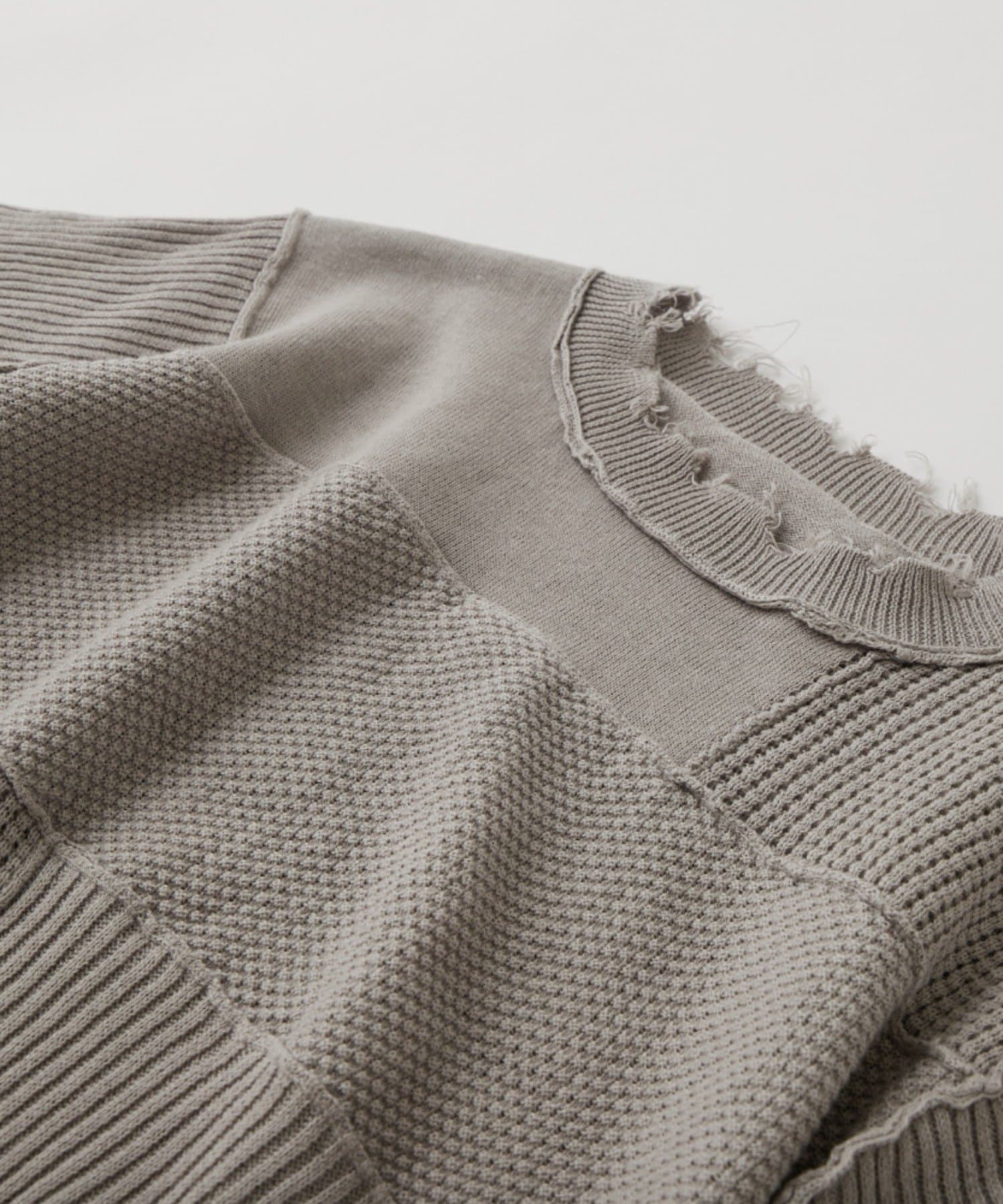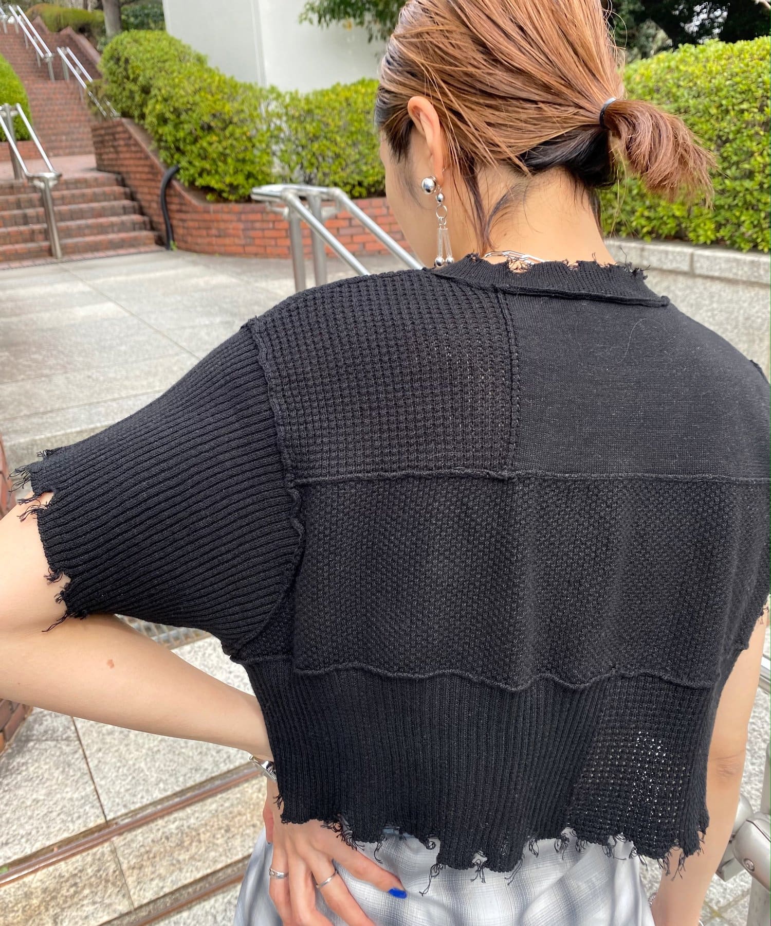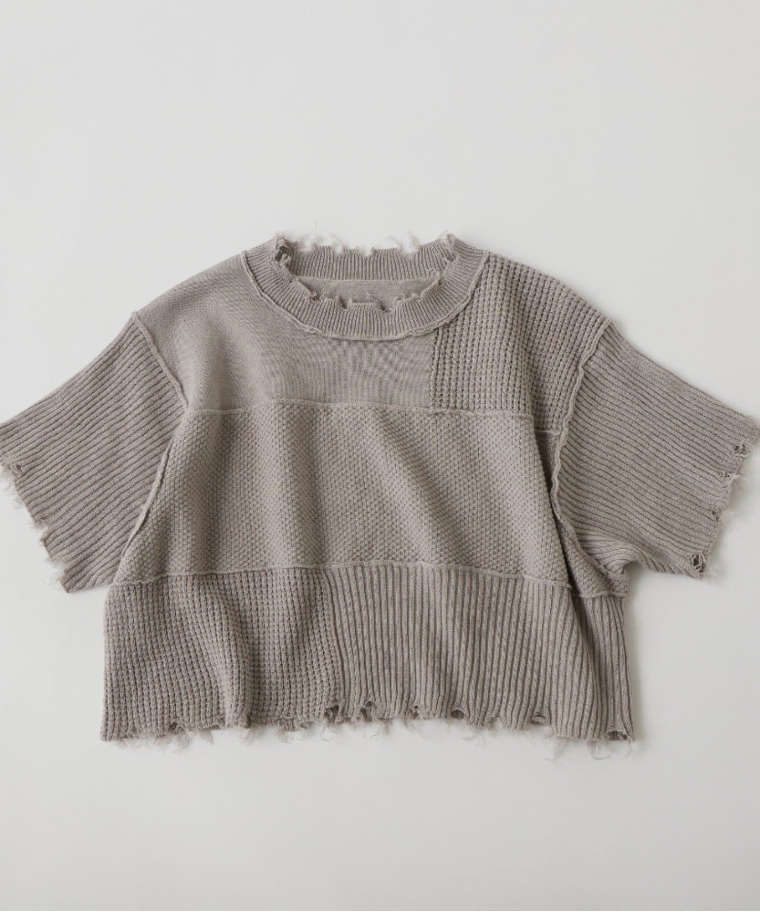 上下左右アシンメトリーのミックス編みがコーデのポイントになるデザイントップス。