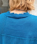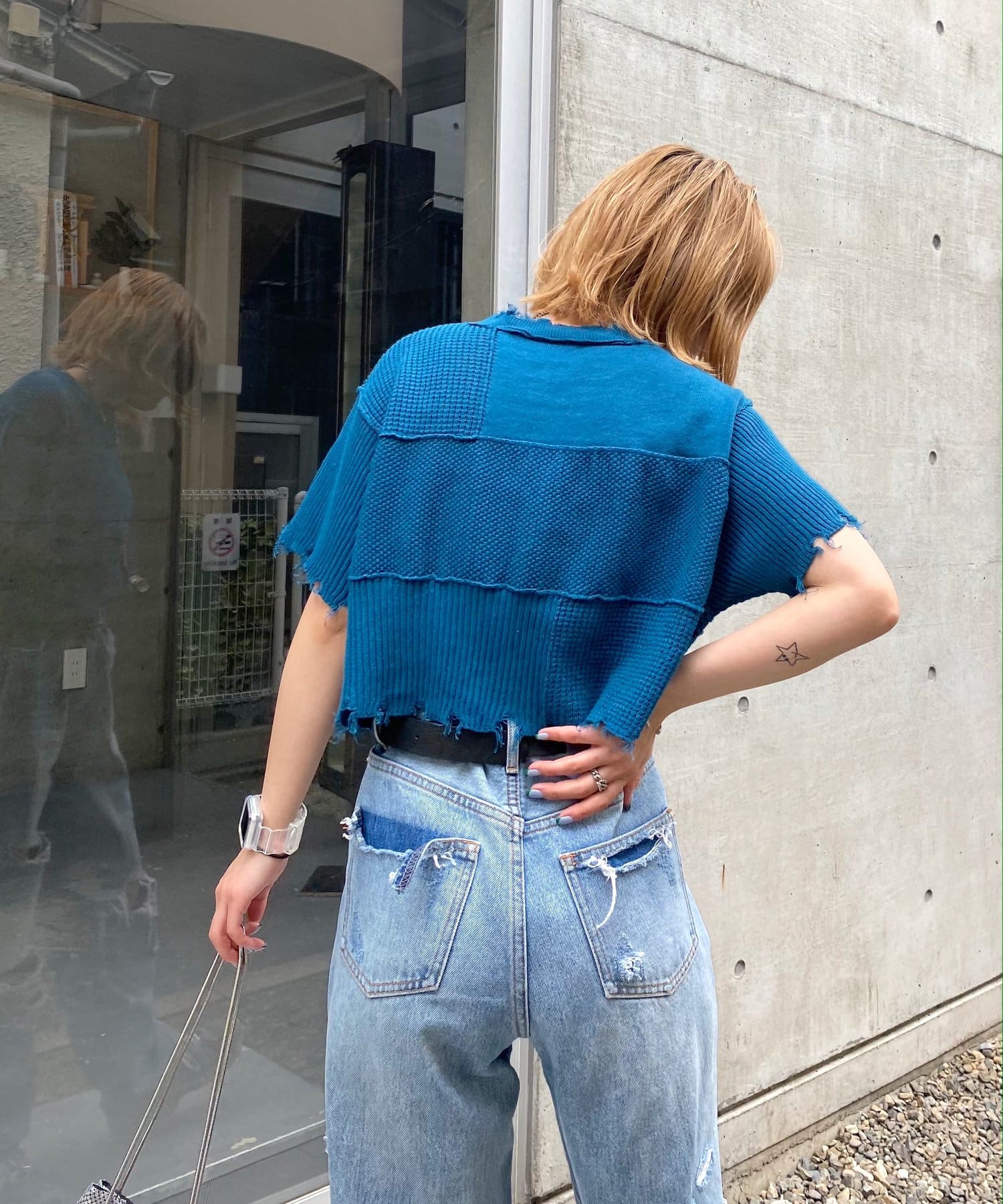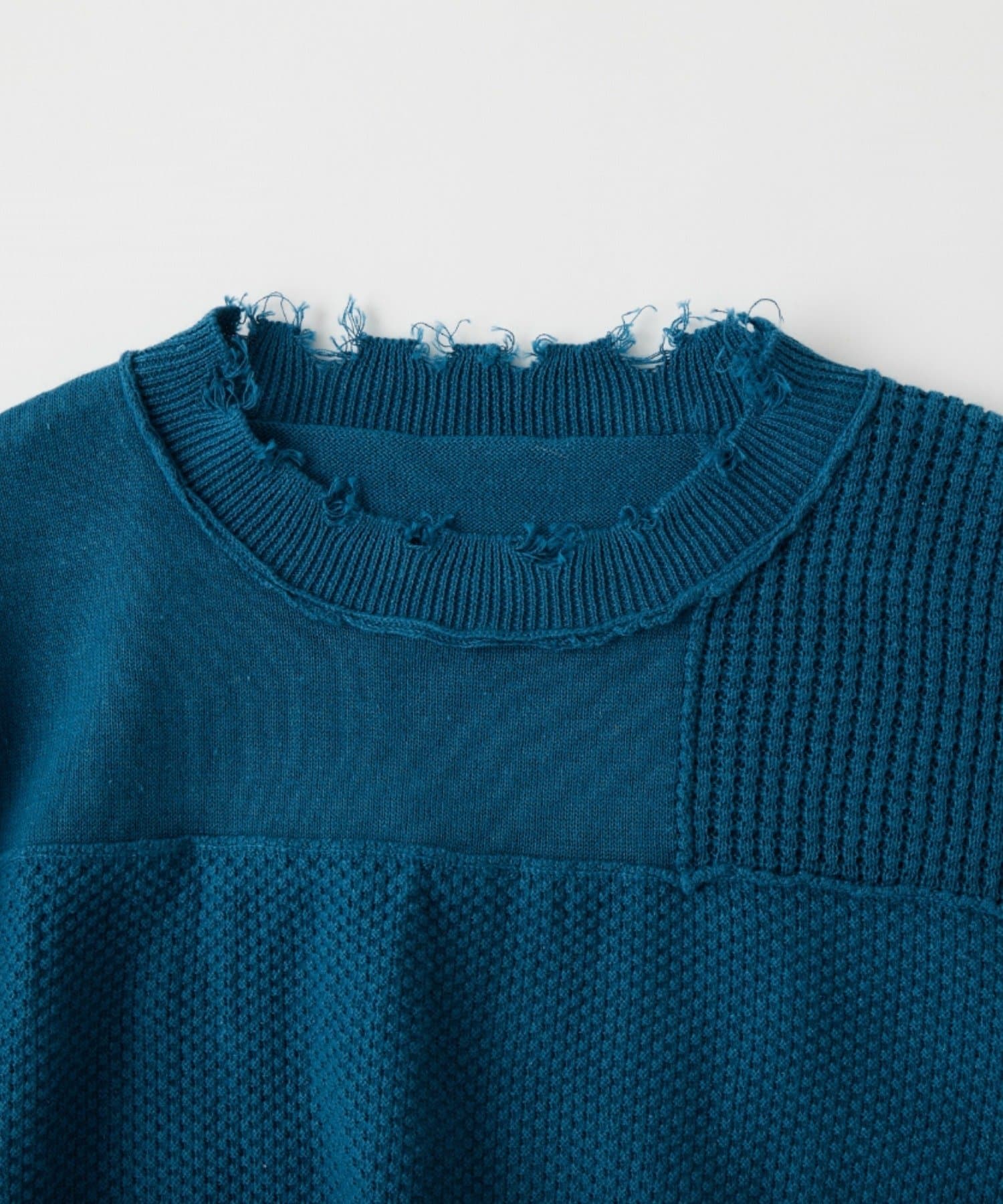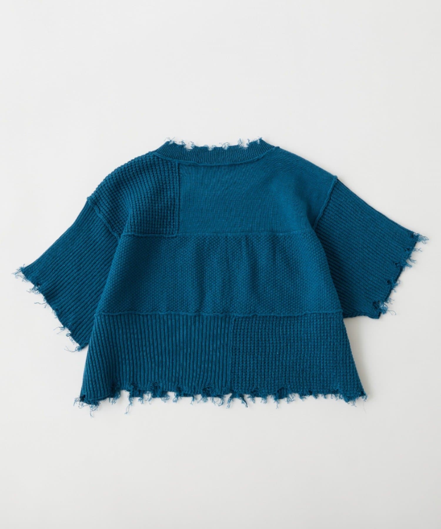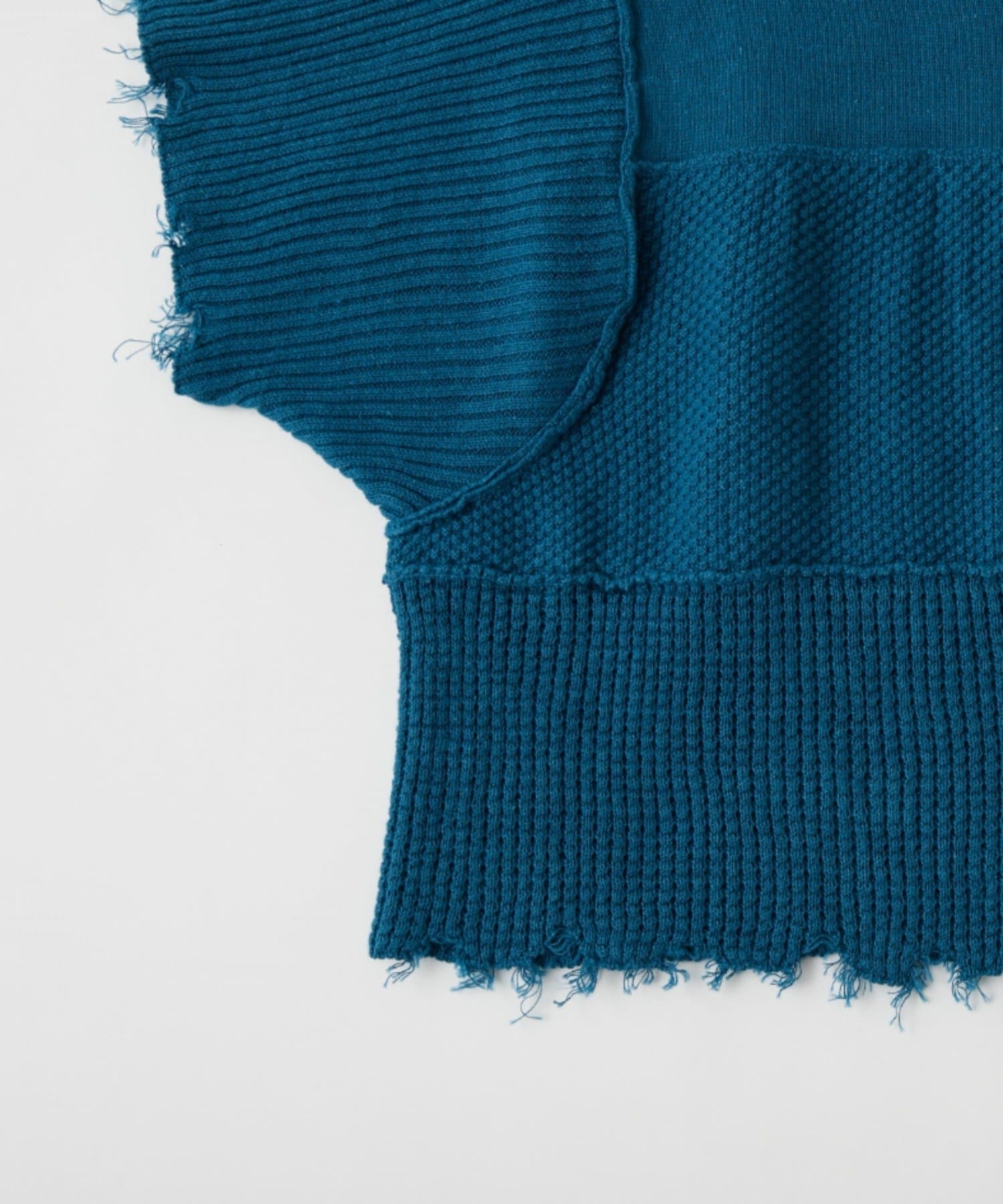 上下左右アシンメトリーのミックス編みがコーデのポイントになるデザイントップス。