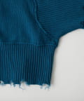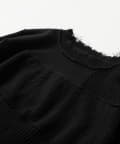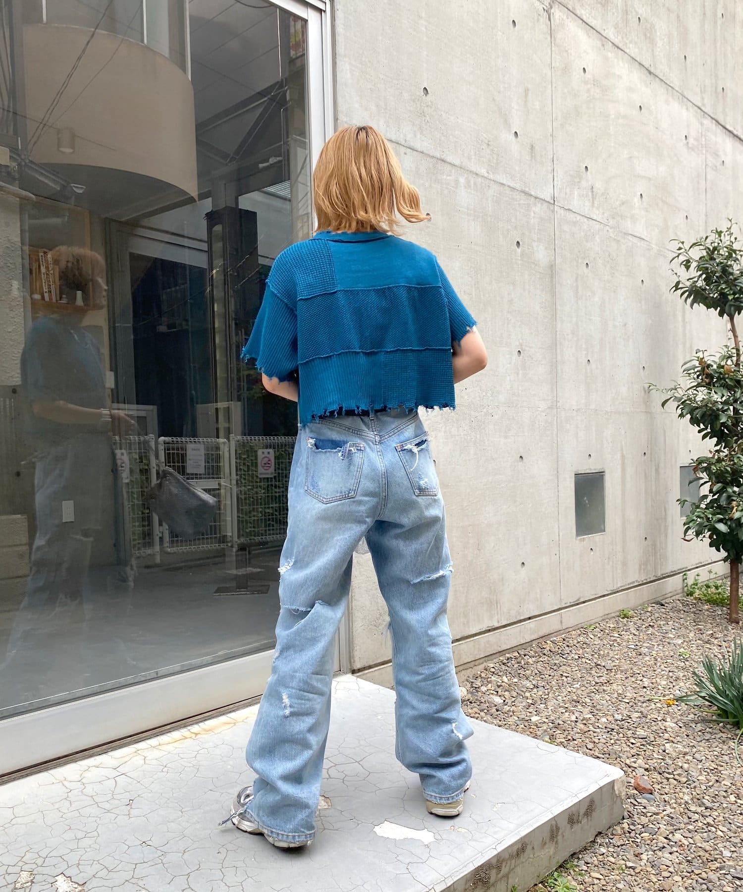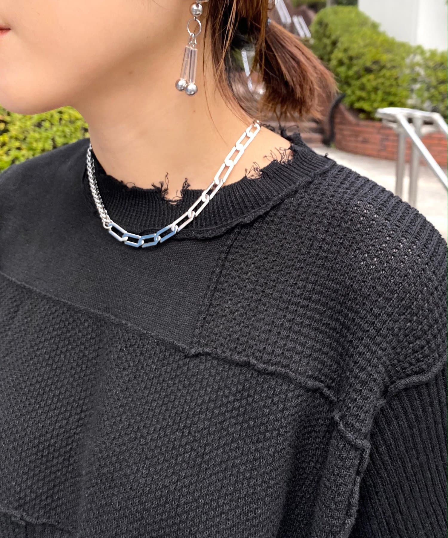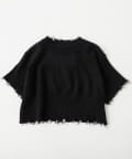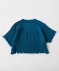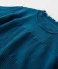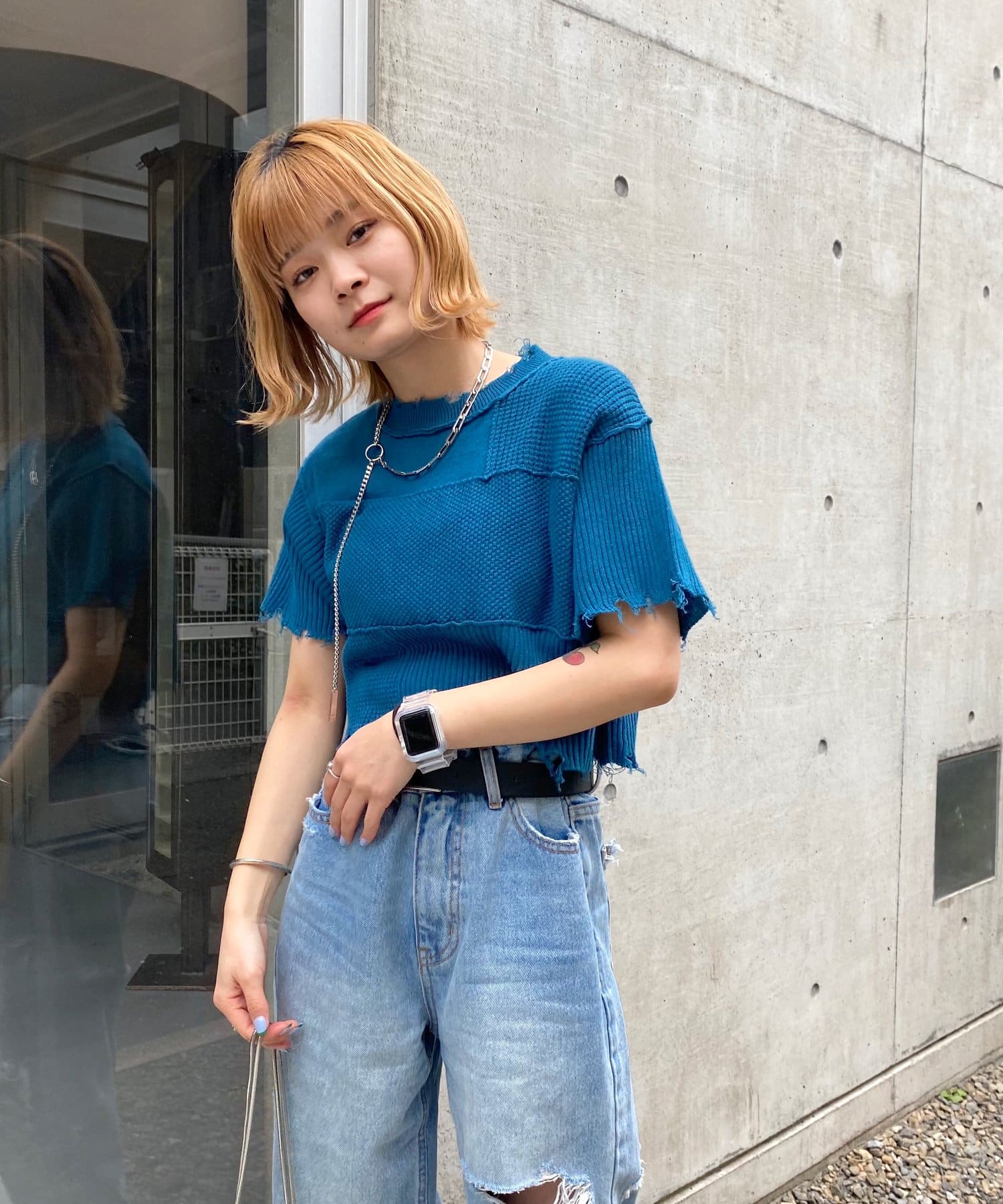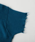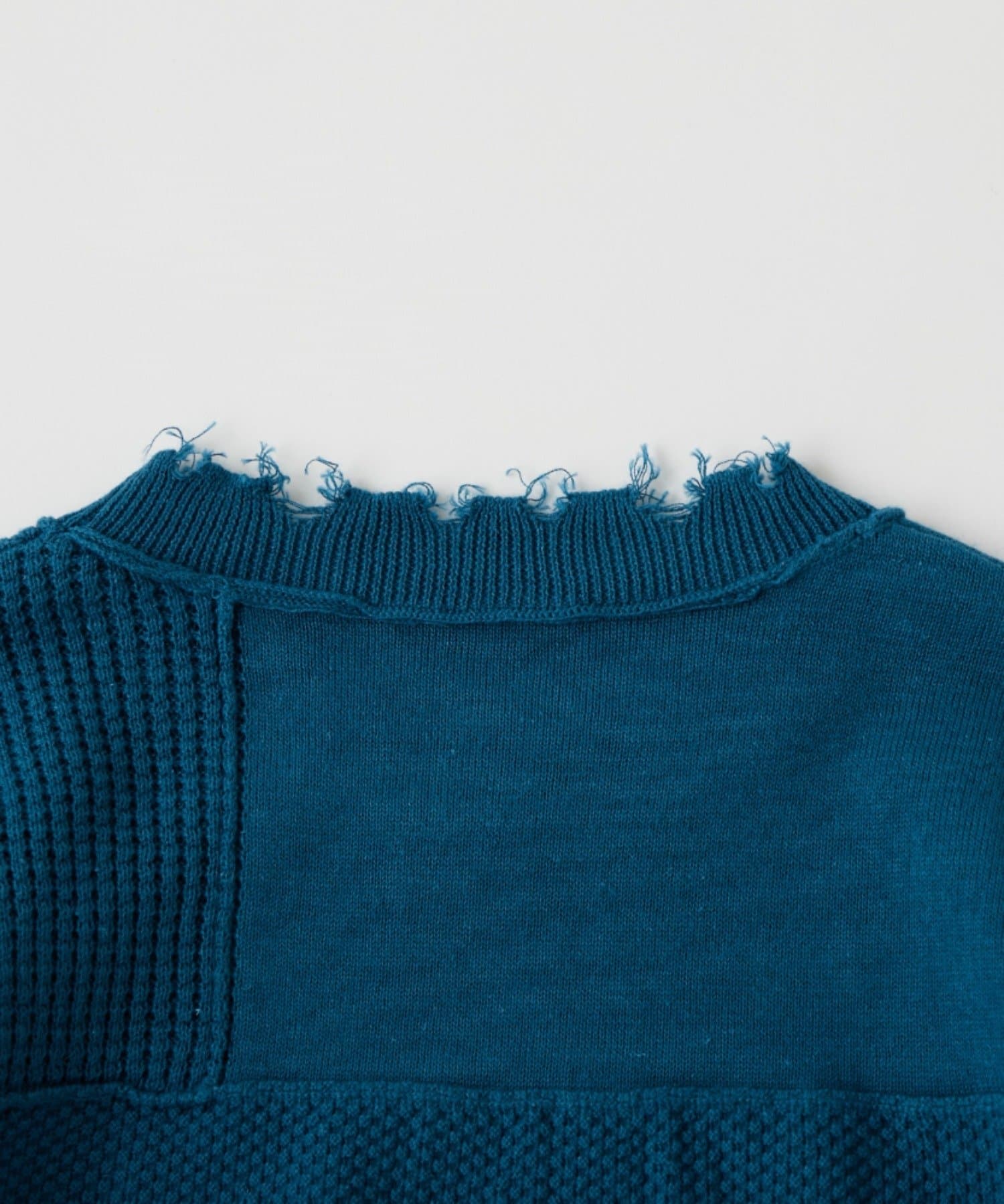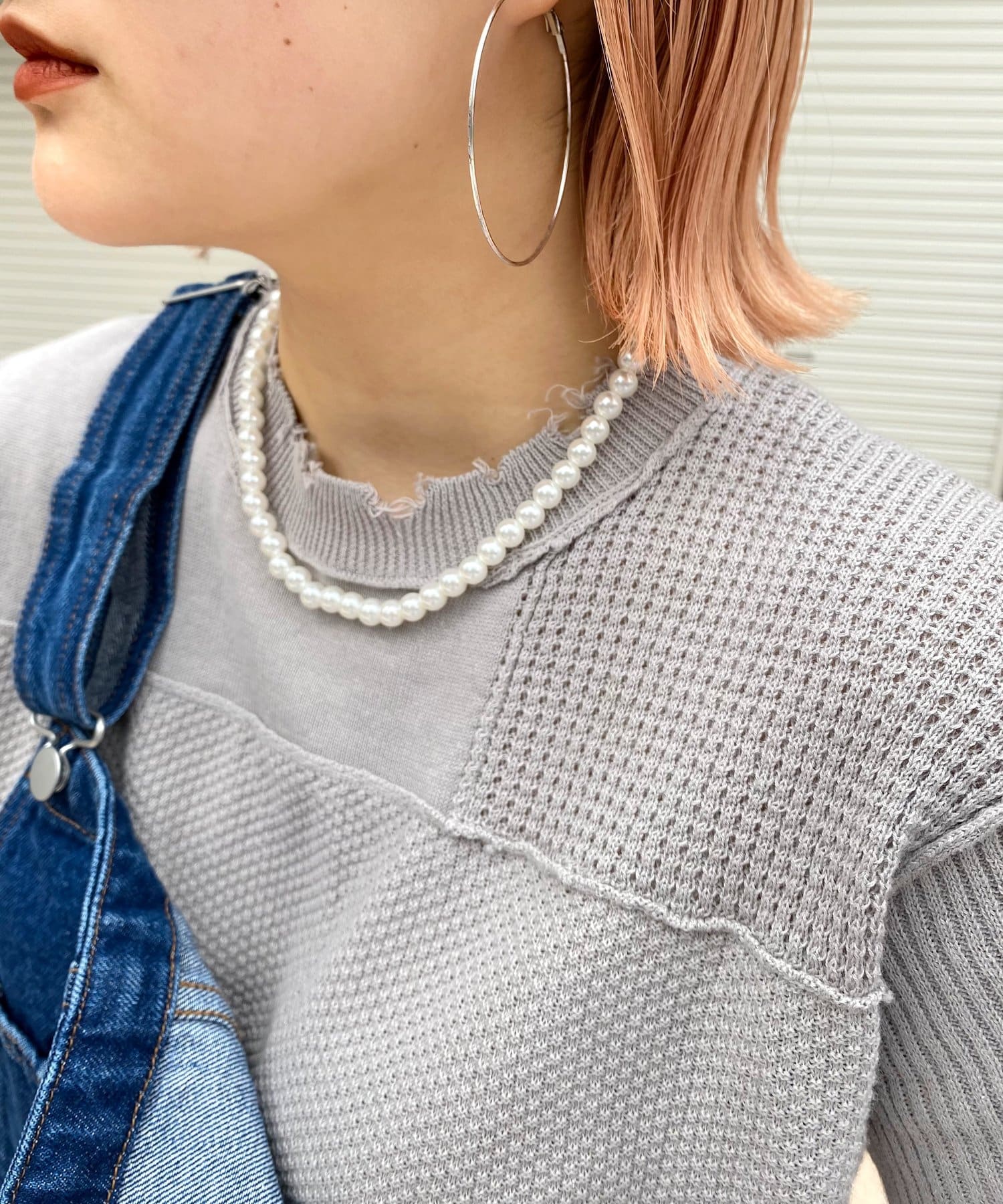 上下左右アシンメトリーのミックス編みがコーデのポイントになるデザイントップス。