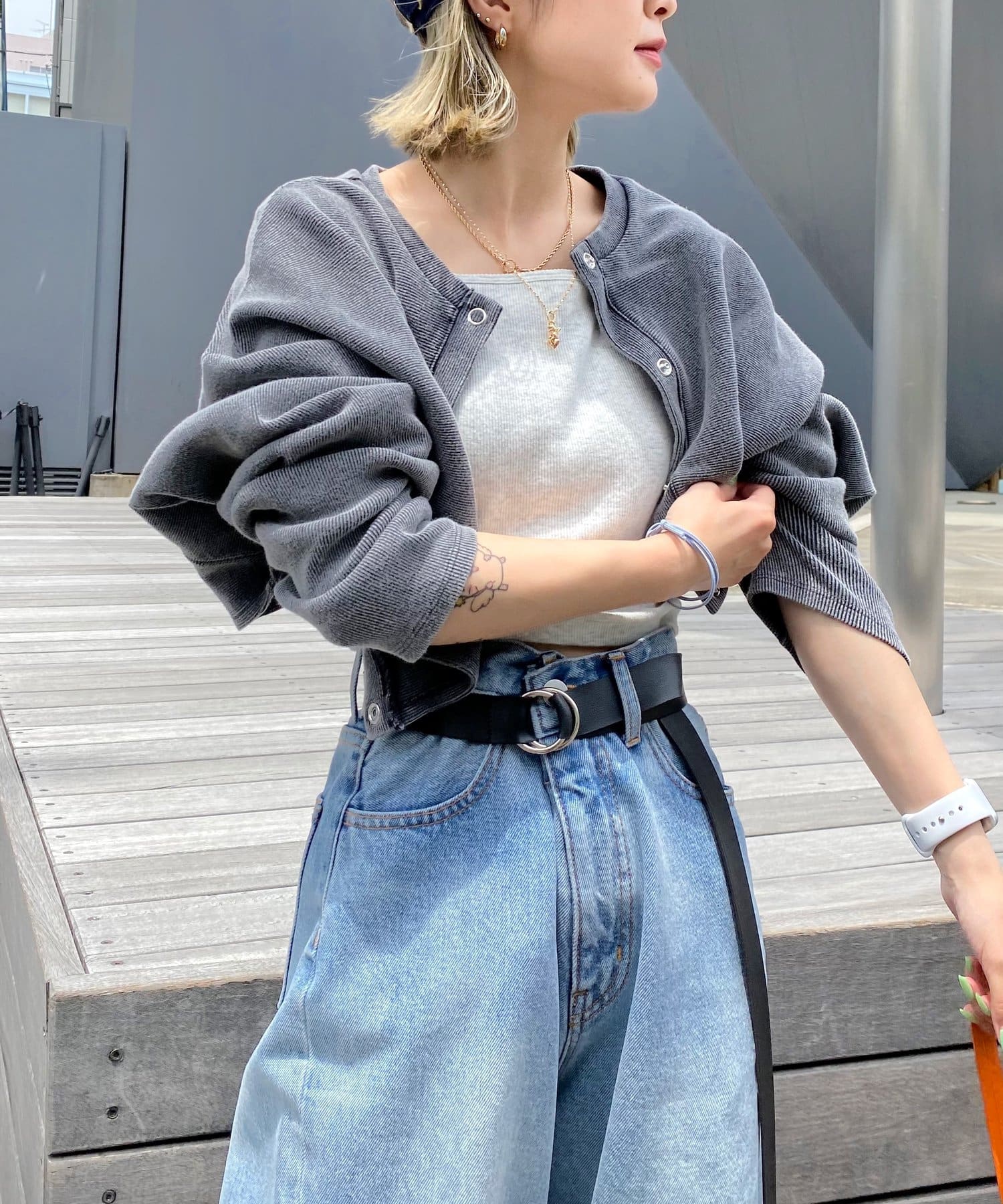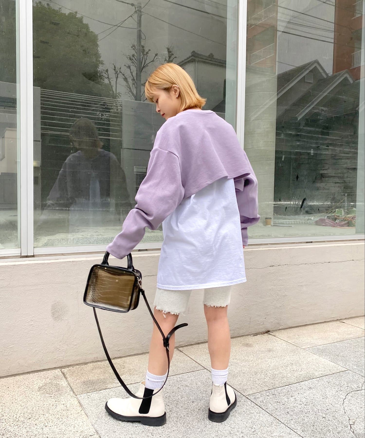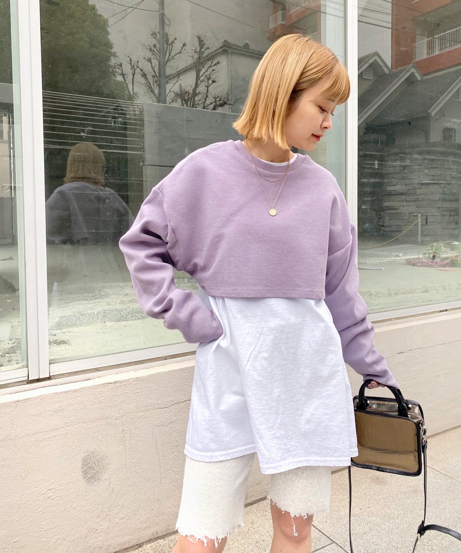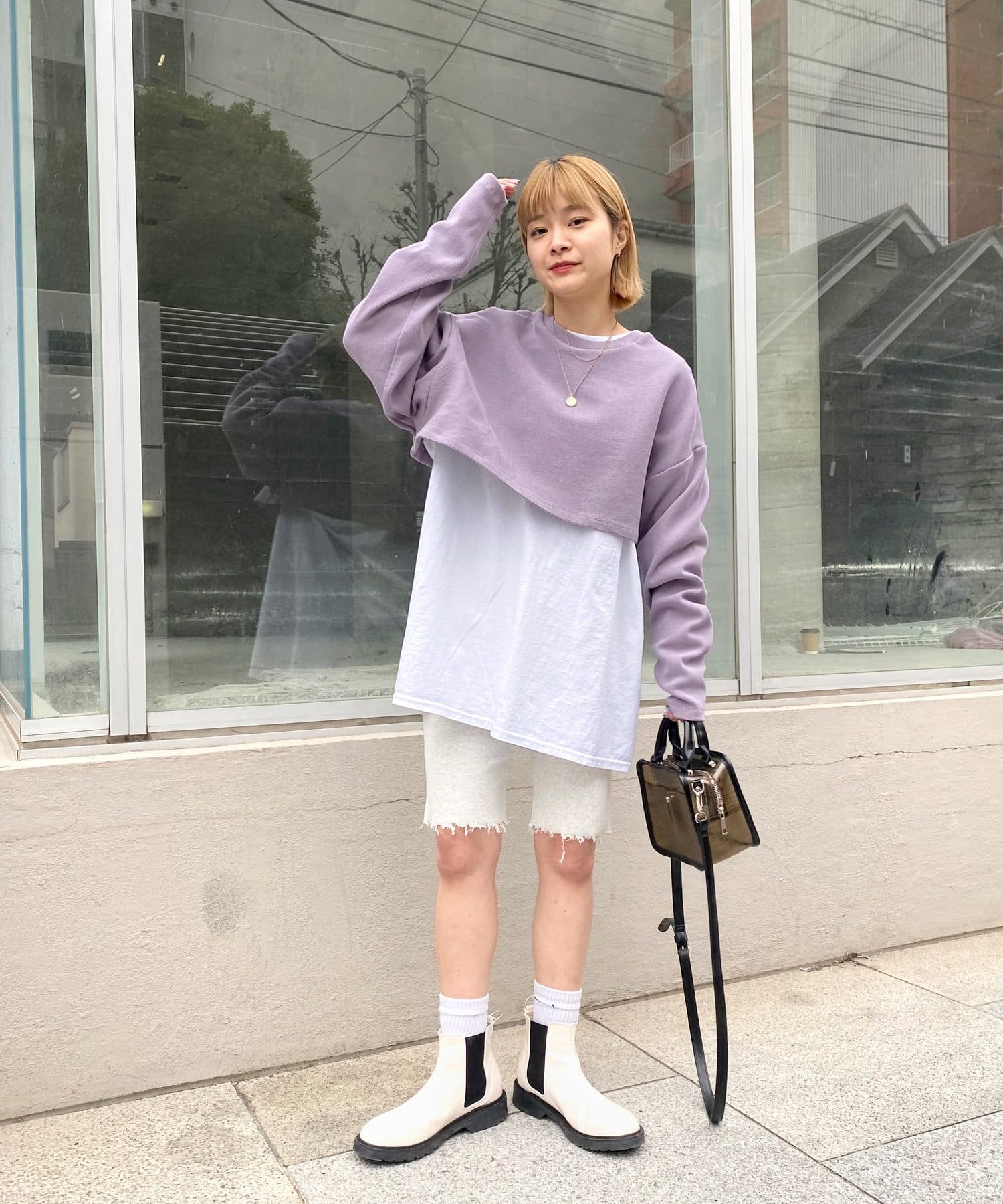 ・短丈なので、レイヤードスタイルにも◎。シャツやロンT、Tシャツなど好きな組み合わせで是非。