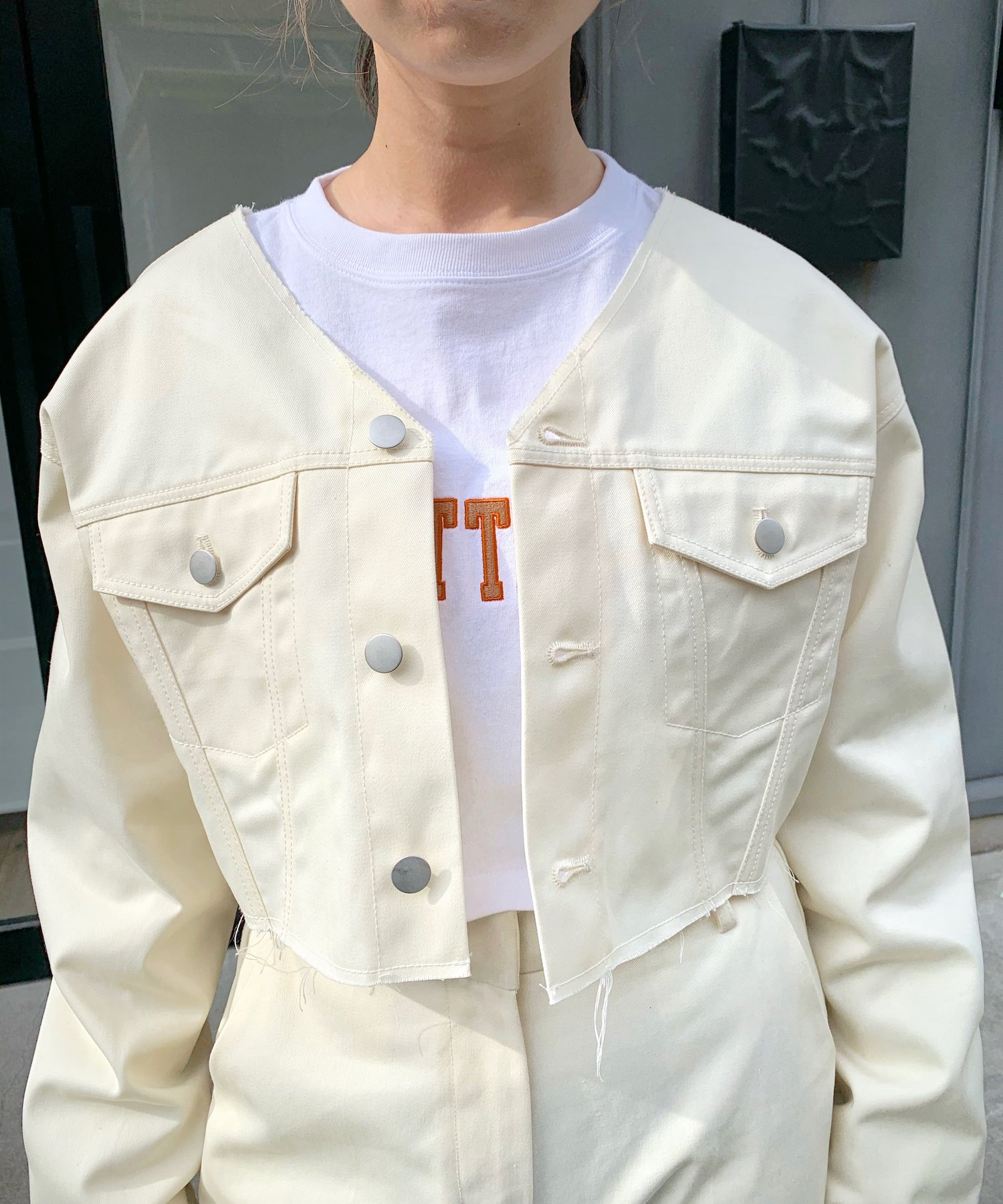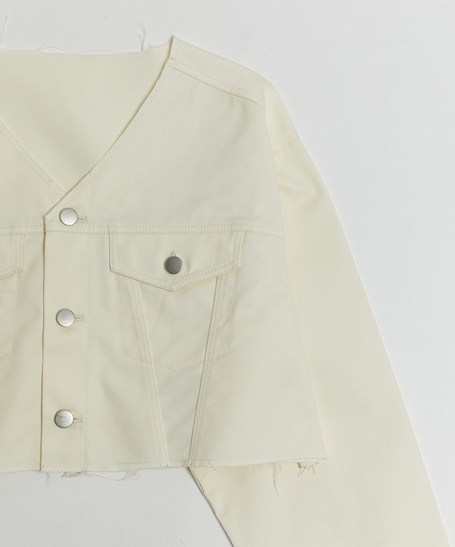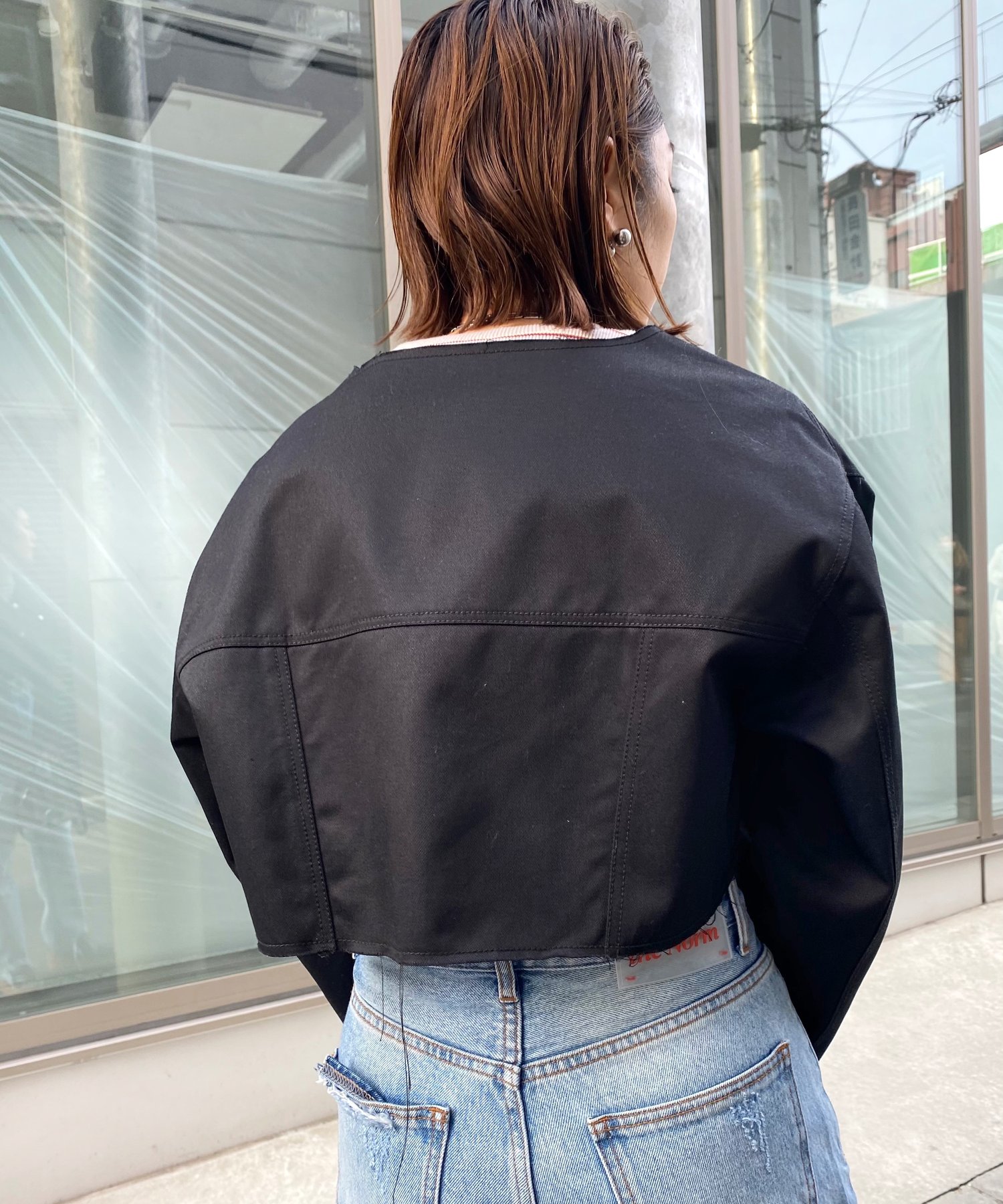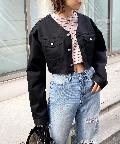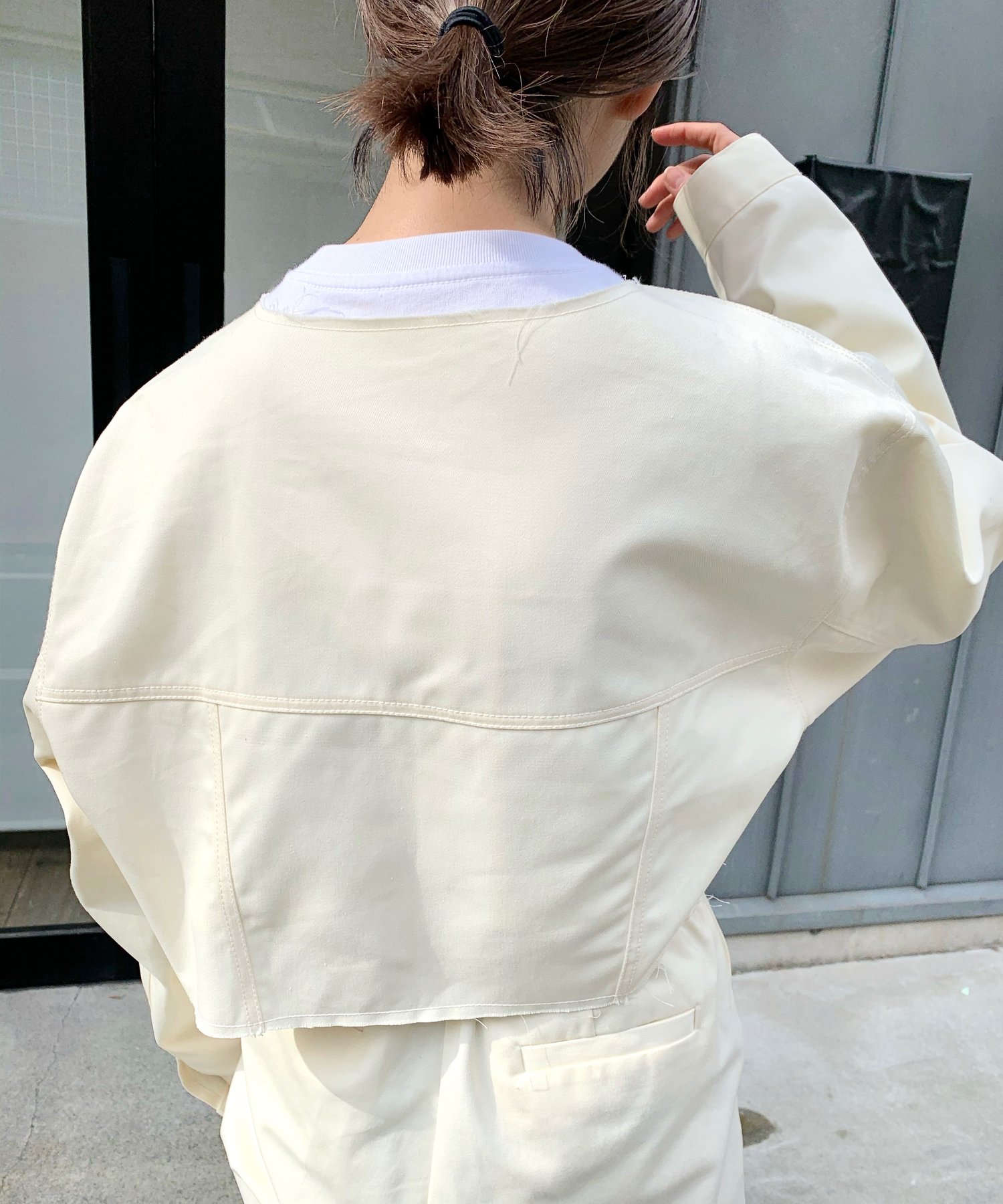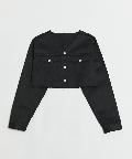 ショート丈&ノーカラーでシンプルな着やすさ!ツイル素材ジャケット