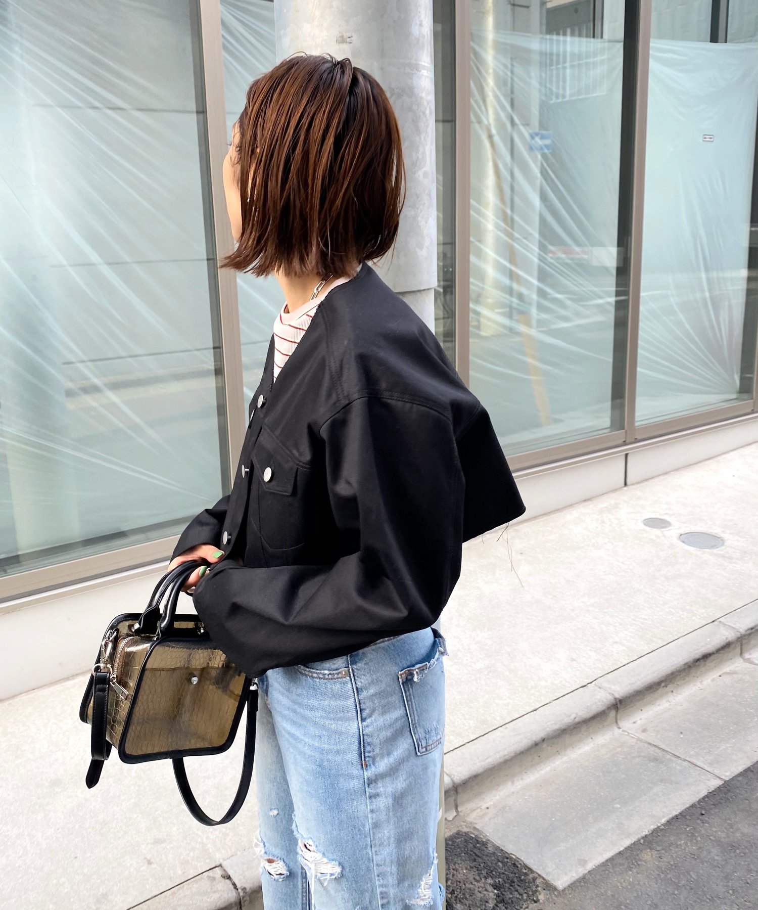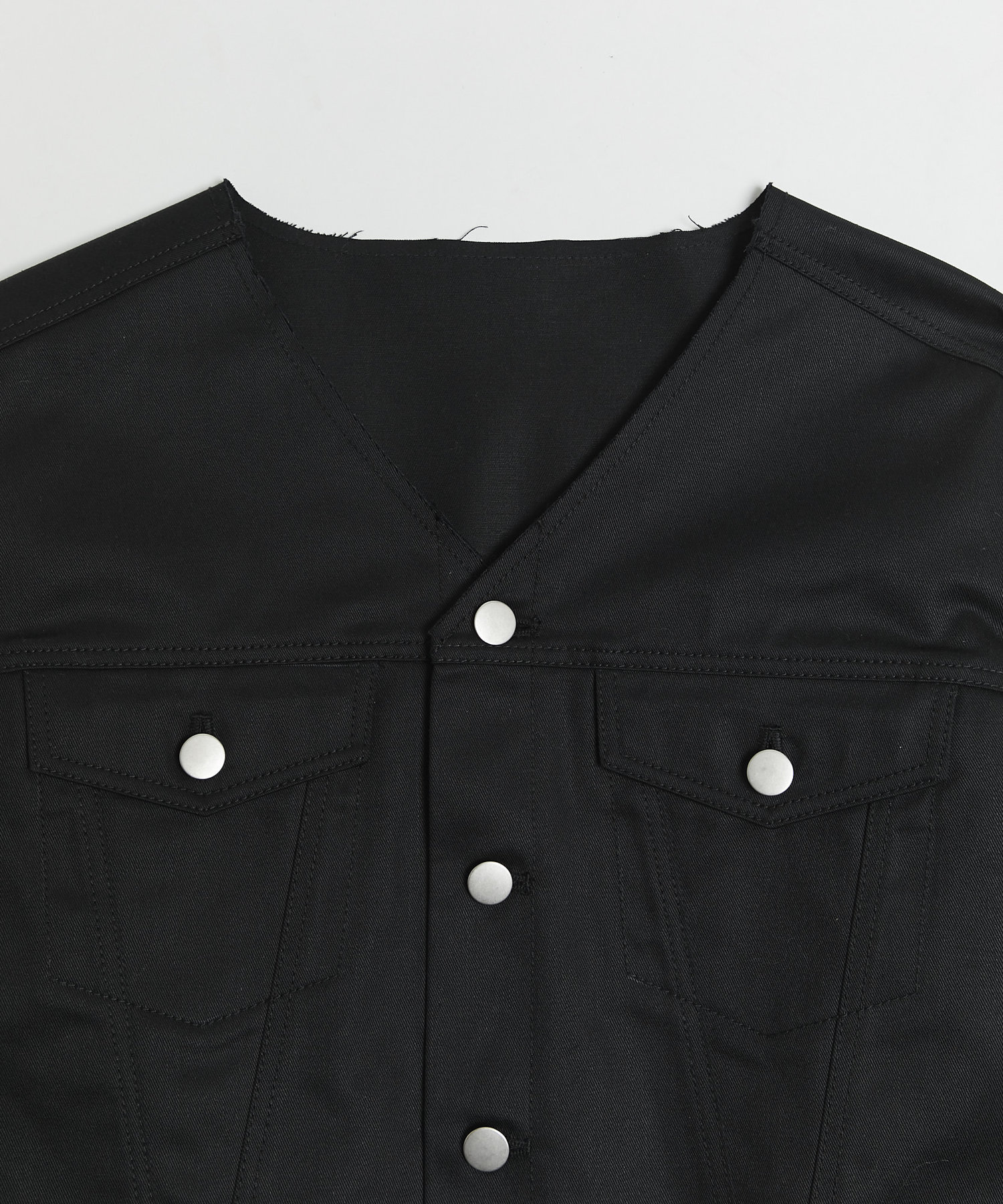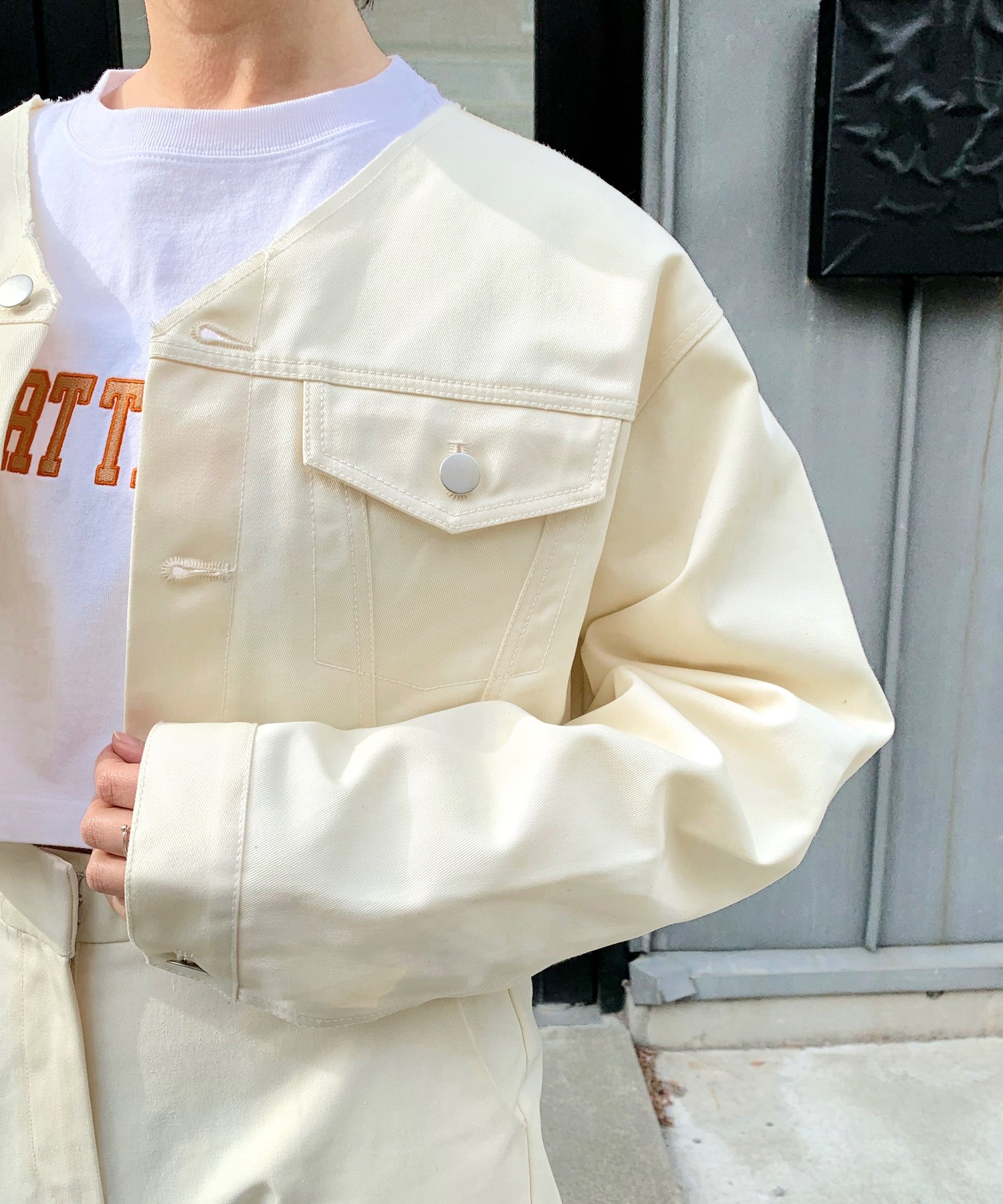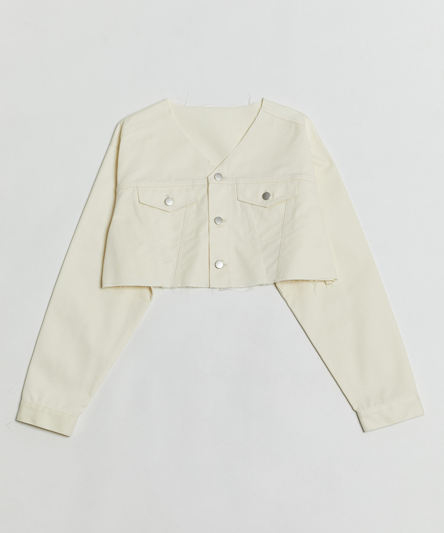 ショート丈&ノーカラーでシンプルな着やすさ!ツイル素材ジャケット