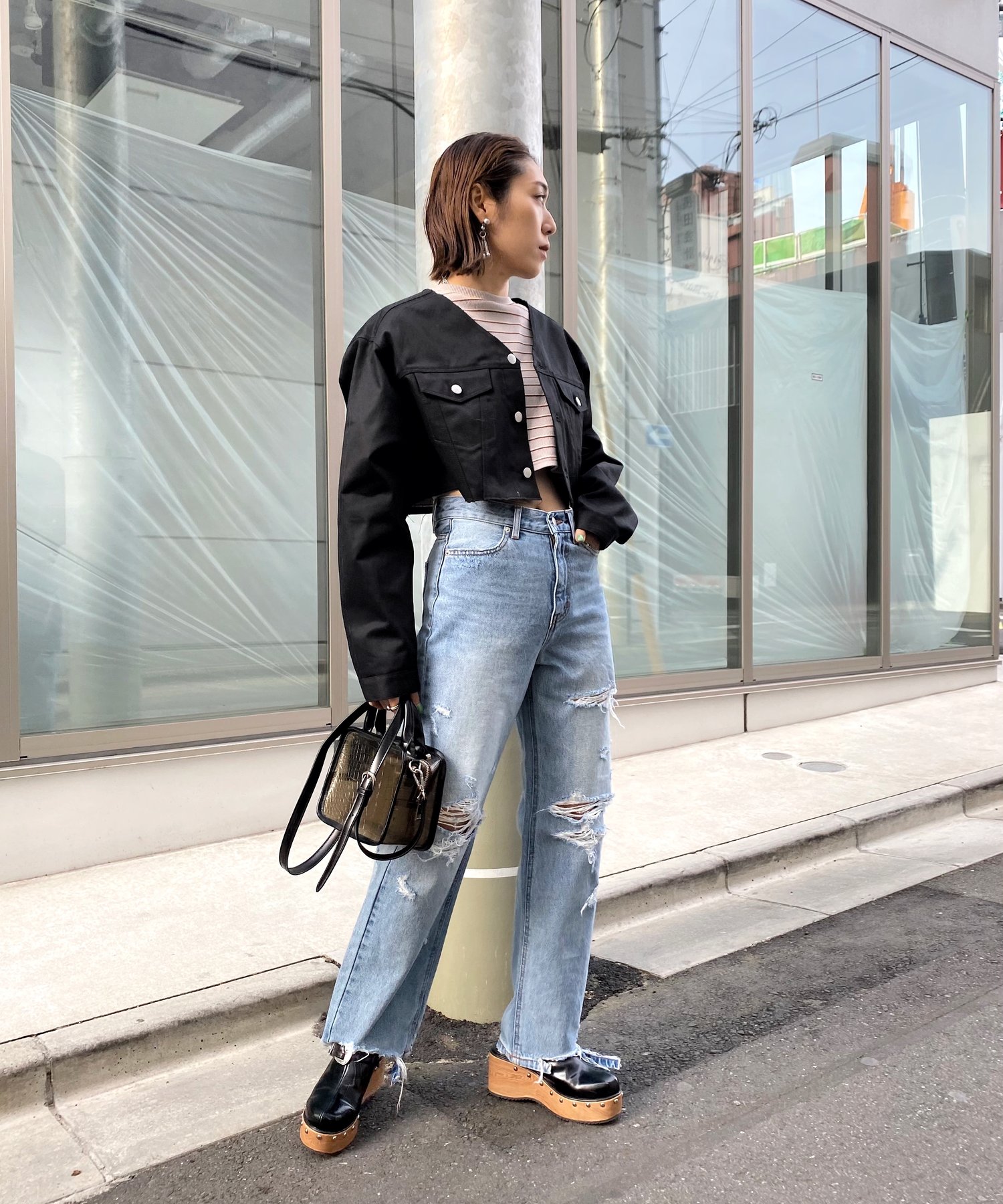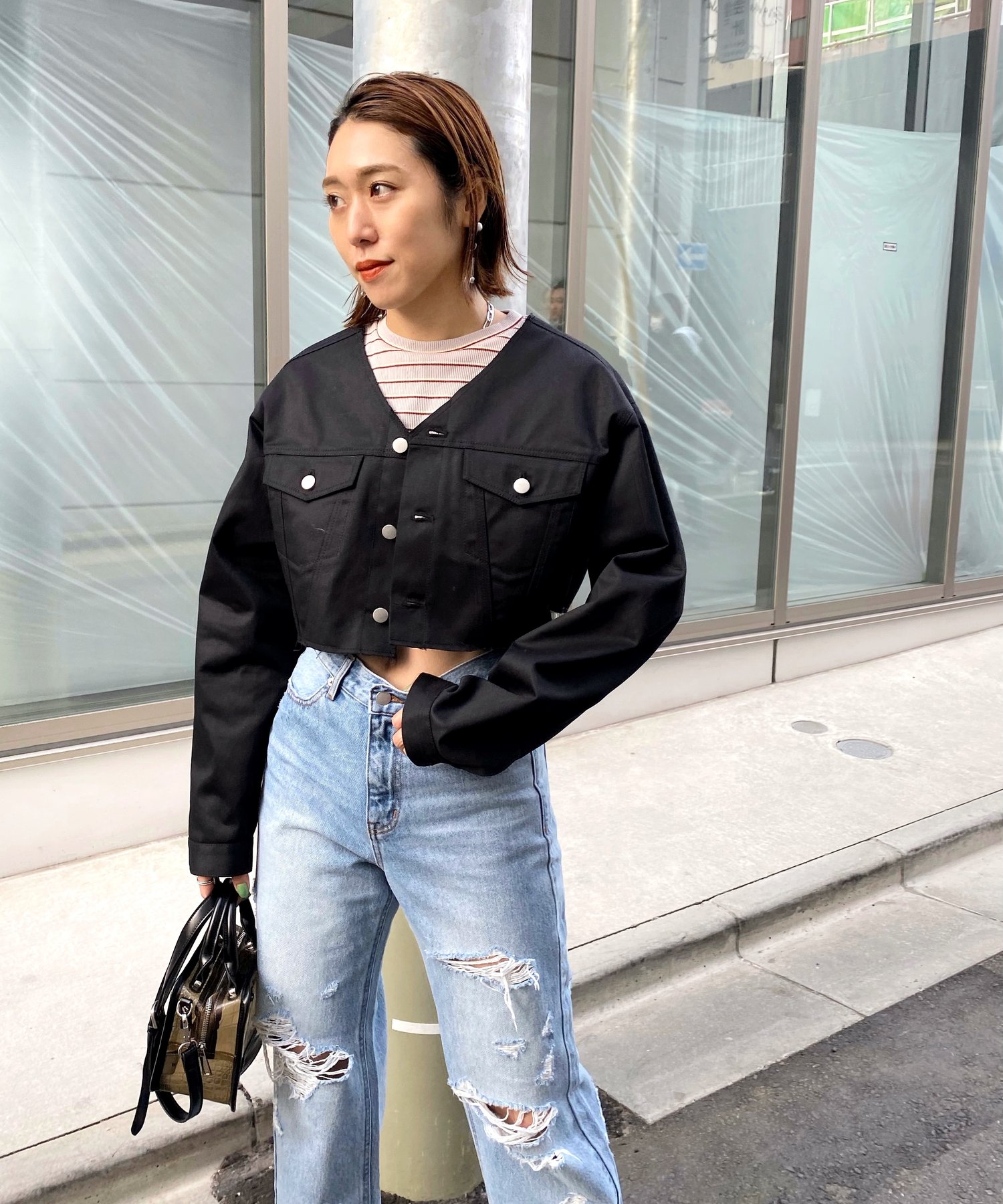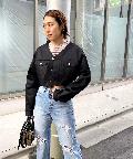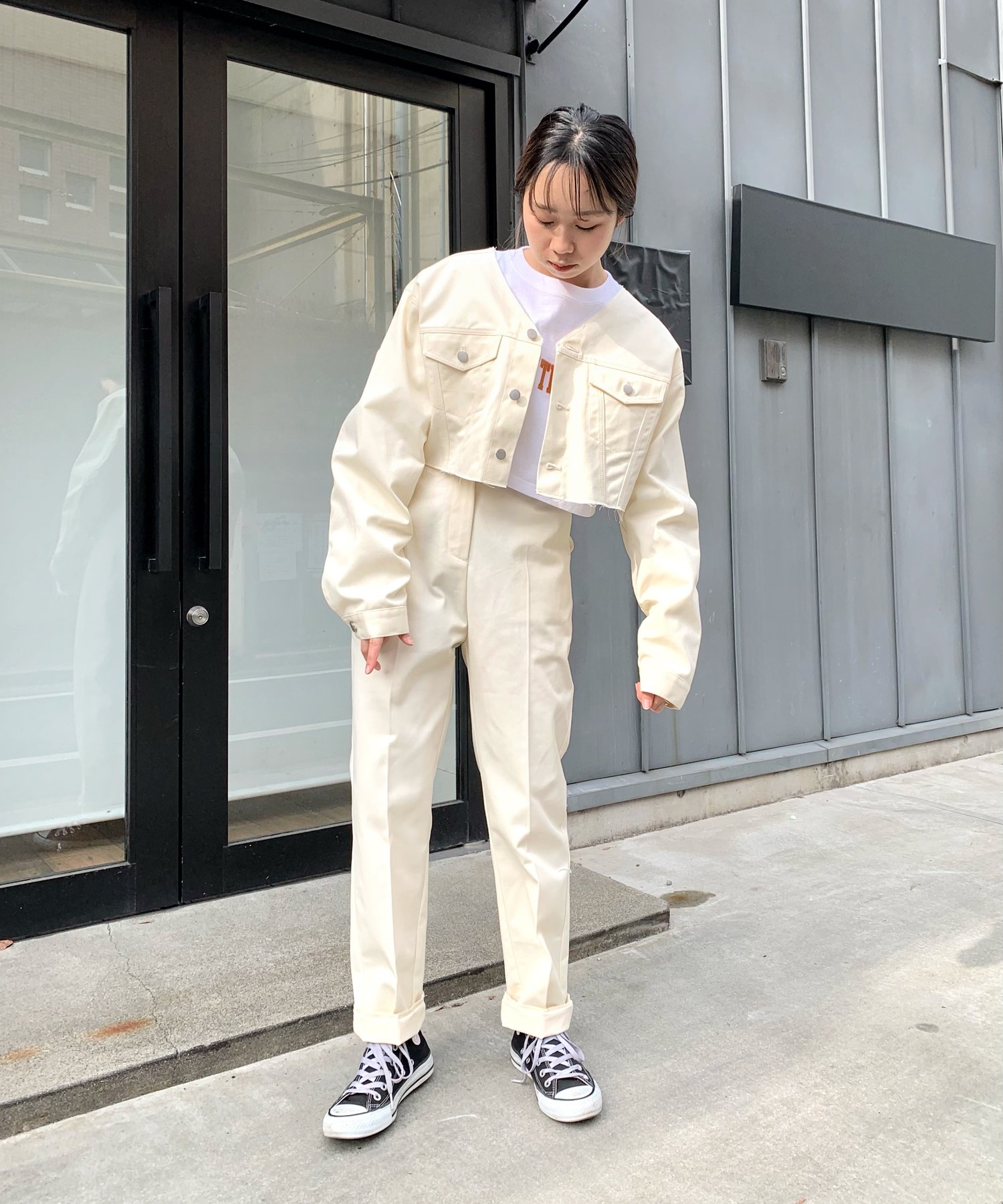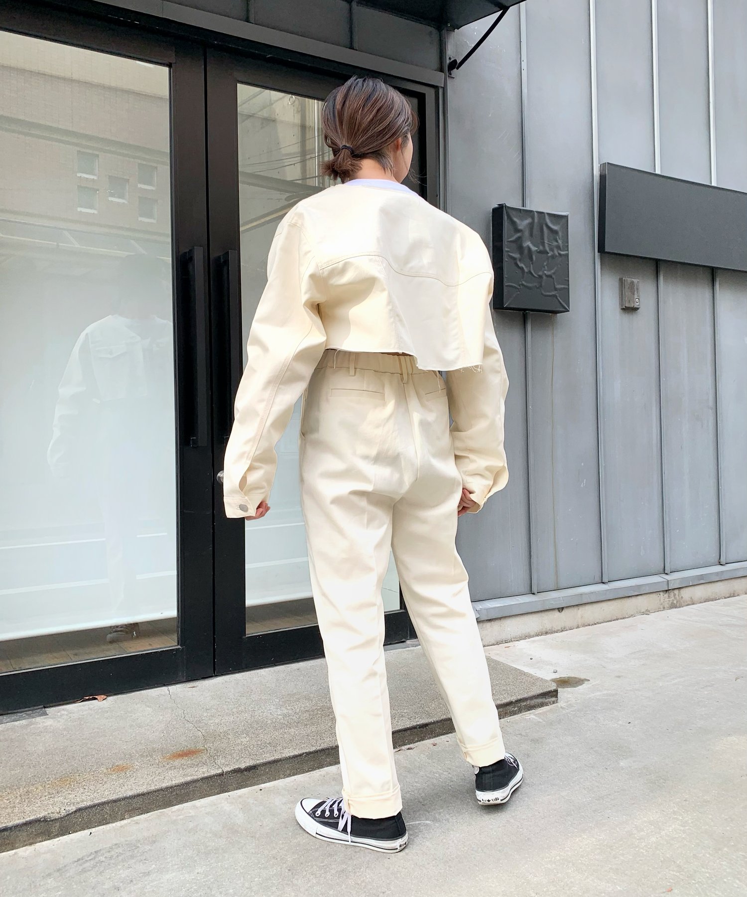 ショート丈&ノーカラーでシンプルな着やすさ!ツイル素材ジャケット