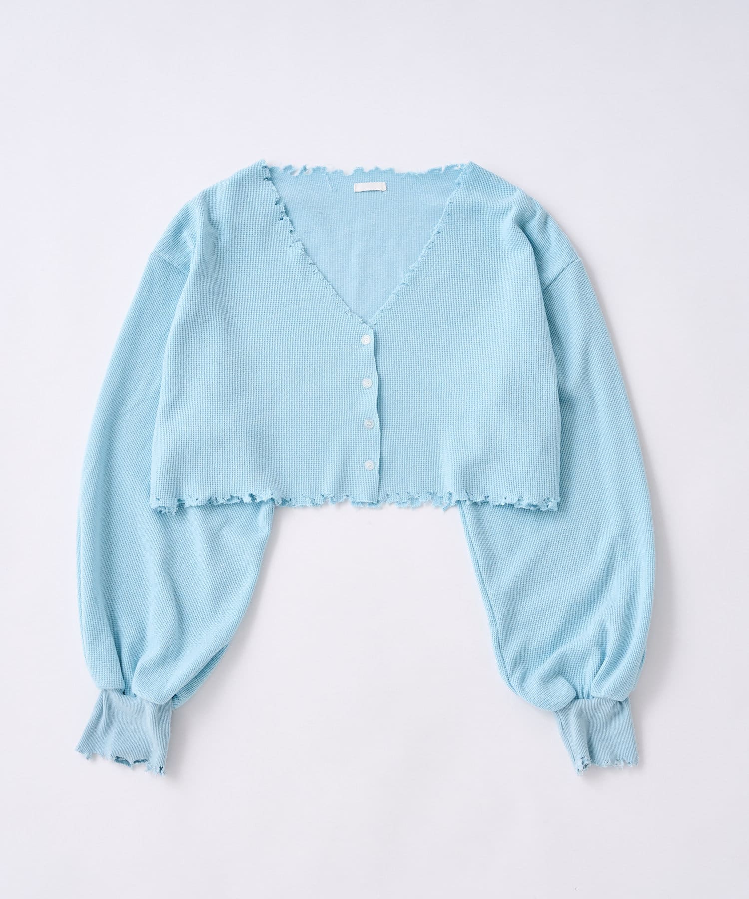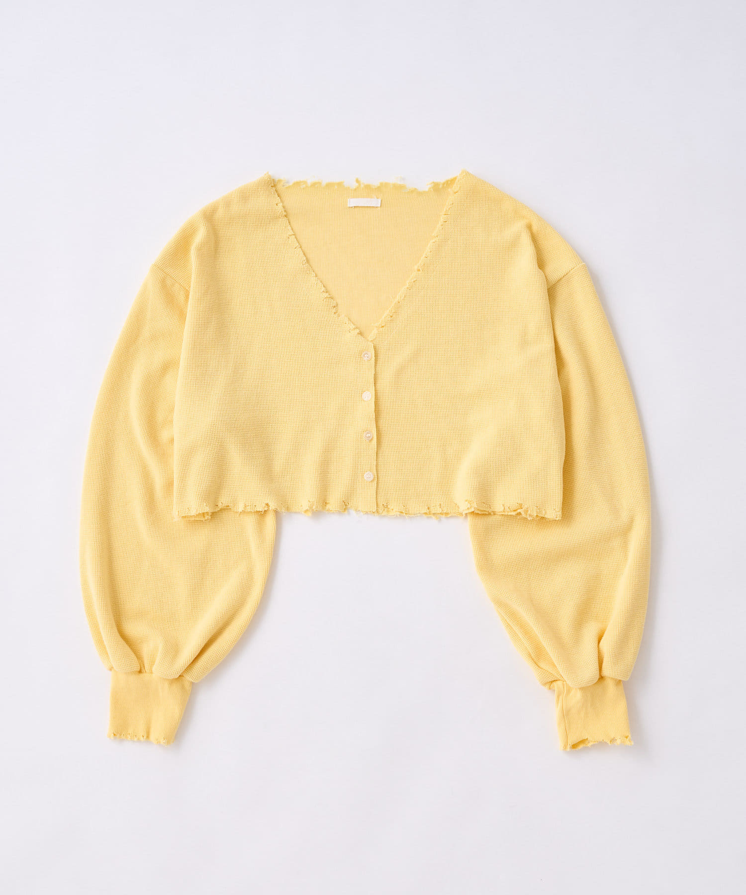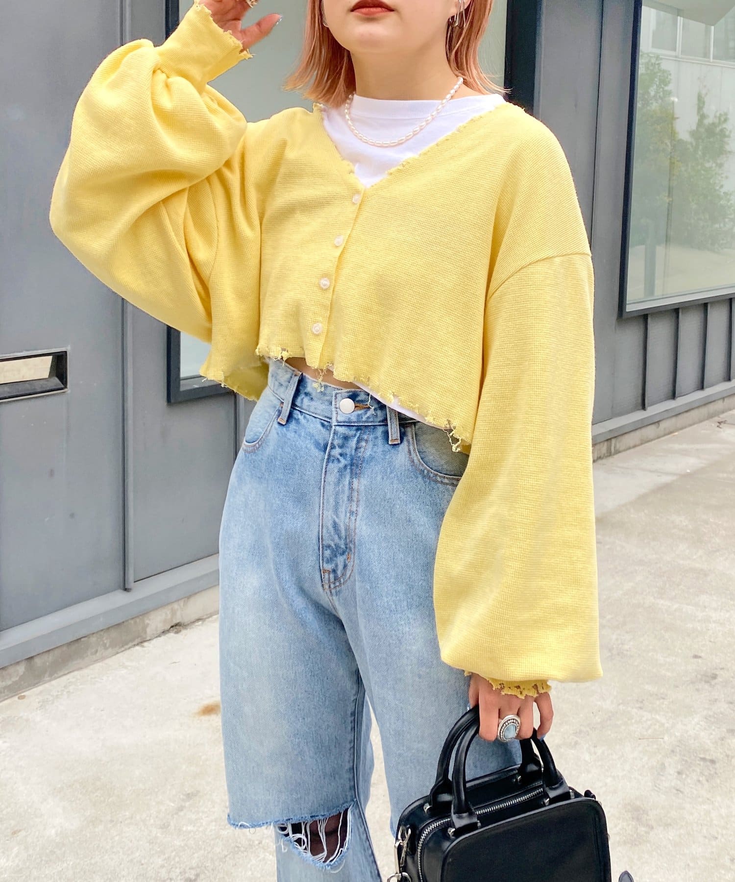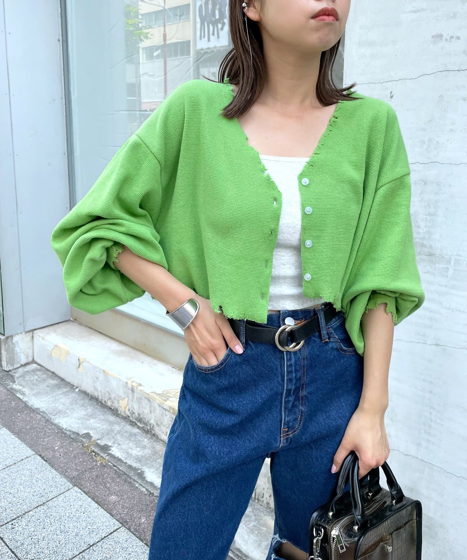ワッフル素材・袖のボリューム・ダメージ加工、可愛さ3点がギュギュっと詰まった薄手カーディガン
