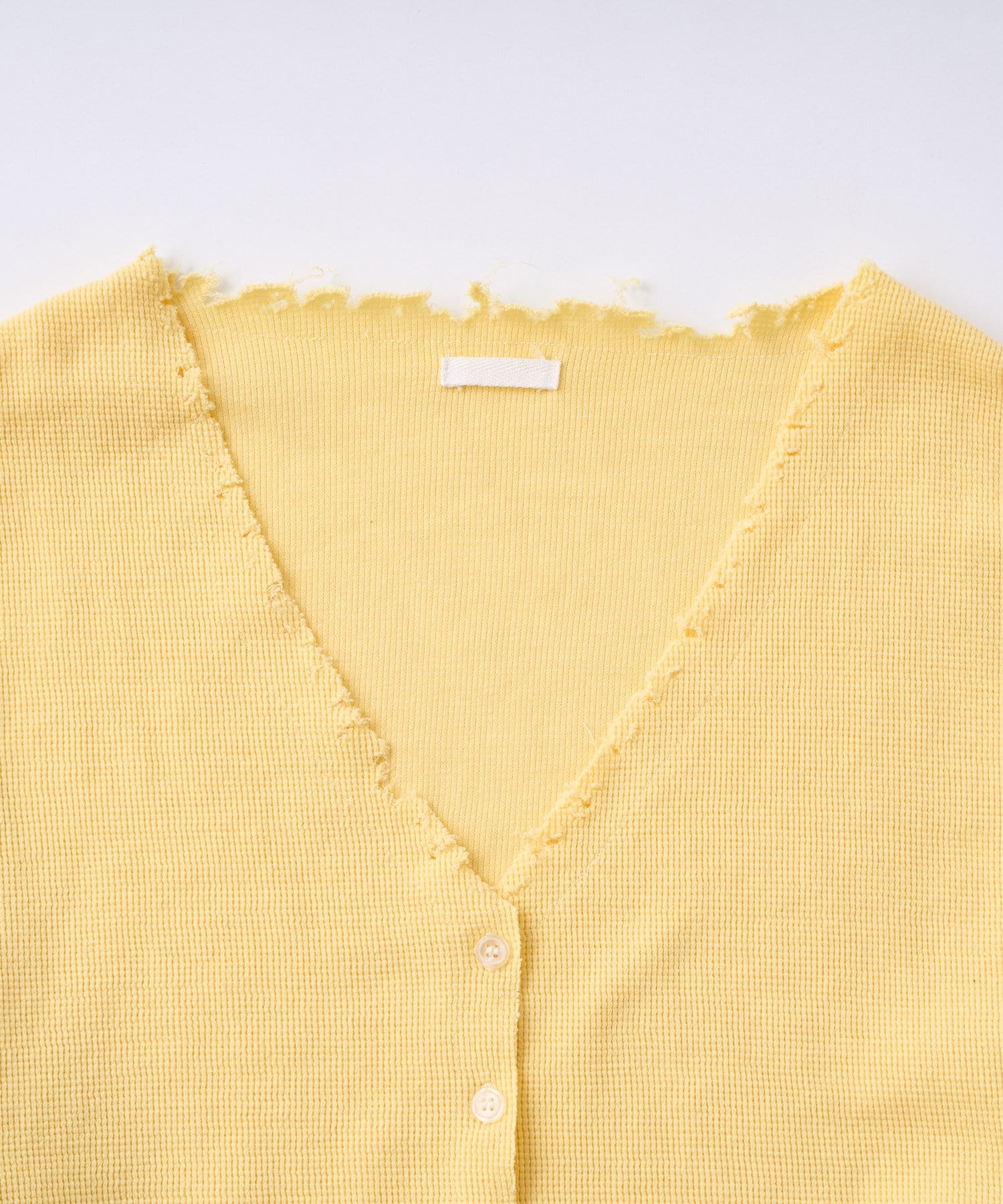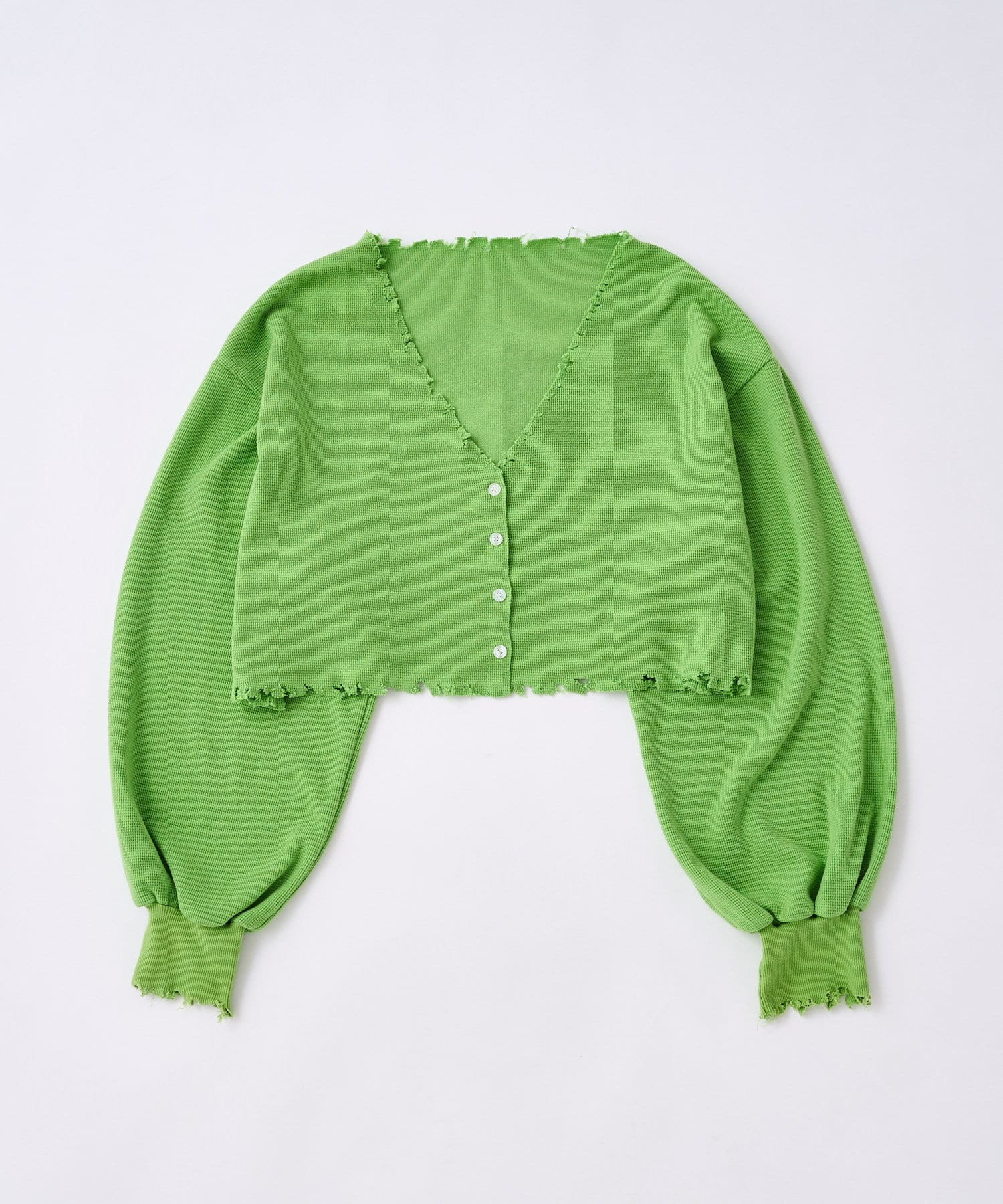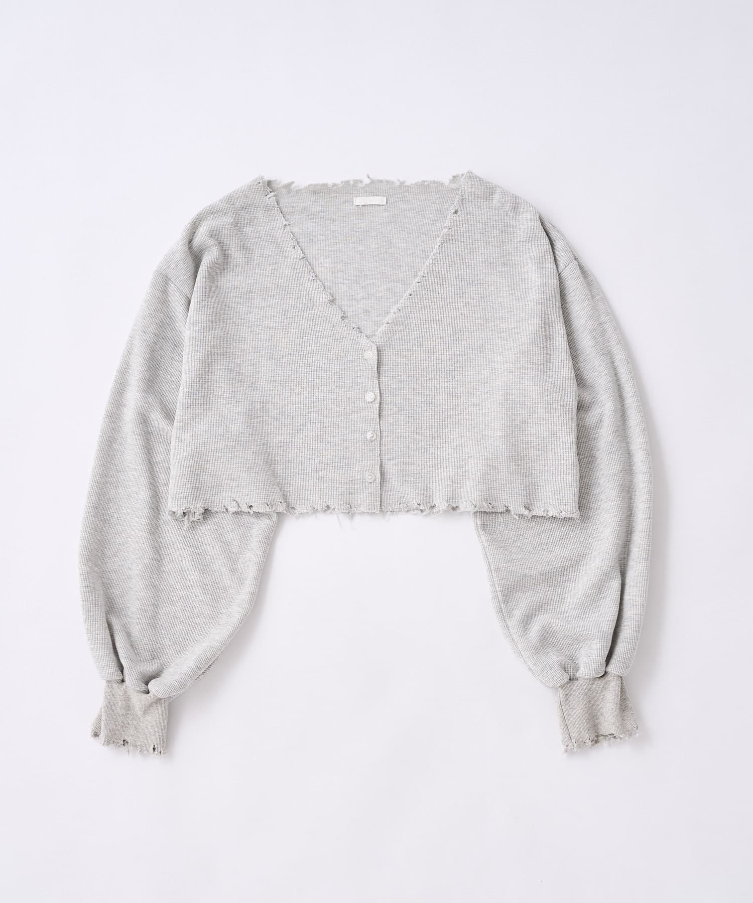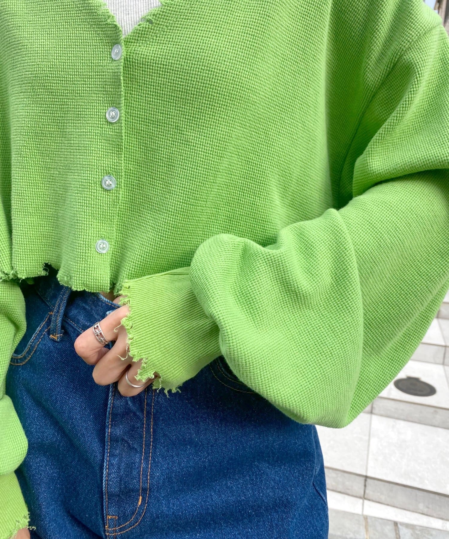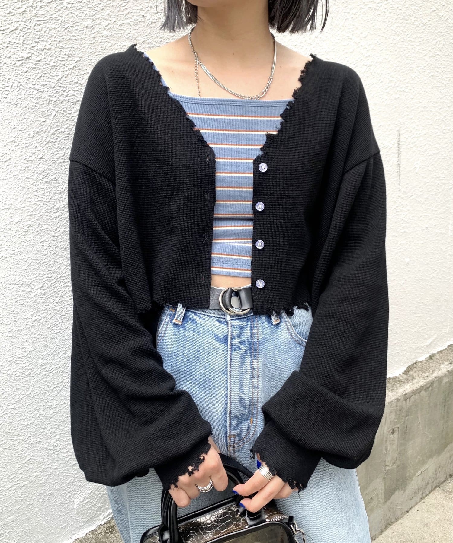 ワッフル素材・袖のボリューム・ダメージ加工、可愛さ3点がギュギュっと詰まった薄手カーディガン