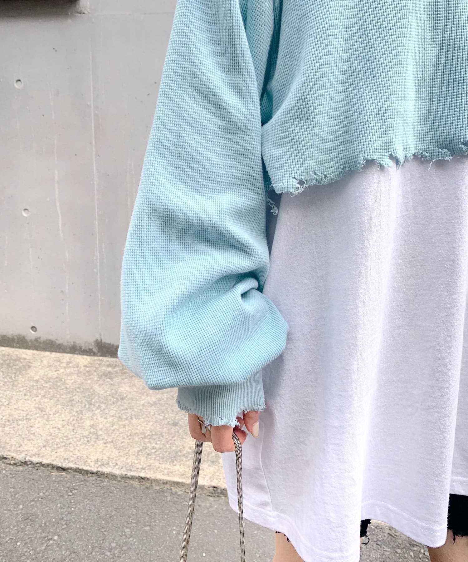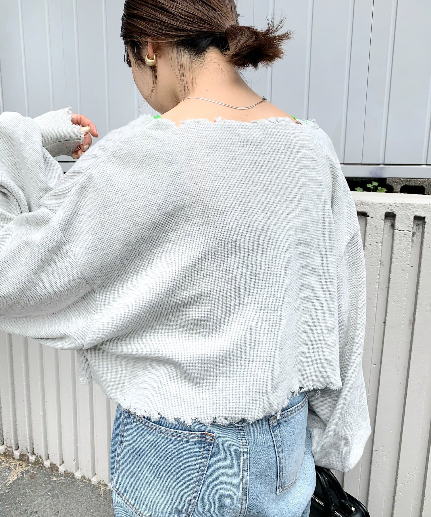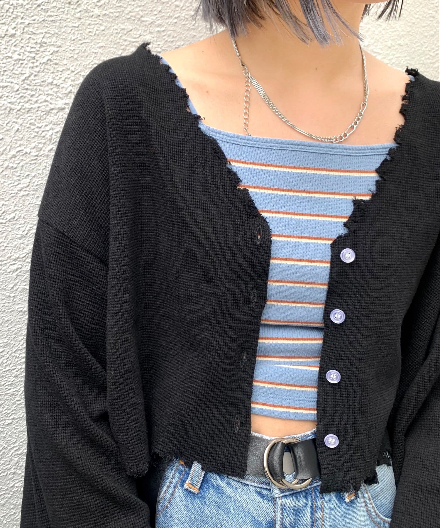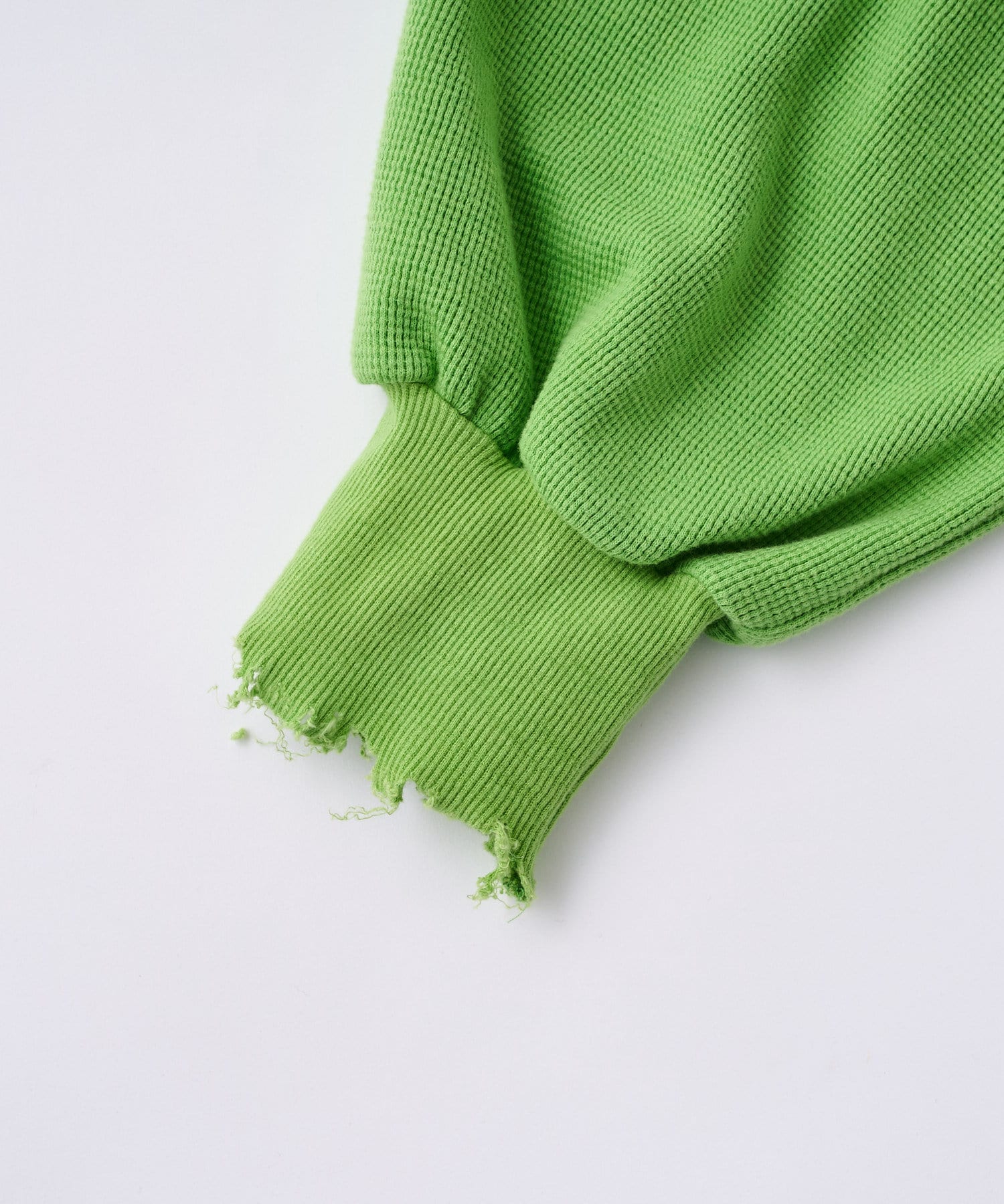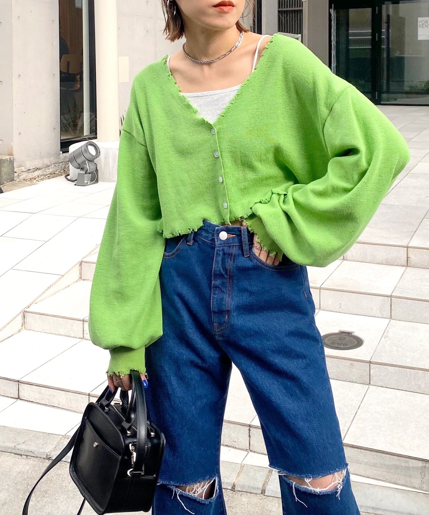 ワッフル素材・袖のボリューム・ダメージ加工、可愛さ3点がギュギュっと詰まった薄手カーディガン
