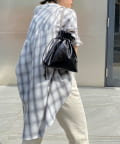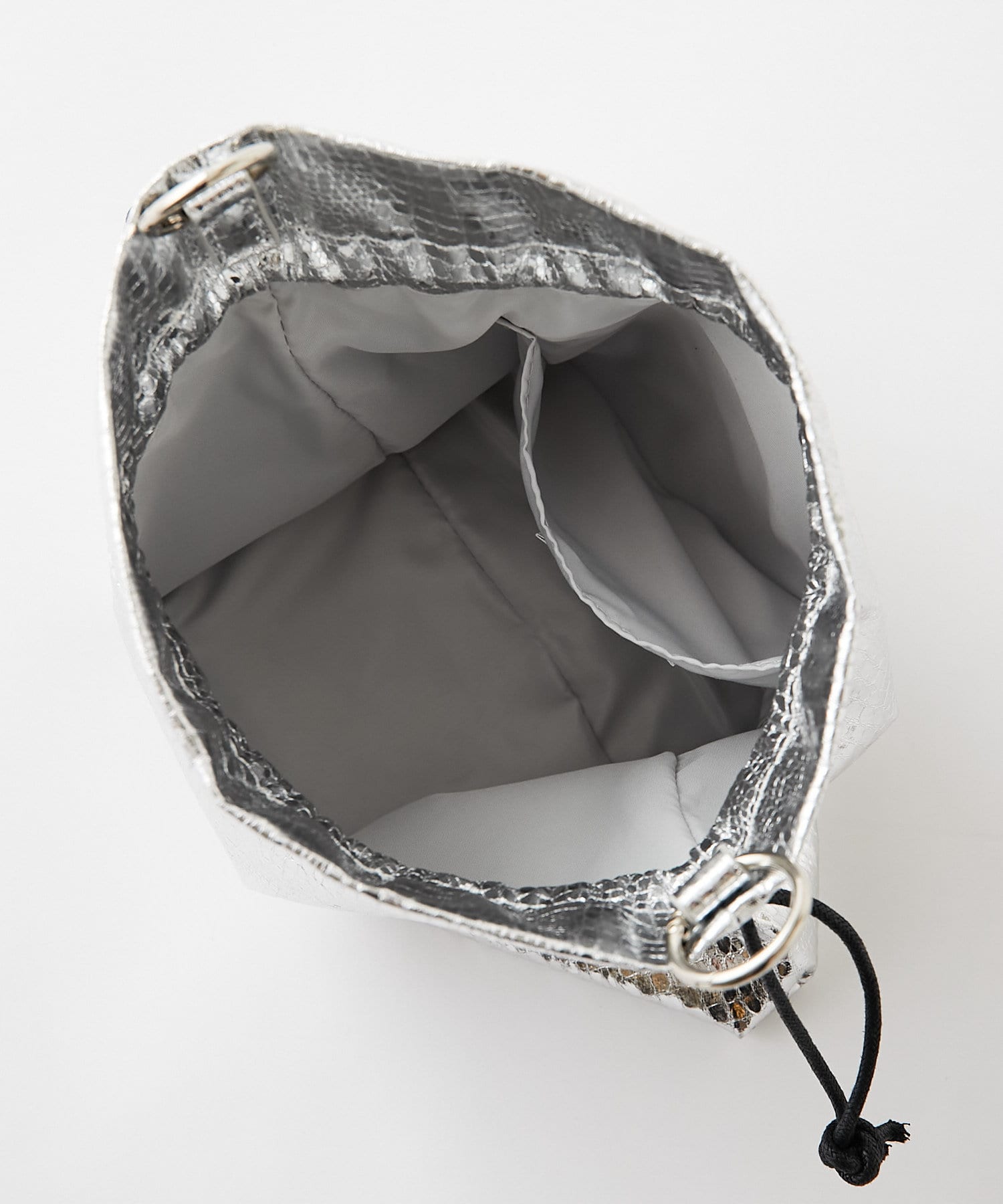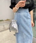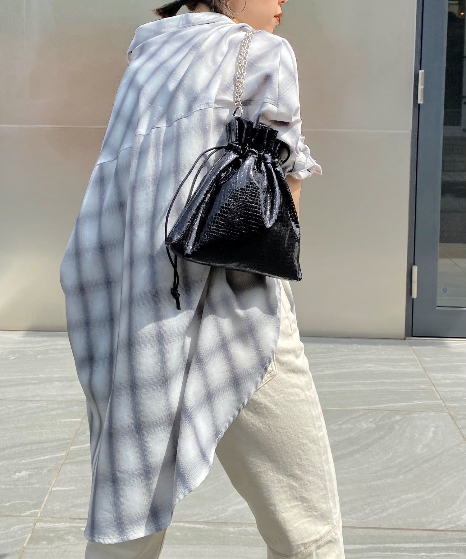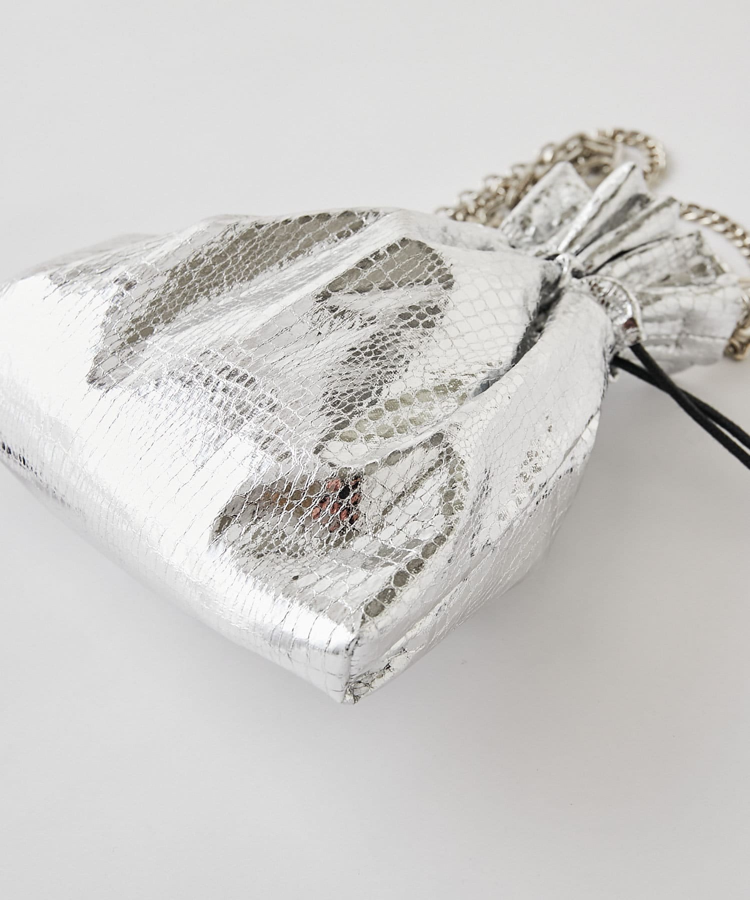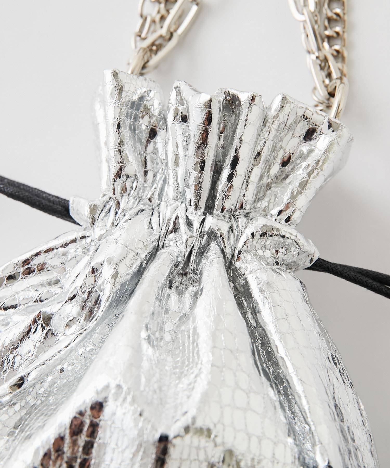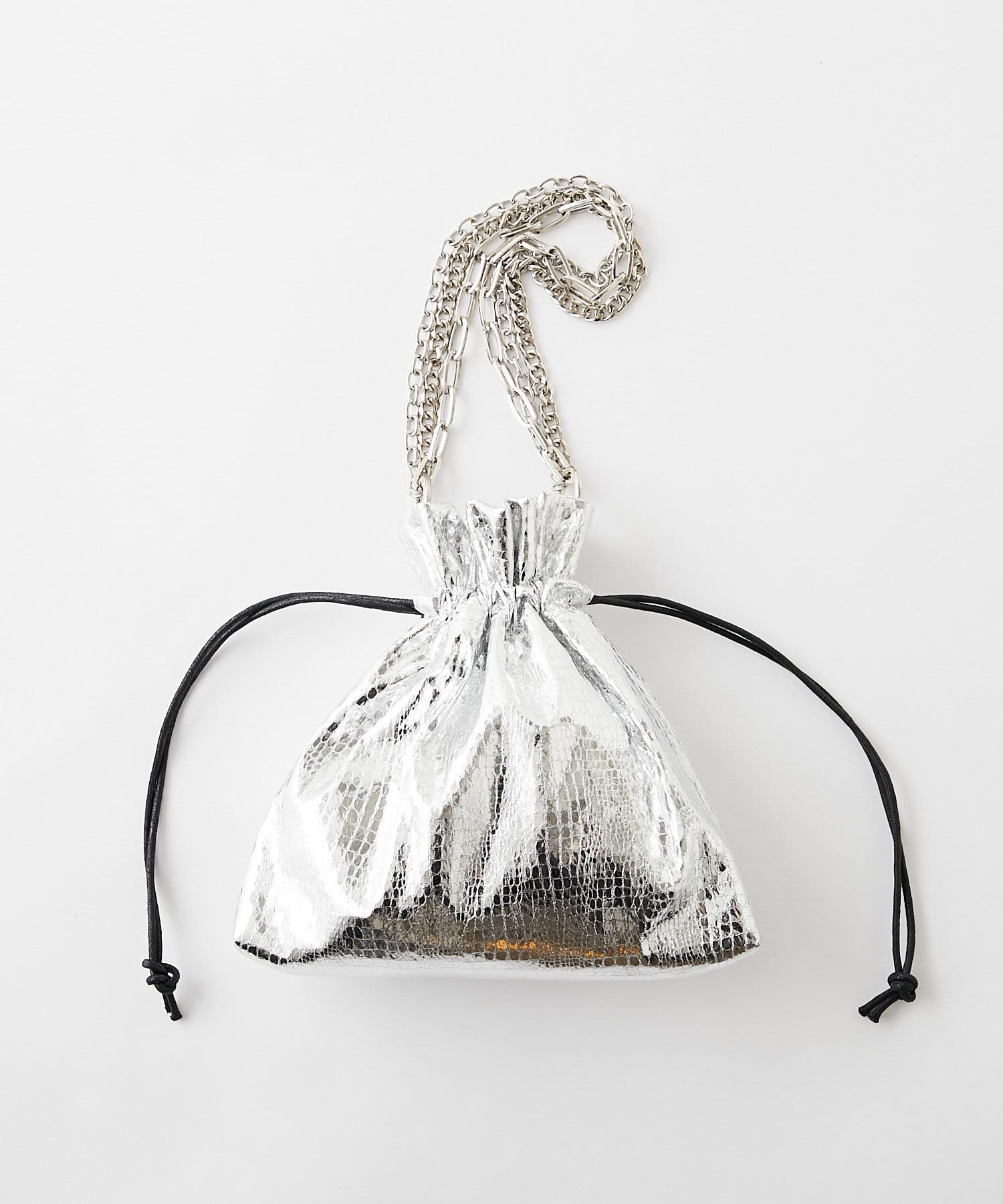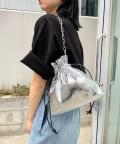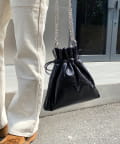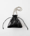 3タイプの異なるチェーンをお好みで。スタイリッシュな光沢感が目立つ巾着バッグ