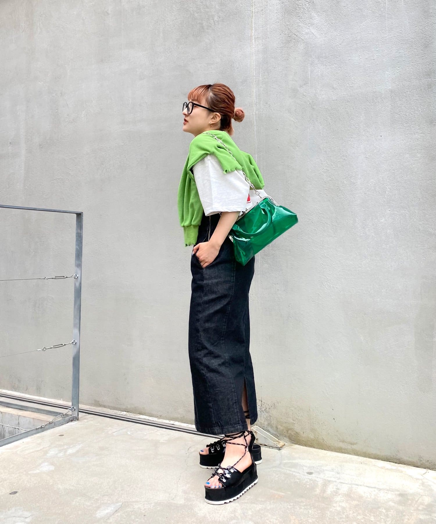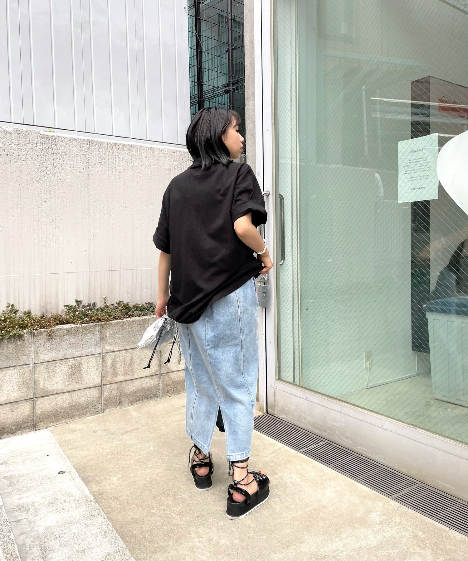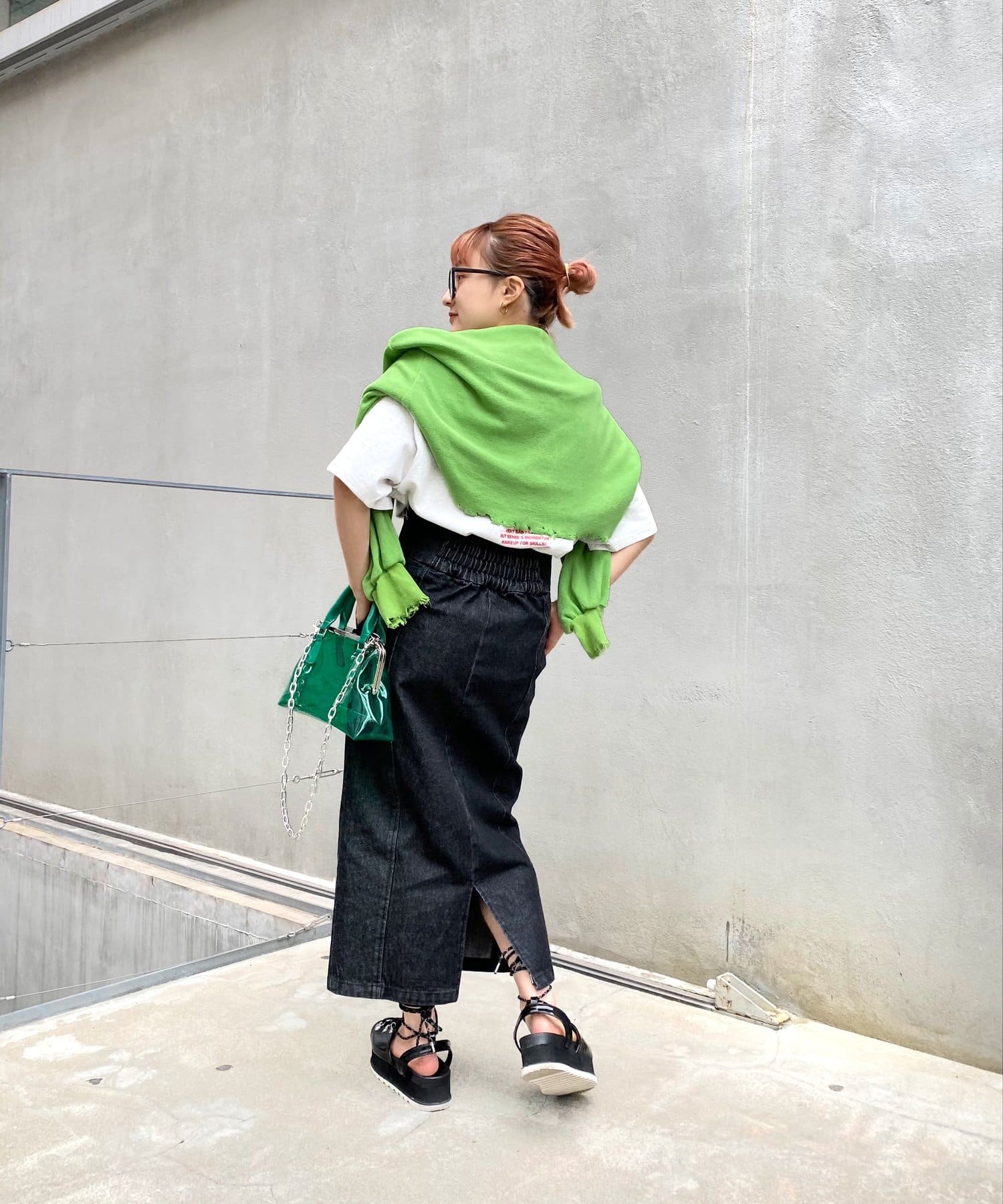・後ろのスリットにより、バックスタイルは素肌がチラ見え。程よい抜け感を生み出し、重くない雰囲気に。