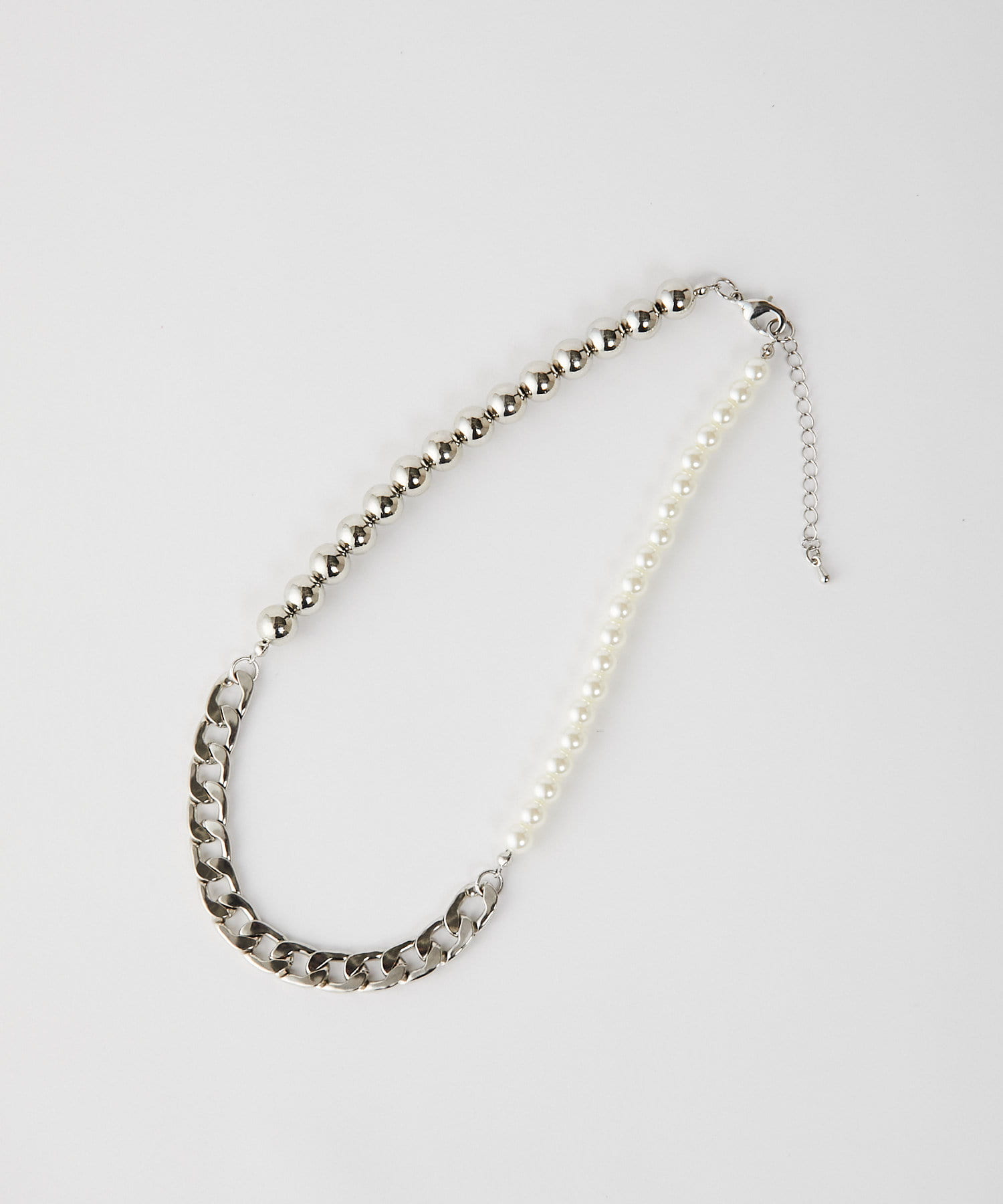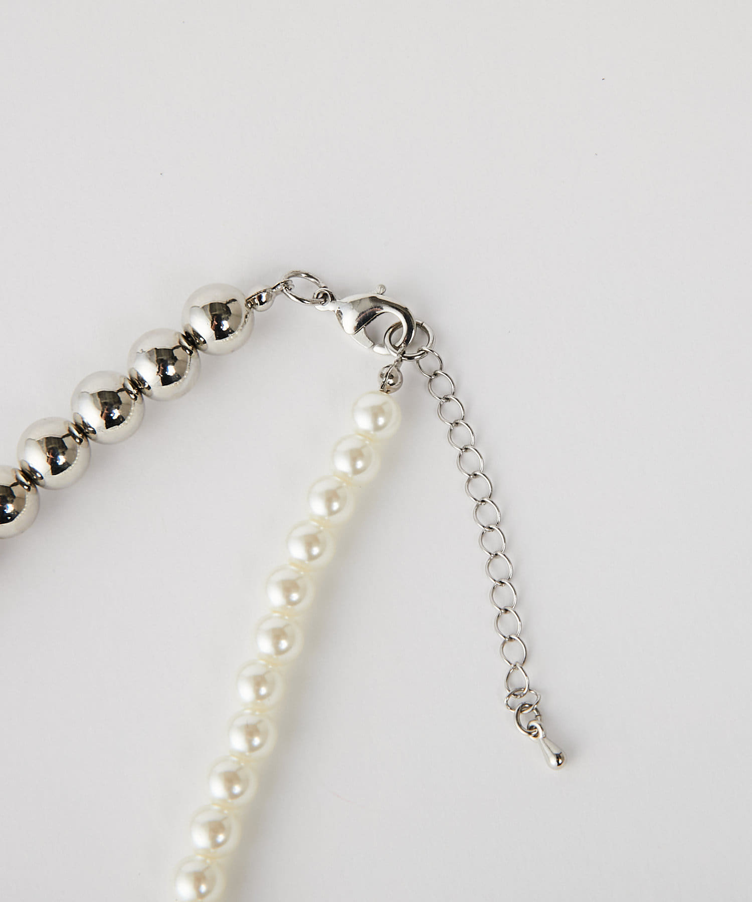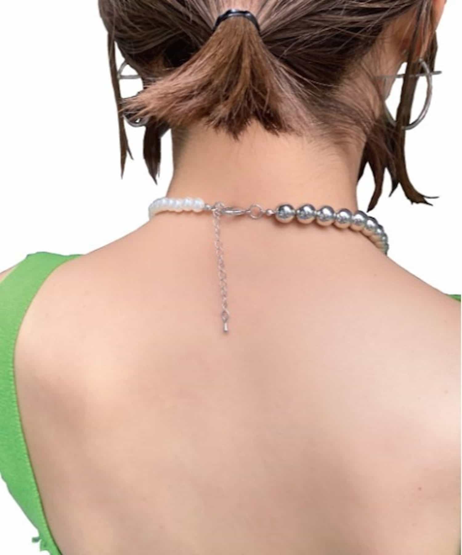 パール、シルバーボール、チェーンが連結した、個性的なネックレス。