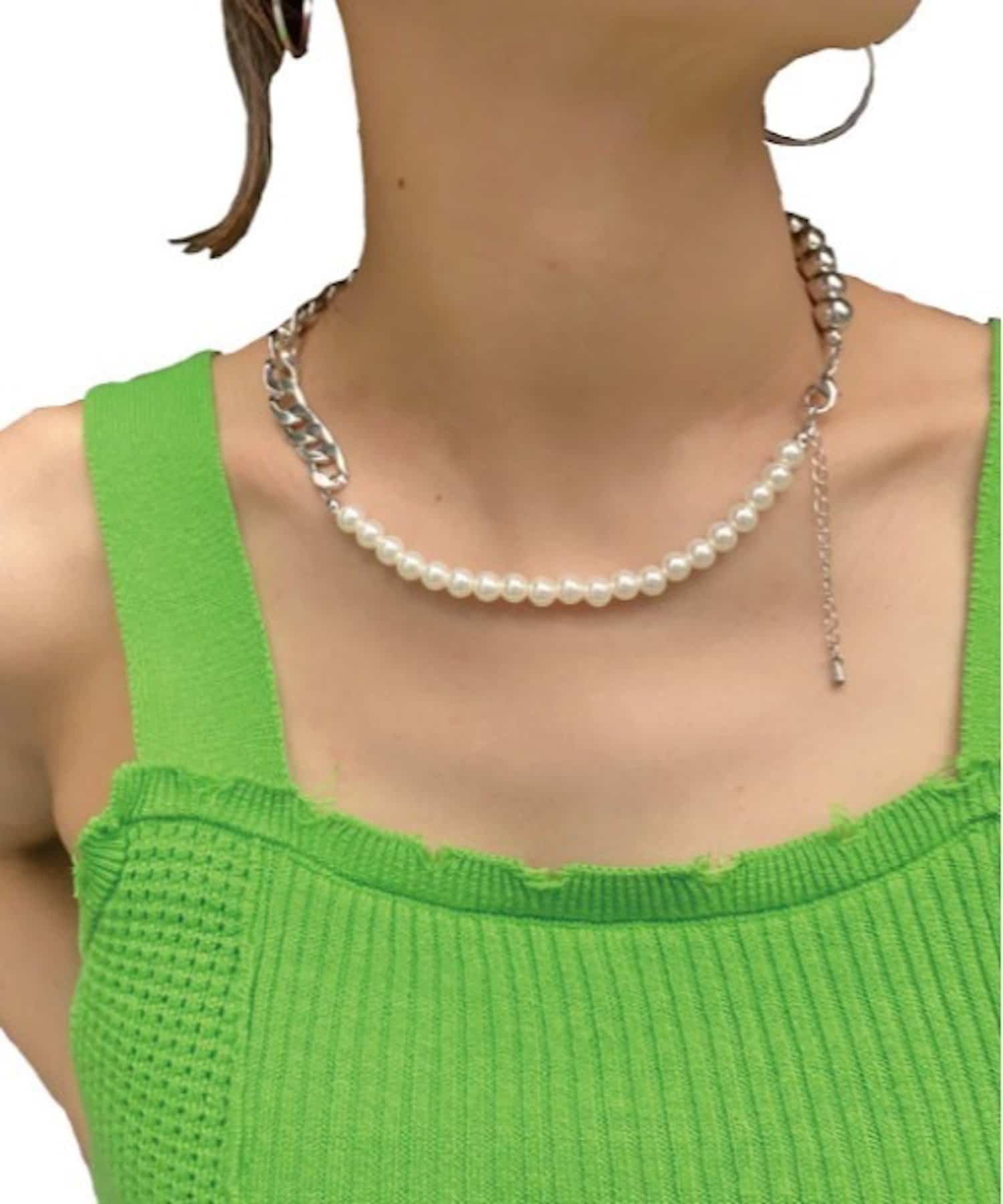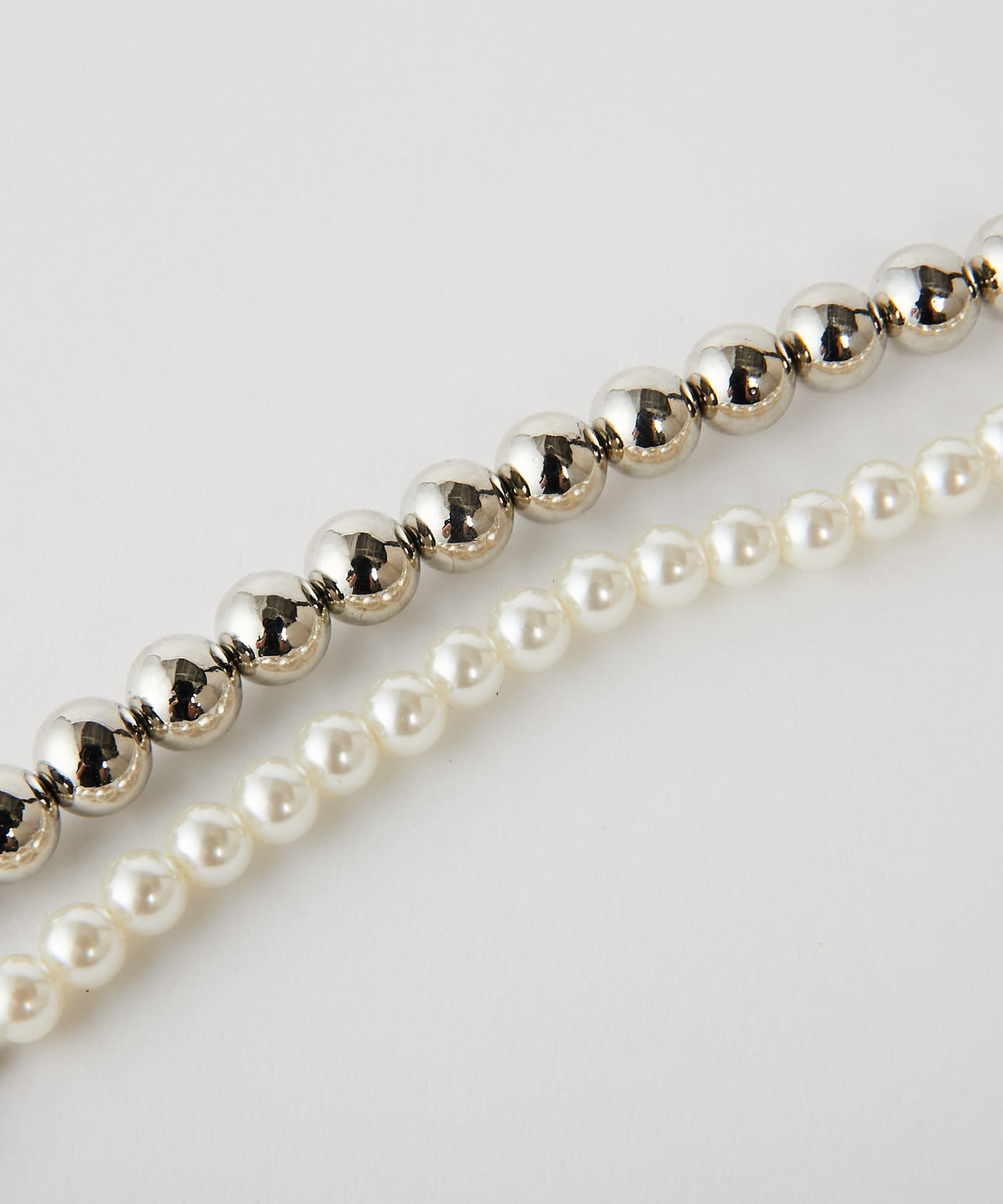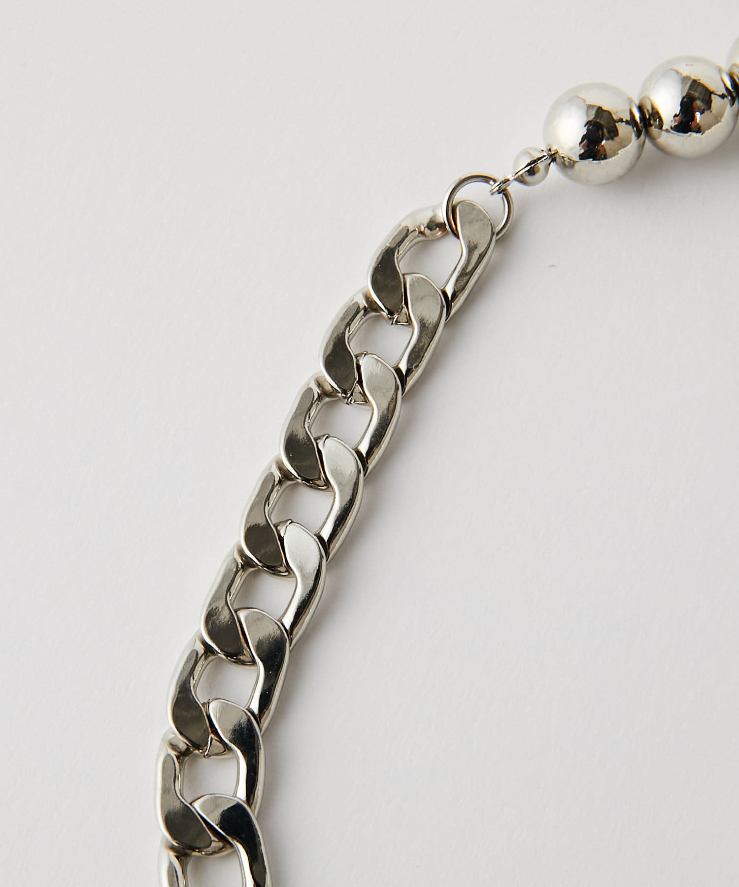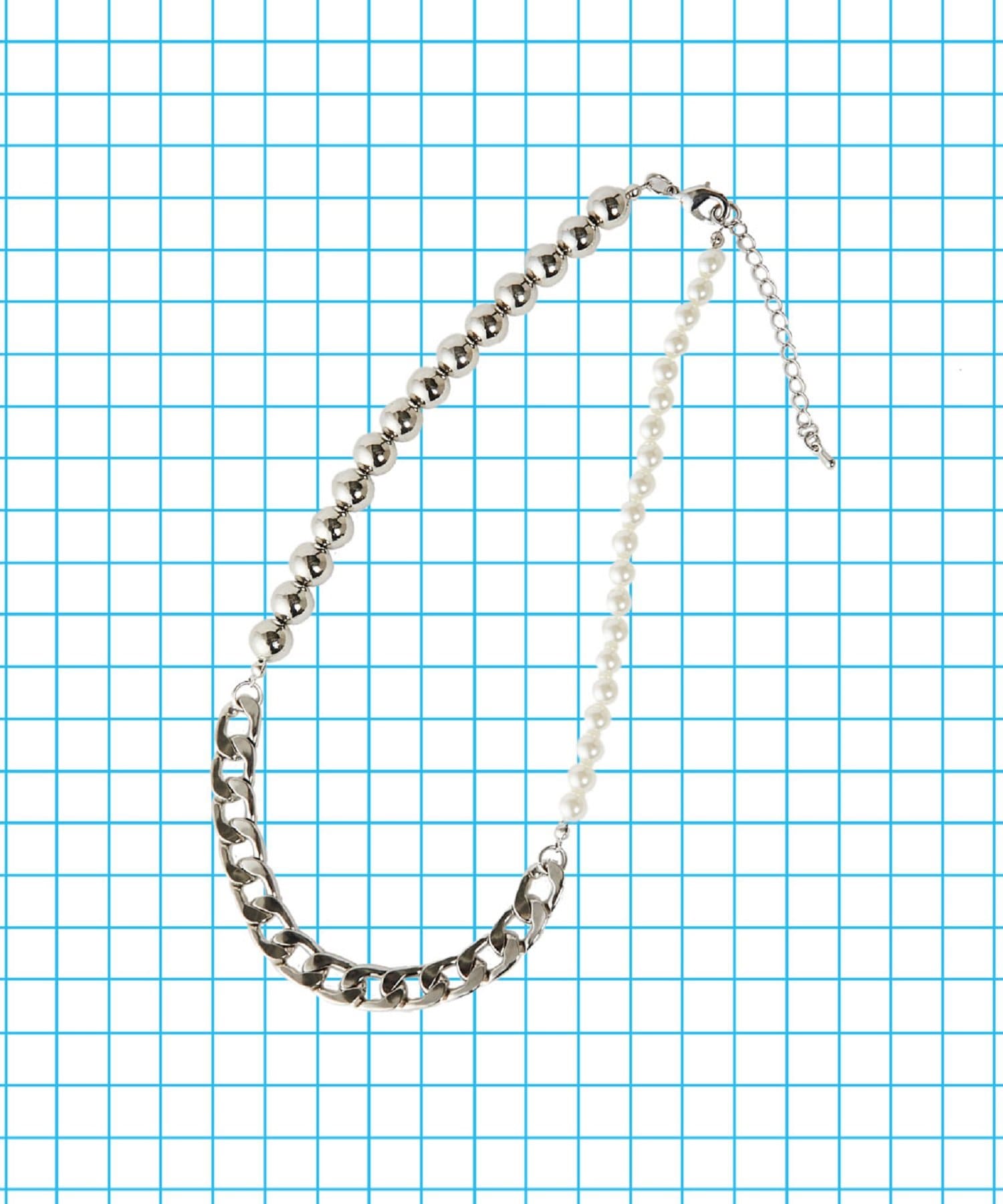 パール、シルバーボール、チェーンが連結した、個性的なネックレス。