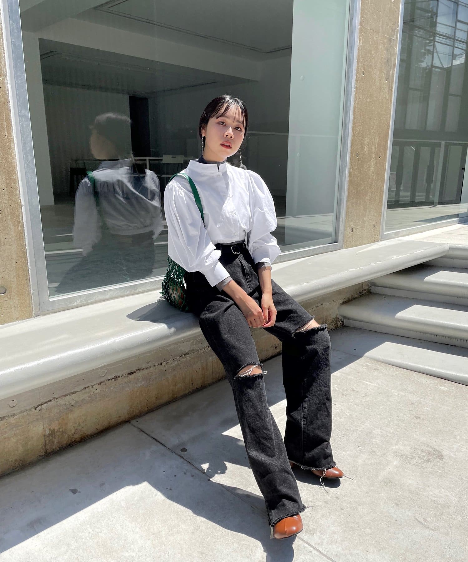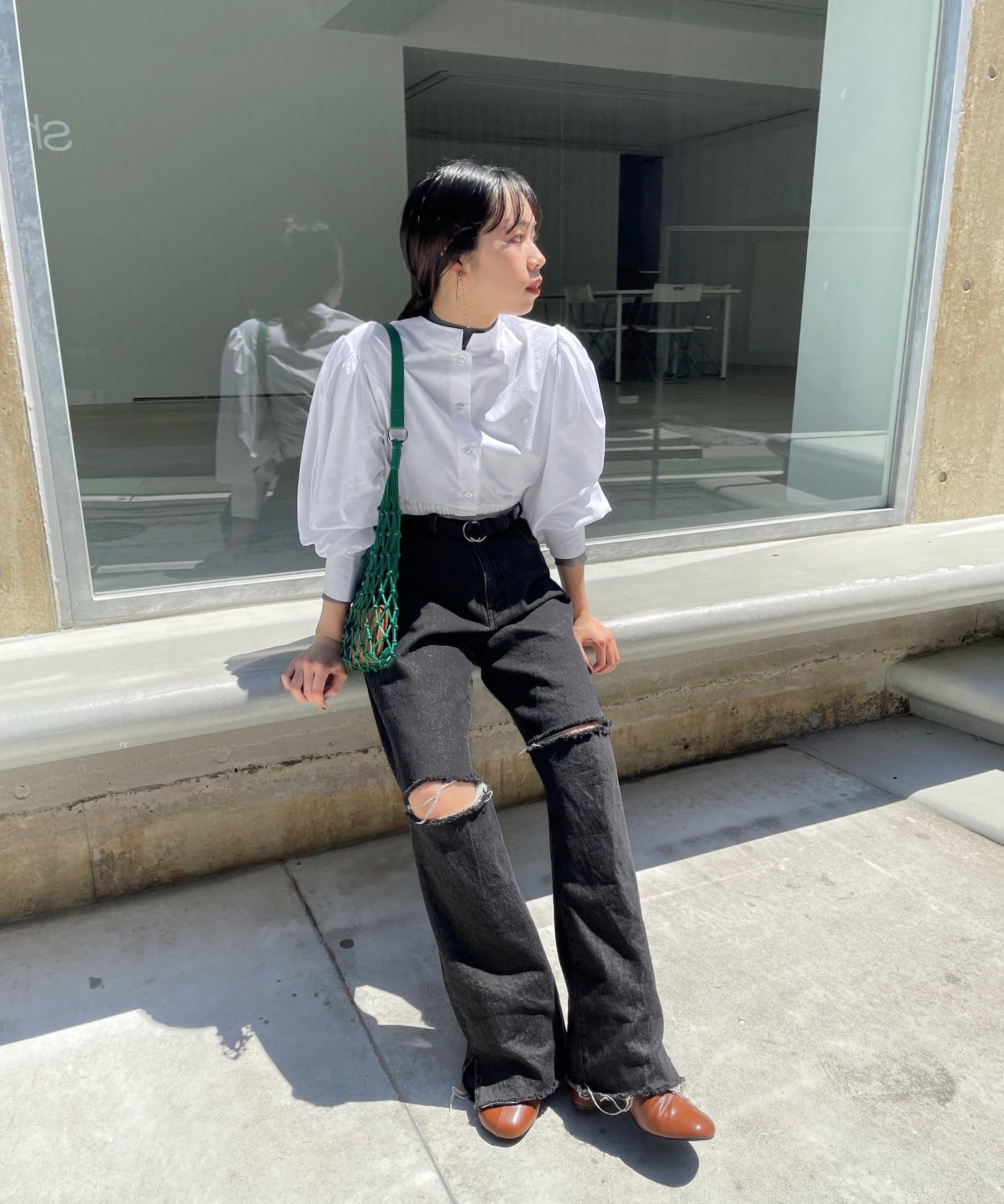 ・スタンドカラーなので、キメすぎないカジュアルなブラウススタイルを演出。サラっとした素材のボトムは勿論、デニムとの相性も◎。