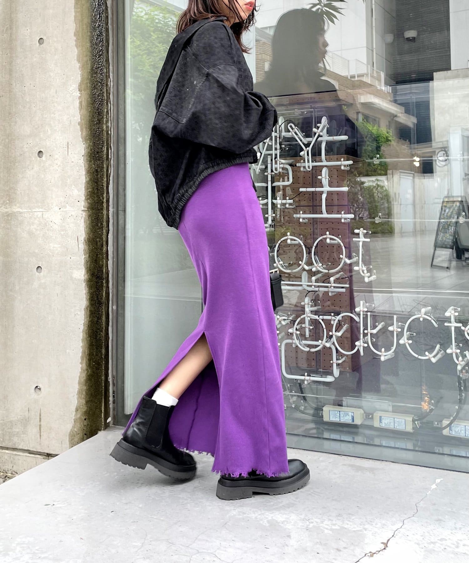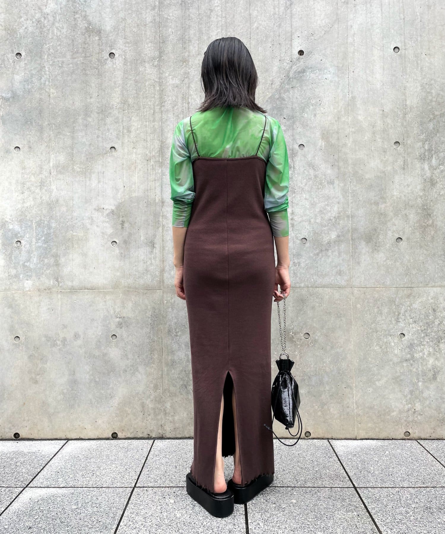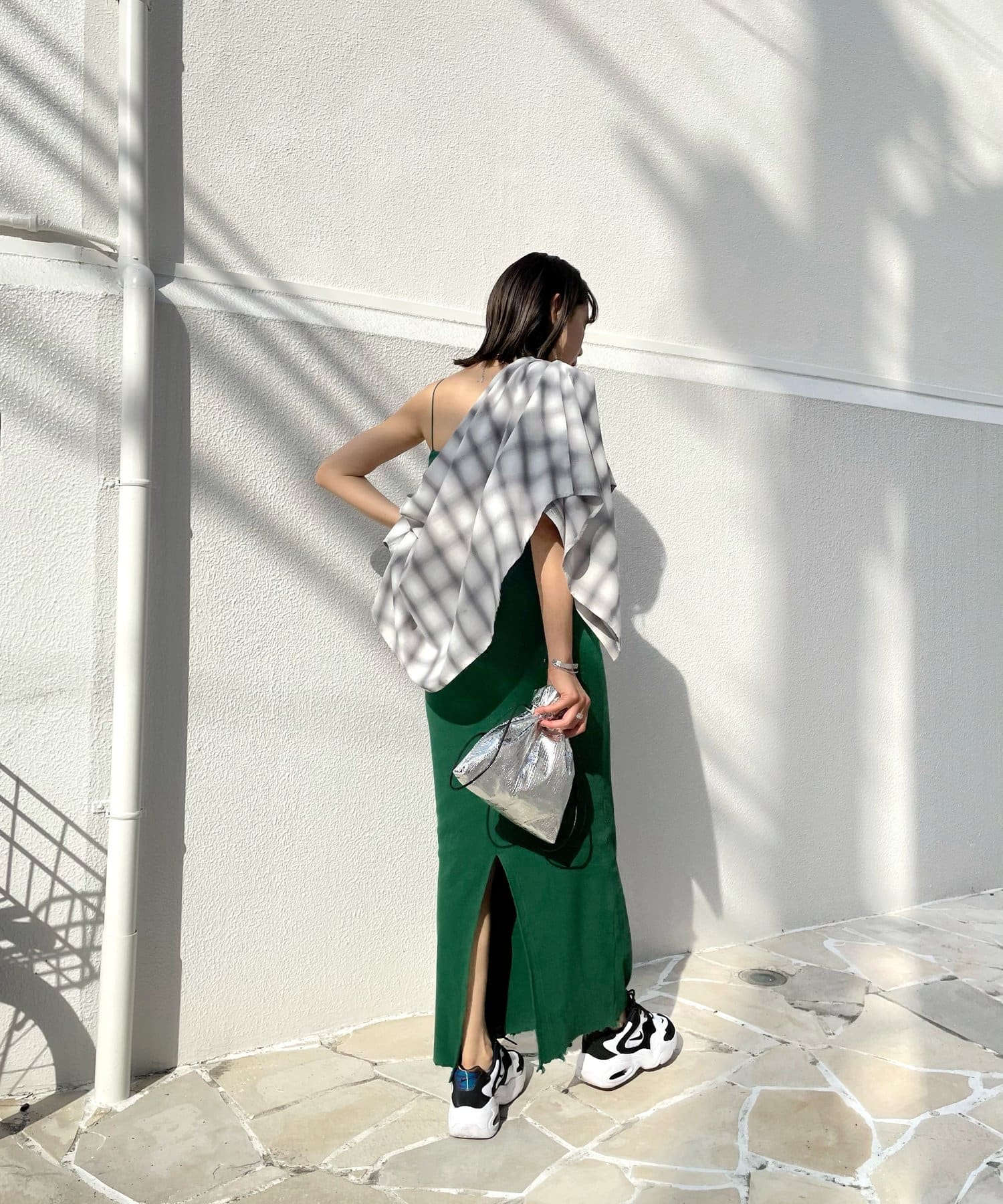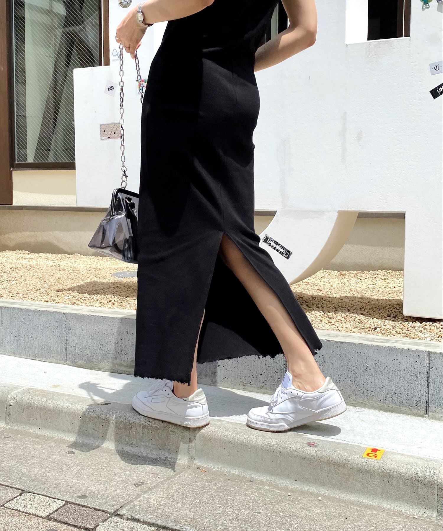 ・Iラインを強調する丈感が細身に魅せます。また、後ろのスリットによる肌見せで、抜け感をプラス。
