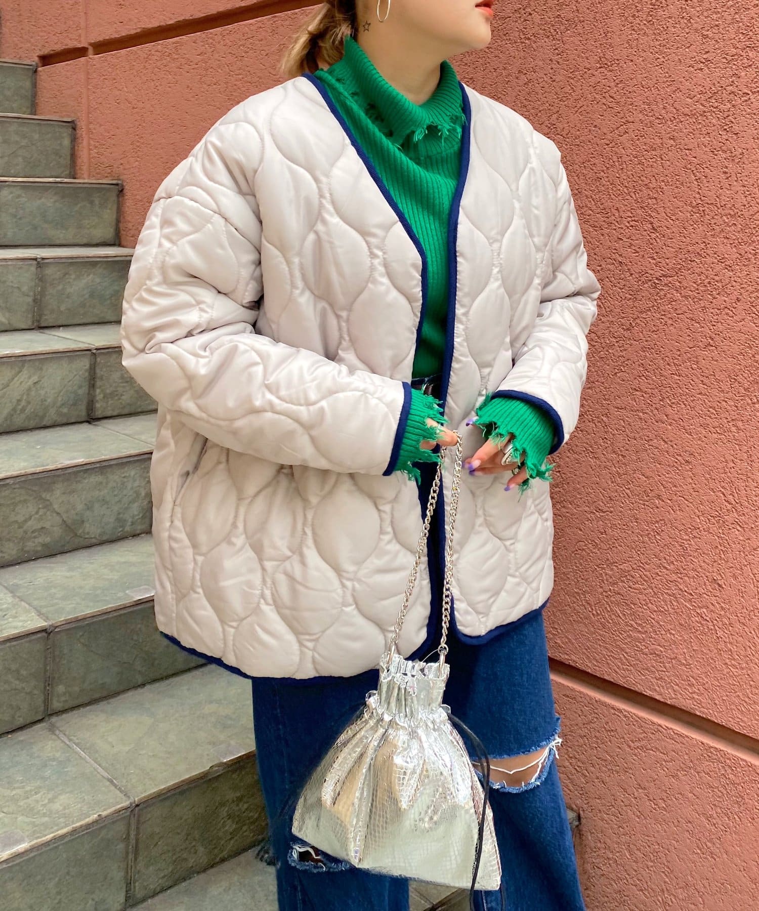 ・アウターの襟を寝かせ、ハイネックやタートルをチラ見せしたレイヤードスタイルも◎。