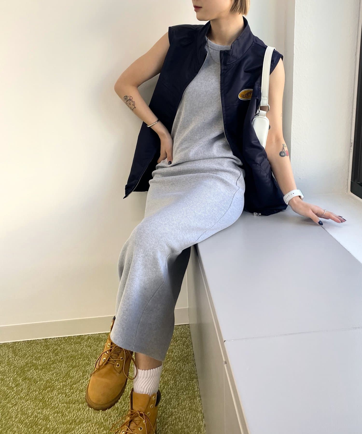 リブ素材で縦長効果◎。パット付きアメリカンスリーブワンピ