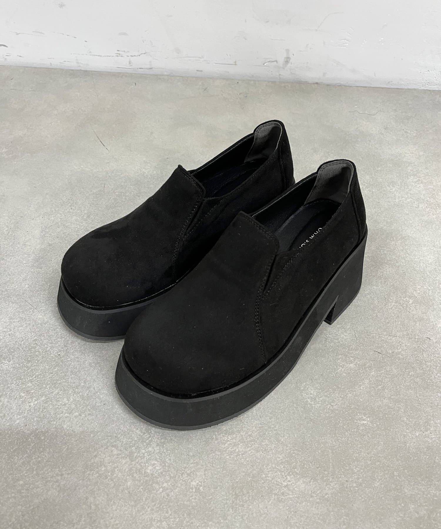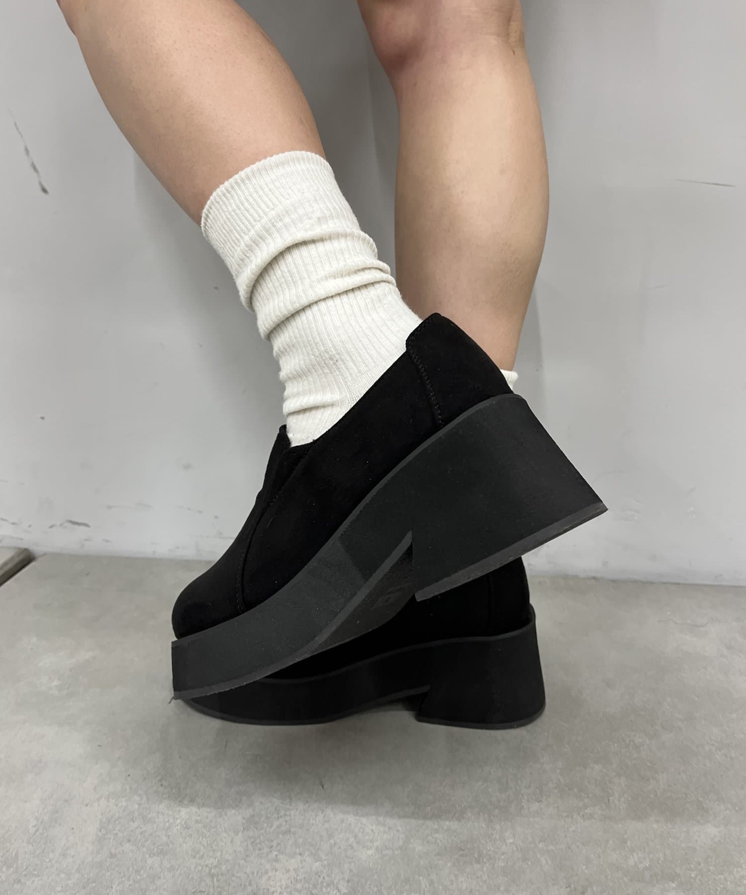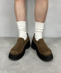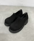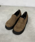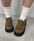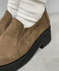 スエード素材で重みのある足元に。厚底で美脚効果◎