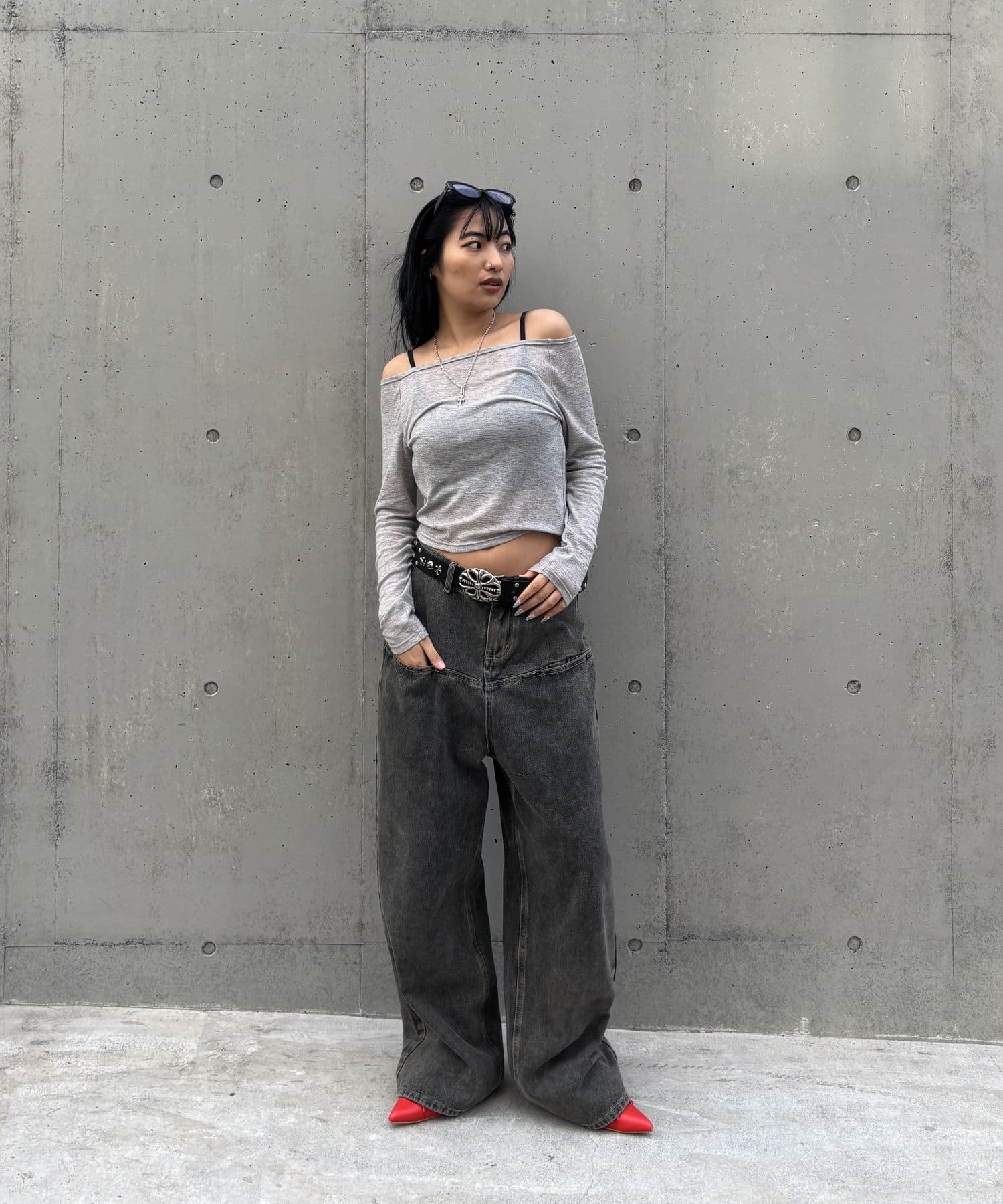 • 160cm/骨格ナチュラル/Sサイズ着用TOPS:スタッズワンオフショルニット